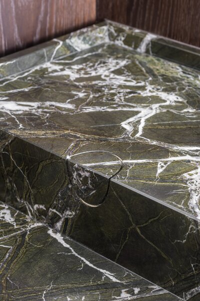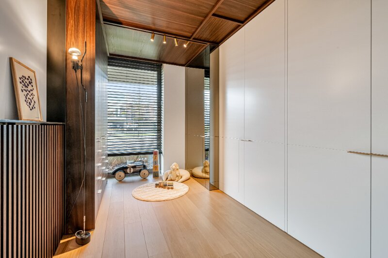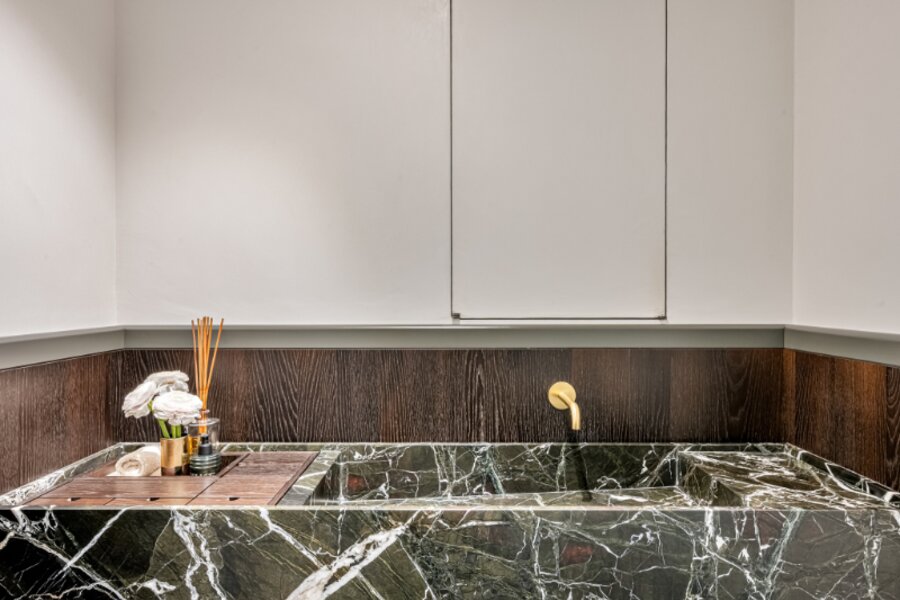De volledige inrichting werd exclusief ontworpen door Frederic Kielemoes en omvat maatwerkkasten van De Coene interior decoration en marmeren natuursteenelementen (Verde Levanto) van Potier Stone. De combinatie van hoogwaardige materialen, verfijnde details en tijdloze elegantie maakt dit appartement werkelijk uniek.