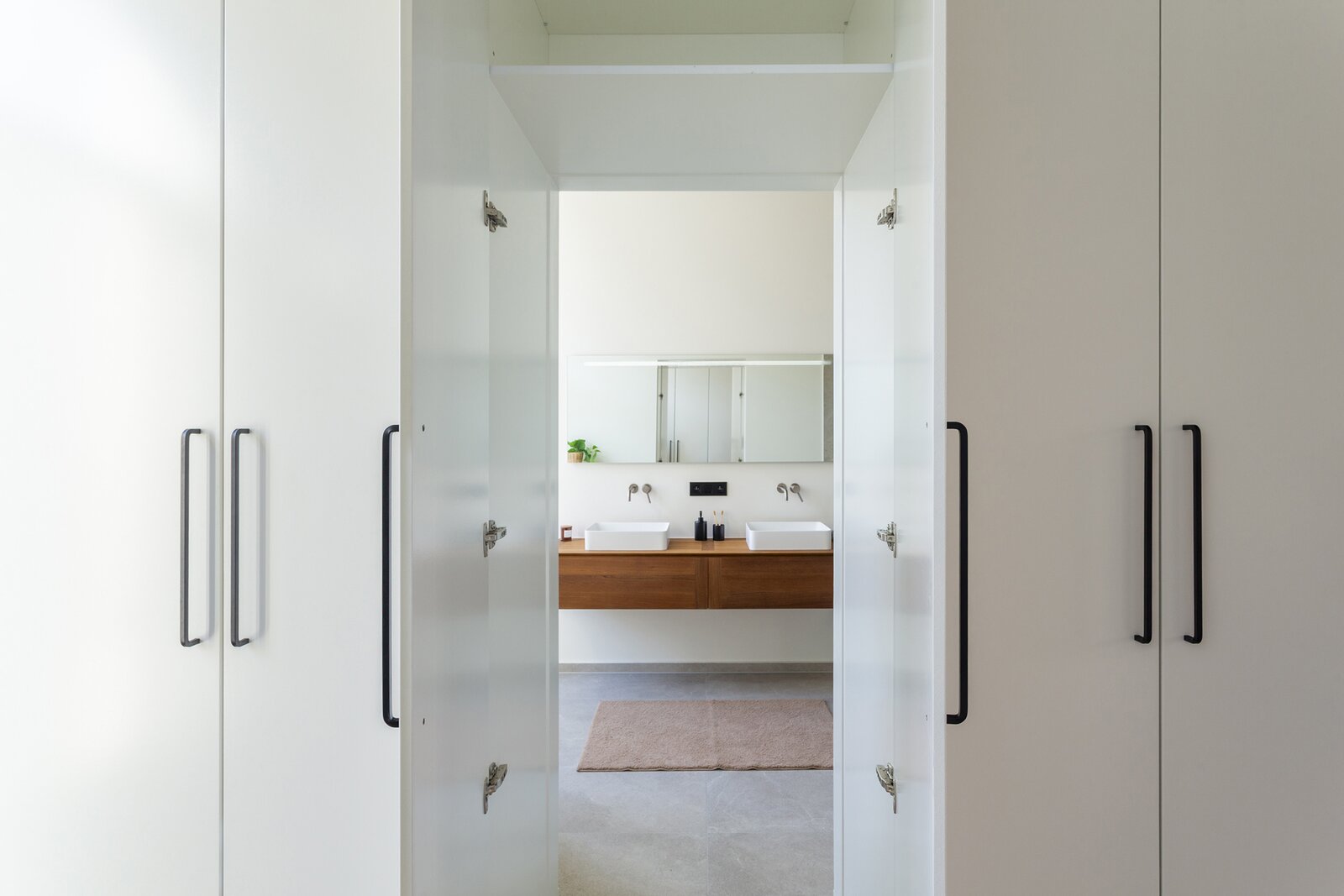 Op de eerste verdieping bevindt zich een royale master bedroom die indruk maakt door haar lichtinval, hoge plafonds en directe toegang tot een privé terras. Aansluitend vindt u een ruime dressing en een magnifieke ensuite badkamer met dubbele lavabo, toilet en een royale inloopdouche, een ware hotelsuite-ervaring.
