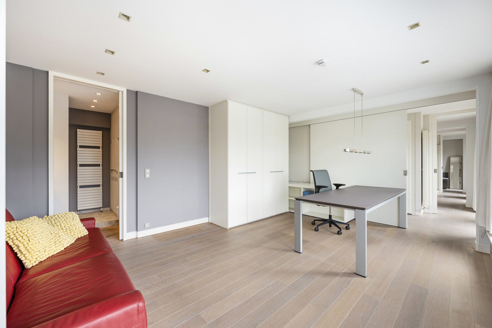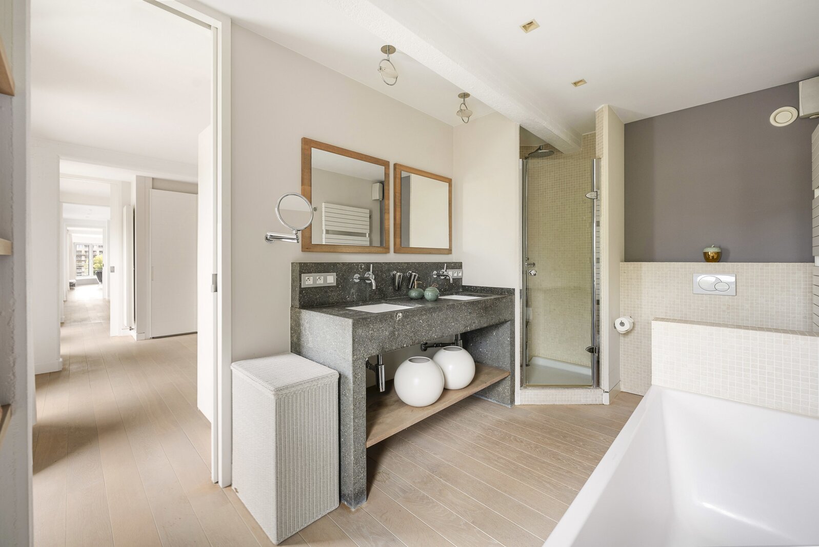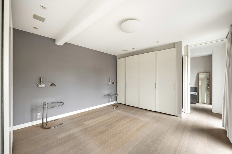 The enormously wide living space with beautiful parquet and panoramic view of the marina immediately catches the eye. There is contact with the water from all corners of the room. An extremely luxuriously fitted kitchen with a marble worktop with induction hob, built-in coffee machine, oven, microwave, steam oven, warming drawer and wine cooler. All cabinets are made in Wengé. Spacious utility room with fitted cupboard wall / laundry room.