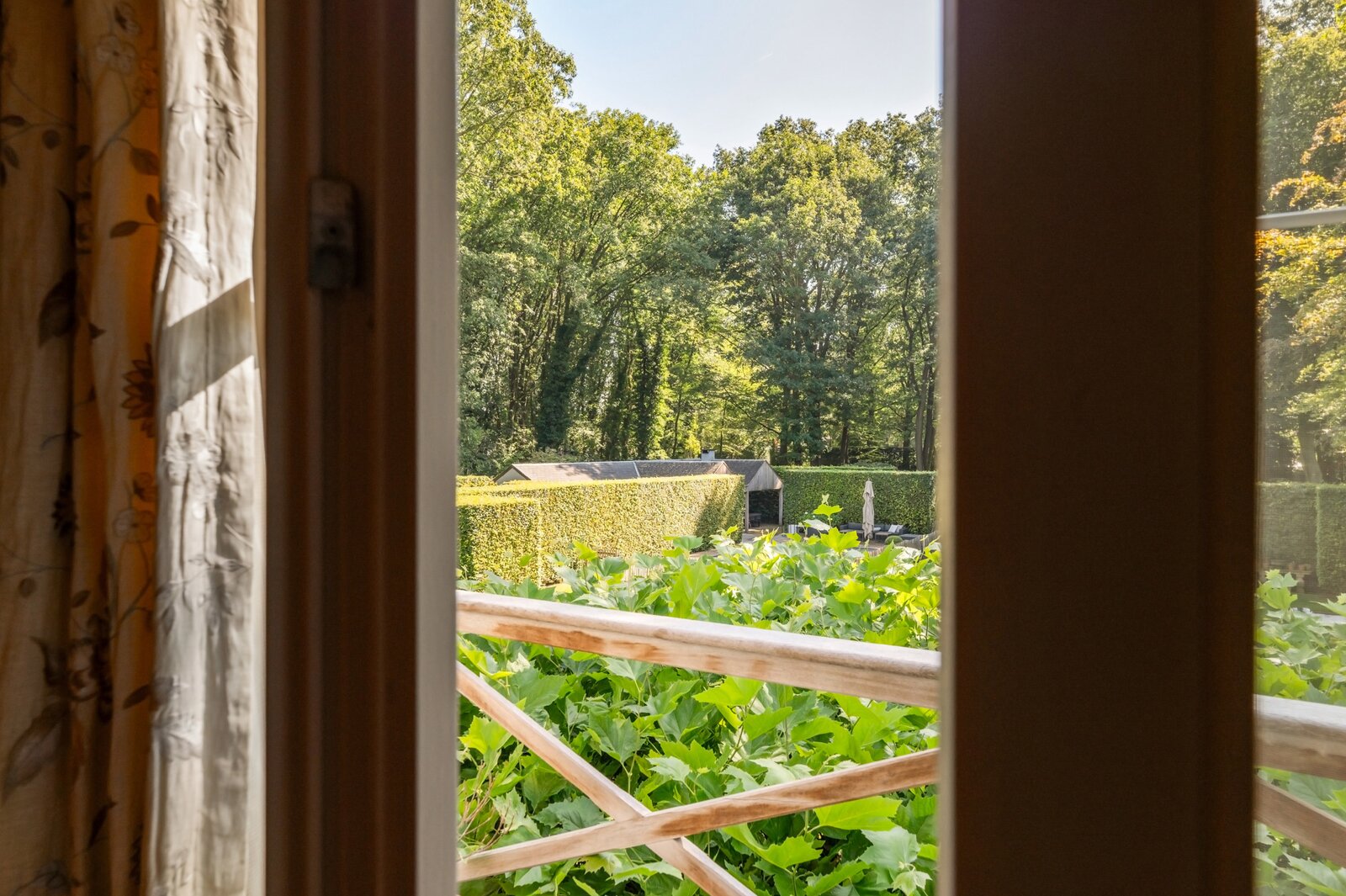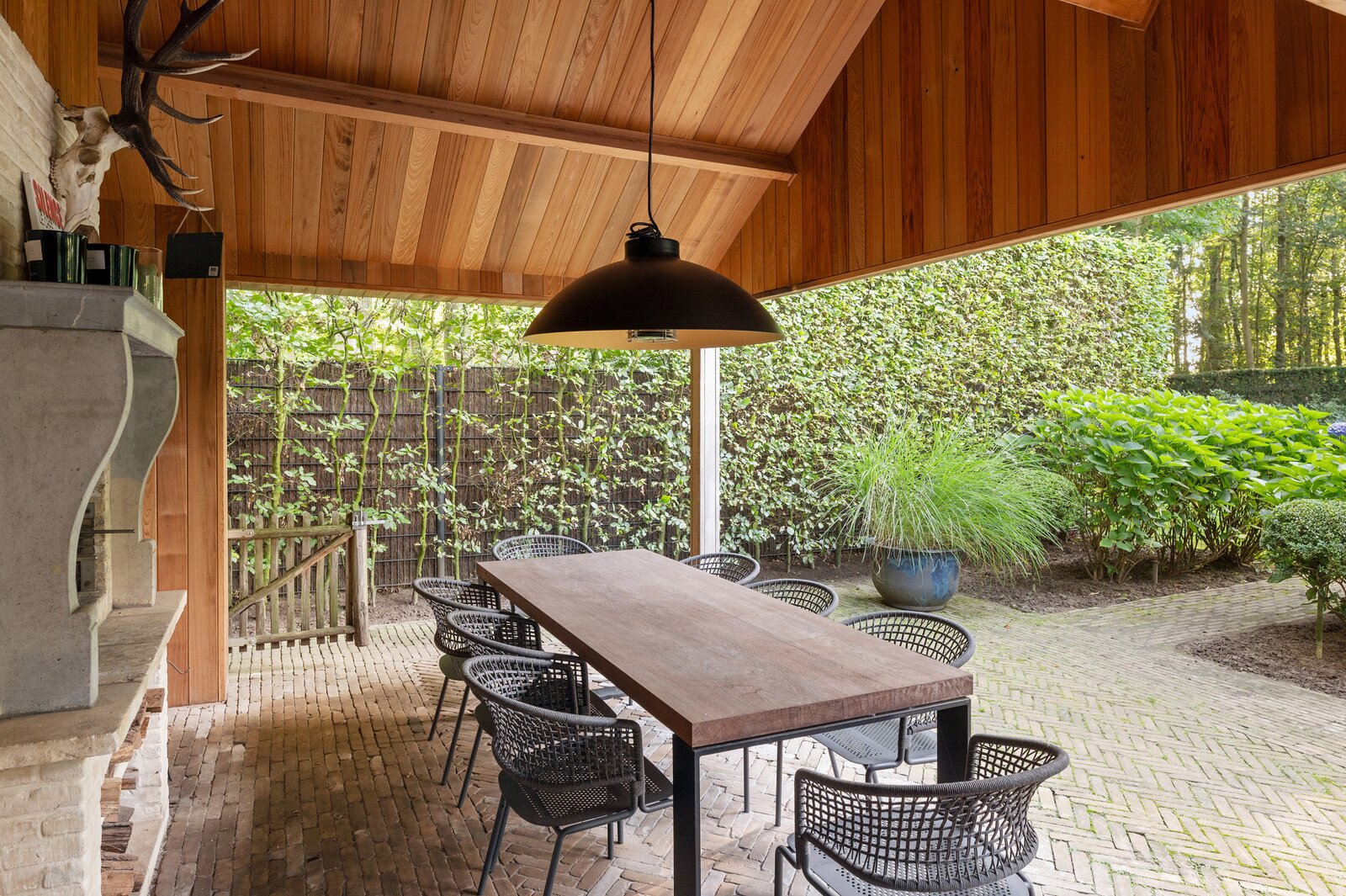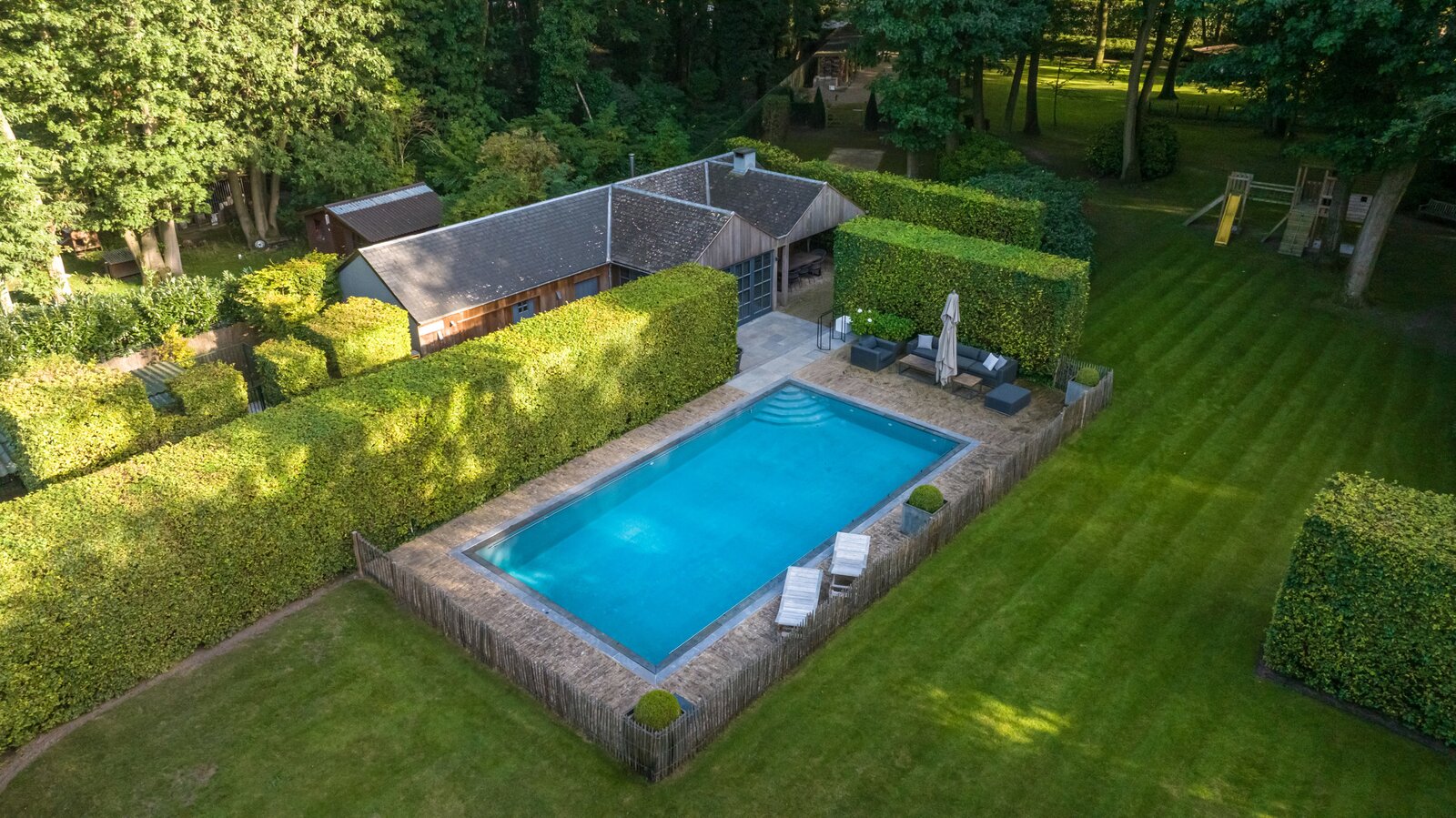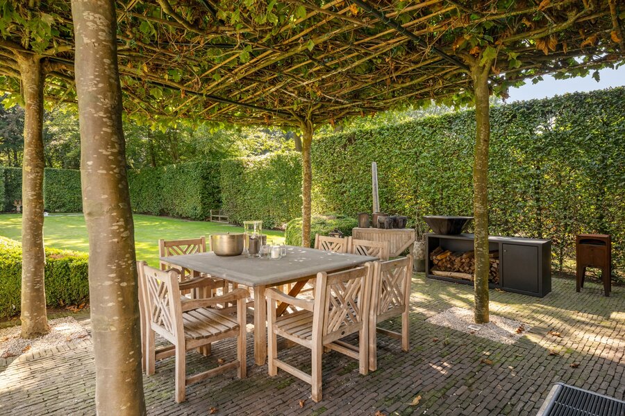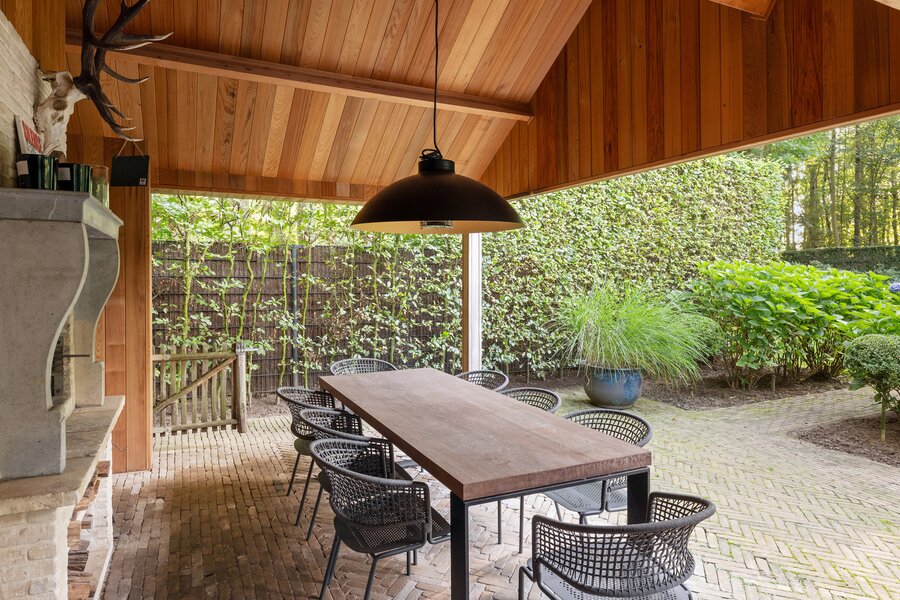 De prachtig aangelegde tuin creëert een oase van rust. Mooie voortuin met voldoende ruimte om te parkeren. Japans geïnspireerde zijtuin met moderne vijver. Terras onder de wijnranken die voor afkoeling zorgen op hete zomerdagen. Zonneterras pal op het zuiden. Wijds gazon en veel hagen en hoekjes ideaal voor kinderen om te ravotten. Enorm veel privacy en discretie door de hoge hagen en de volwassen bomen. Heerlijk genieten van het zwembad in de zomer, met tuinfeestjes in het poolhouse dat uitgerust is met een keuken, douche, toilet, kleedkamers, sauna, veranda, overdekt terras met open haard/bbq, een aparte opbergruimte en technische ruimte.