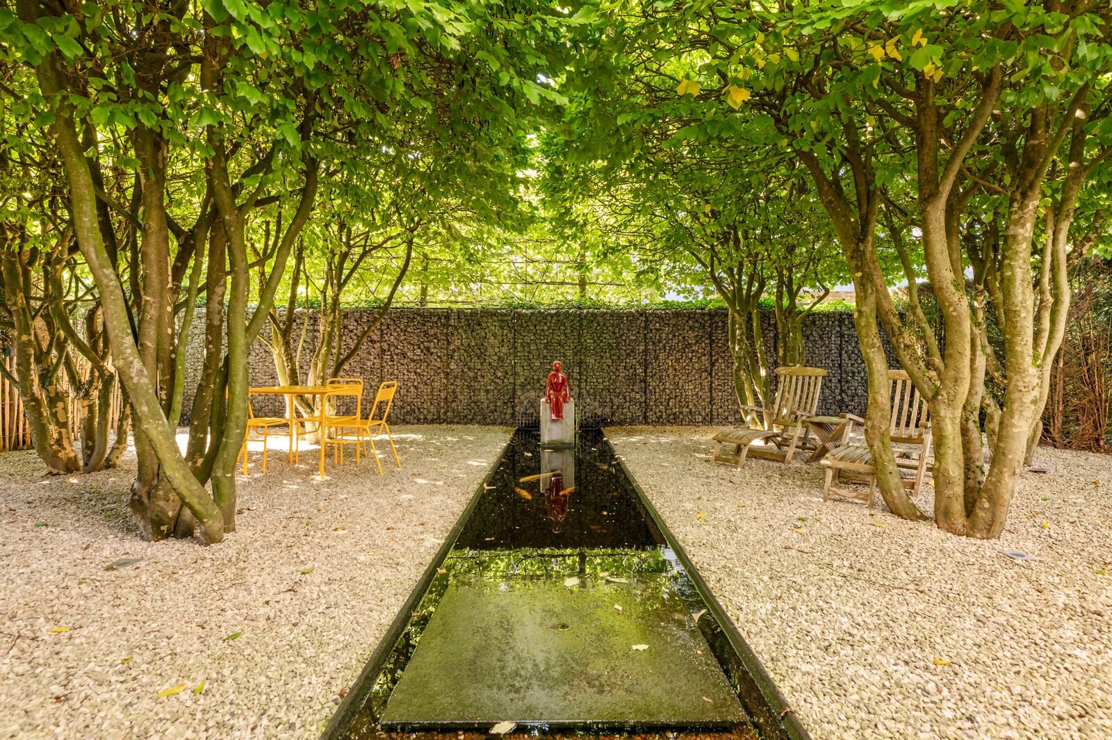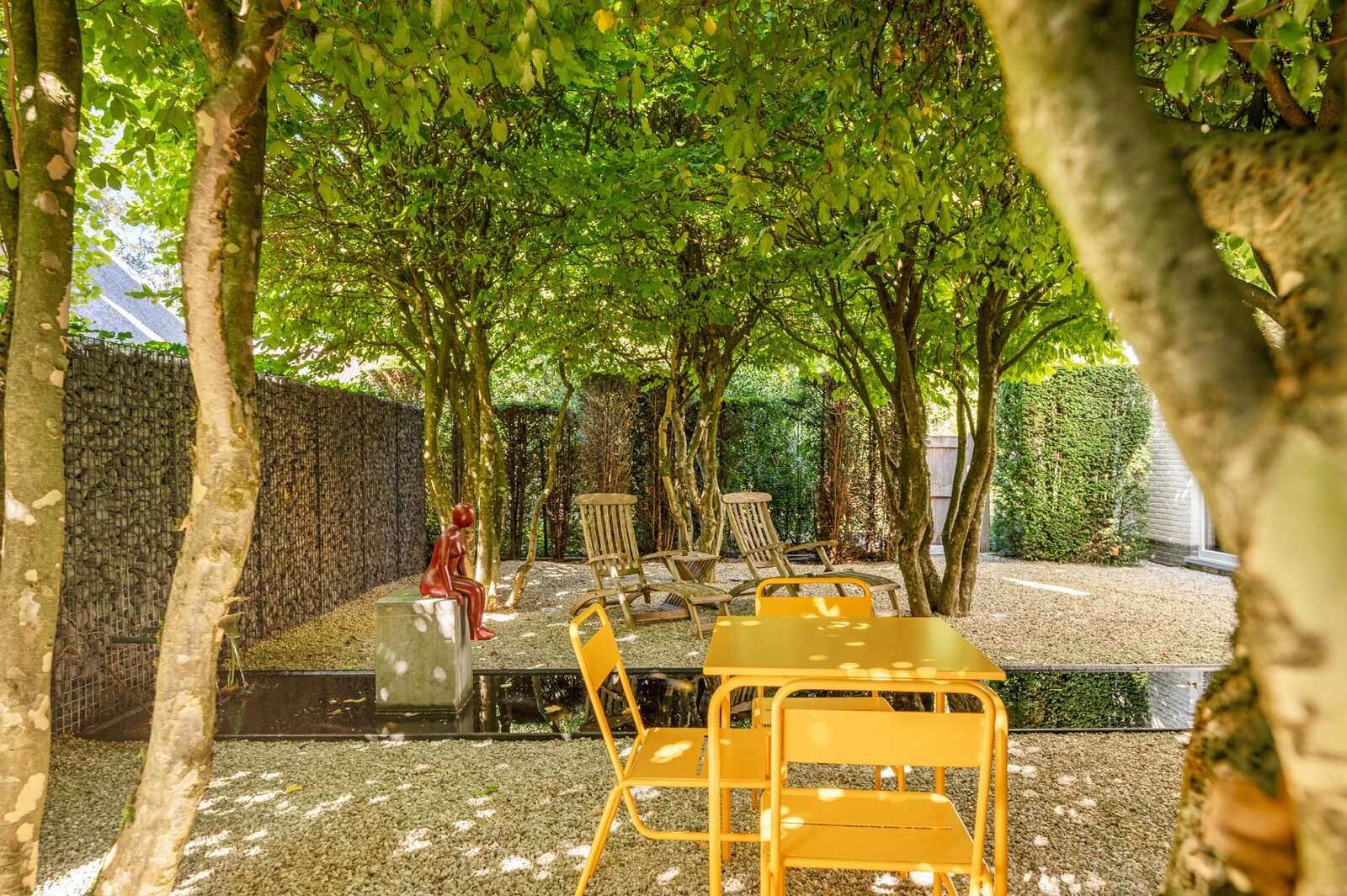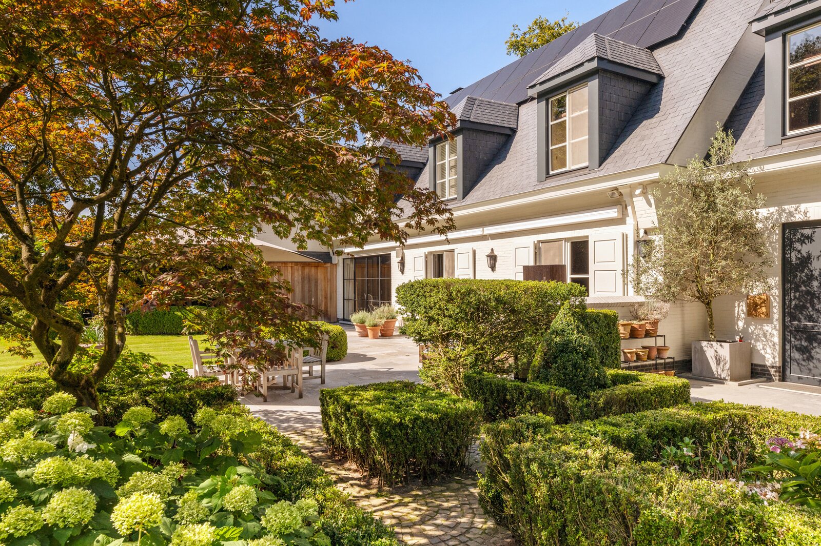 De prachtig aangelegde tuin creëert een oase van rust. Mooie voortuin met voldoende ruimte om te parkeren. Japans geïnspireerde zijtuin met moderne vijver. Terras onder de wijnranken die voor afkoeling zorgen op hete zomerdagen. Zonneterras pal op het zuiden. Wijds gazon en veel hagen en hoekjes ideaal voor kinderen om te ravotten. Enorm veel privacy en discretie door de hoge hagen en de volwassen bomen. Heerlijk genieten van het zwembad in de zomer, met tuinfeestjes in het poolhouse dat uitgerust is met een keuken, douche, toilet, kleedkamers, sauna, veranda, overdekt terras met open haard/bbq, een aparte opbergruimte en technische ruimte.