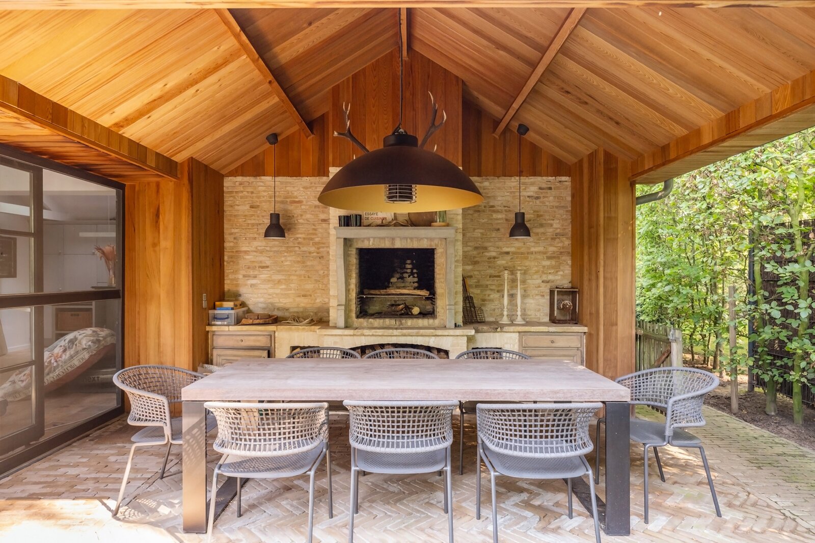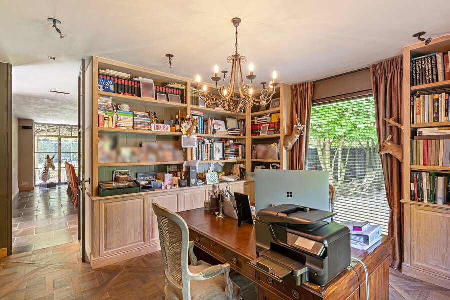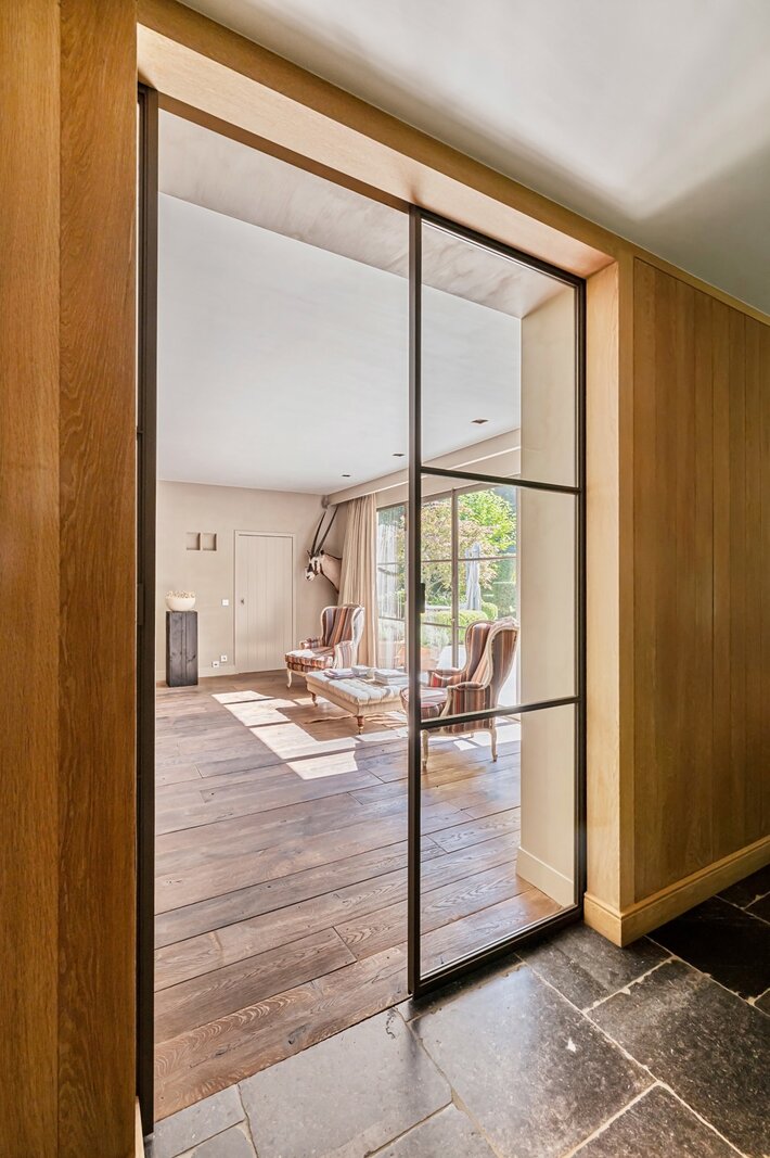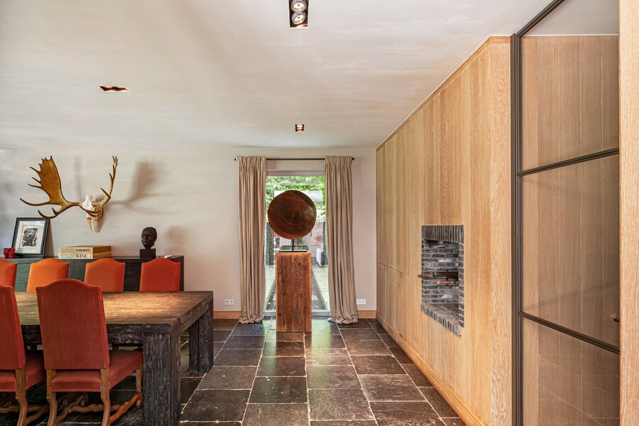 Rechtervleugel: fantastisch lichte, open leefruimte met elegante open haard en prachtige brede parket. Ruime eetkamer met wat meer wintervibes door natuursteen en open haard/binnenbbq voor gezellige avonden met vrienden rond de grote tafel. Aansluitend mooie bureauruimte op oude kasteelparket waar je in alle rust kan werken.