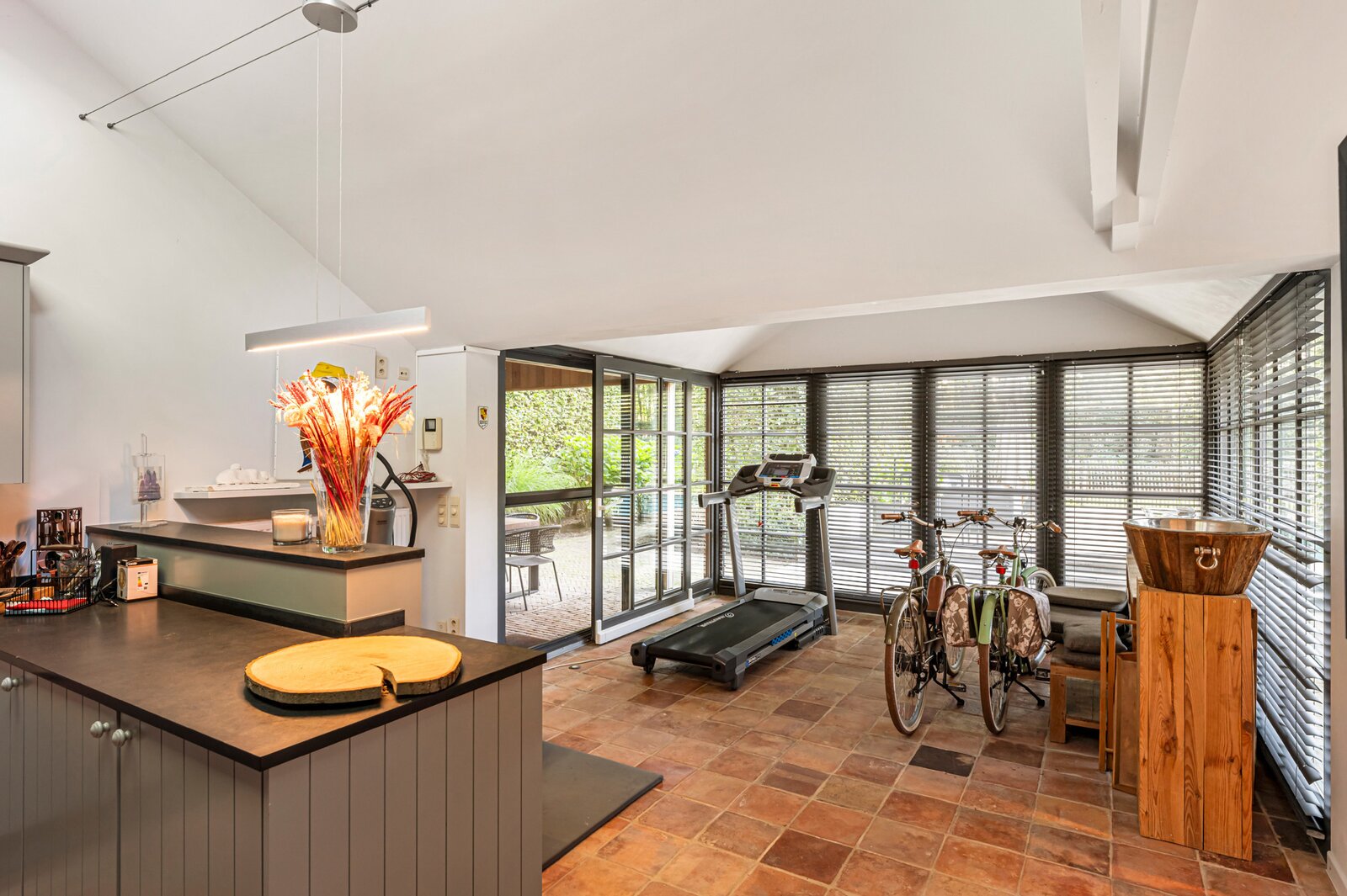 Linkervleugel: zeer knappe volledig geëquipeerde keuken met topmaterialen, en aansluitend een cosy ontbijtruimte in warme terracottatinten, beide tot in de details afgewerkt door Dankers Decor (kind aan huis bij Hollywoodsterren). Een goed uitgeruste wasplaats en dubbele garage vervolledigen het gelijkvloers.