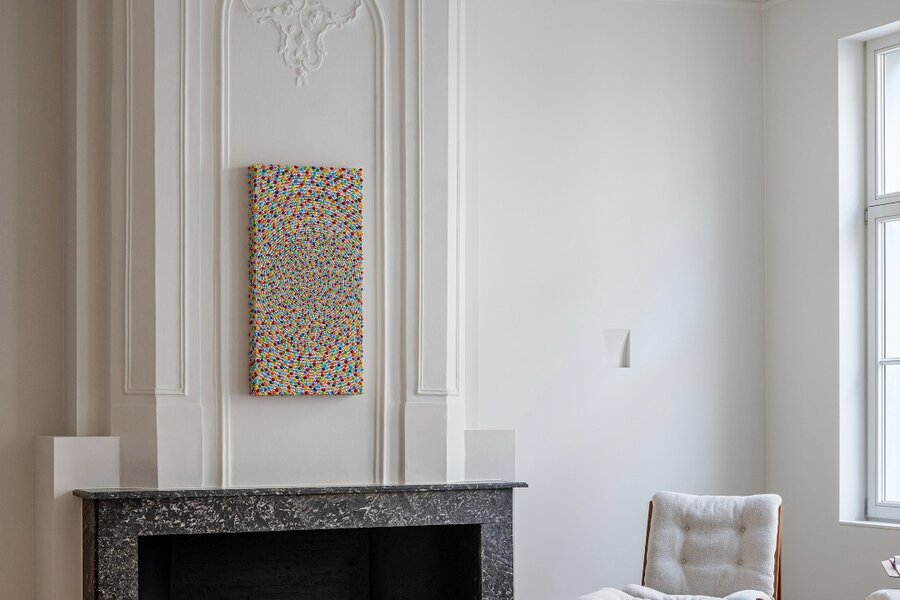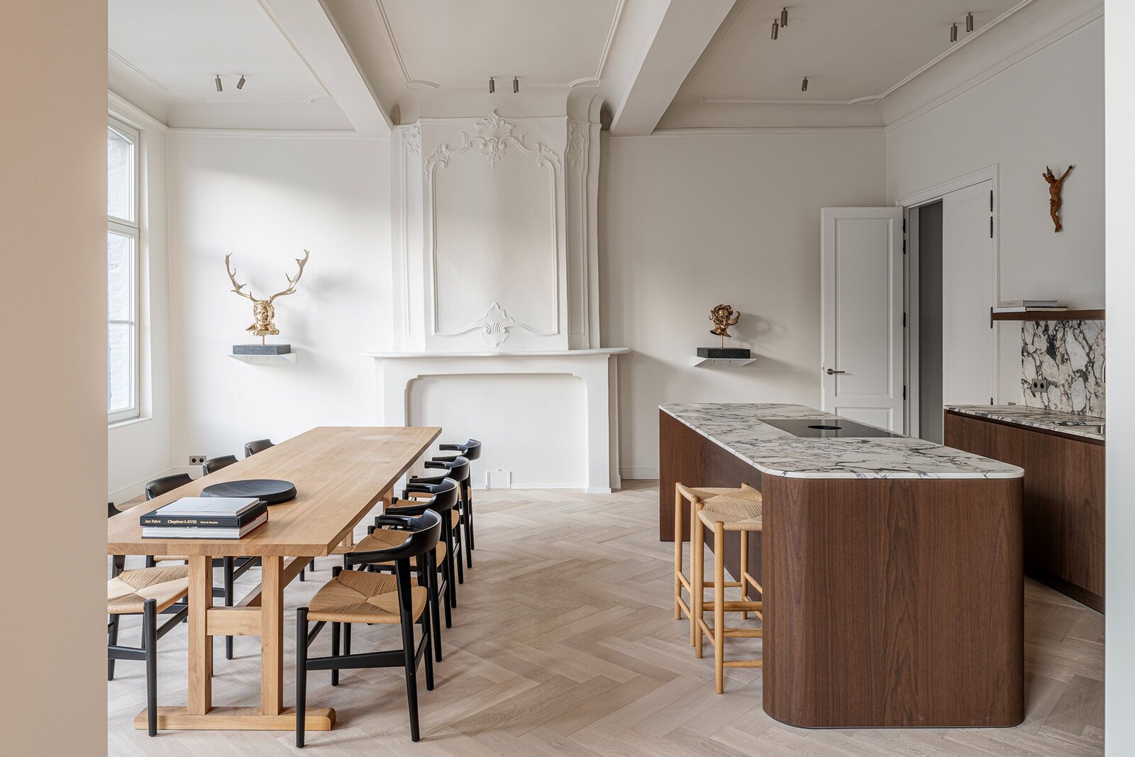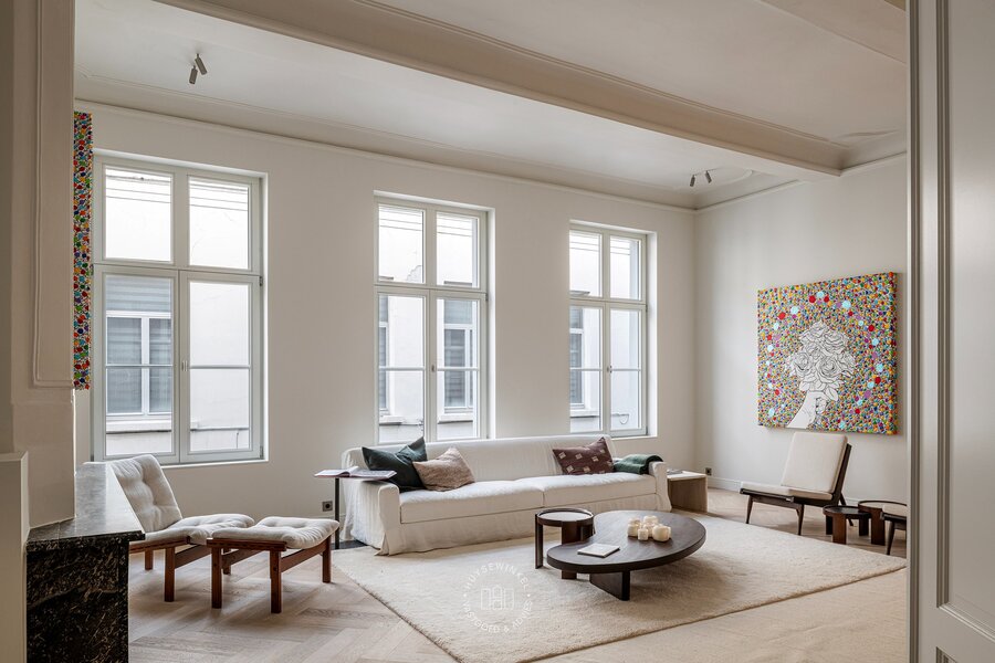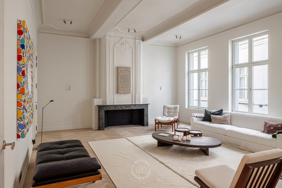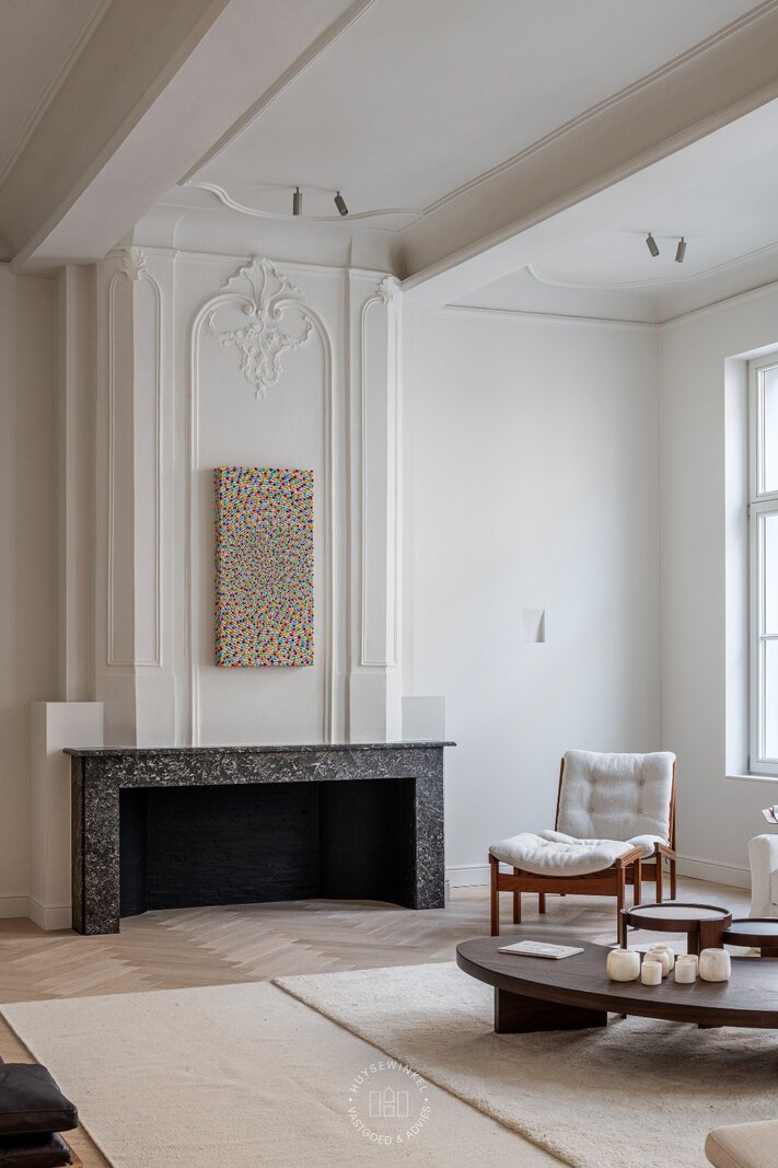 De ruime woonkamer, harmonieus geïntegreerd binnen het geheel, is perfect georiënteerd en ademt karakter. Net zoals in de rest van het appartement zorgen authentieke elementen zoals sierlijke schouwen en hoogwaardige parketvloeren voor een warme, tijdloze elegantie.