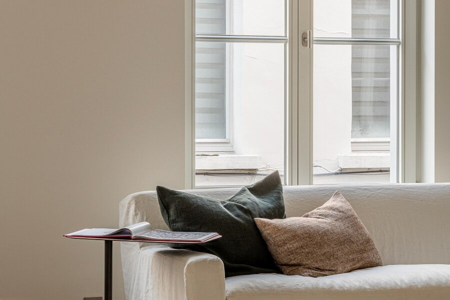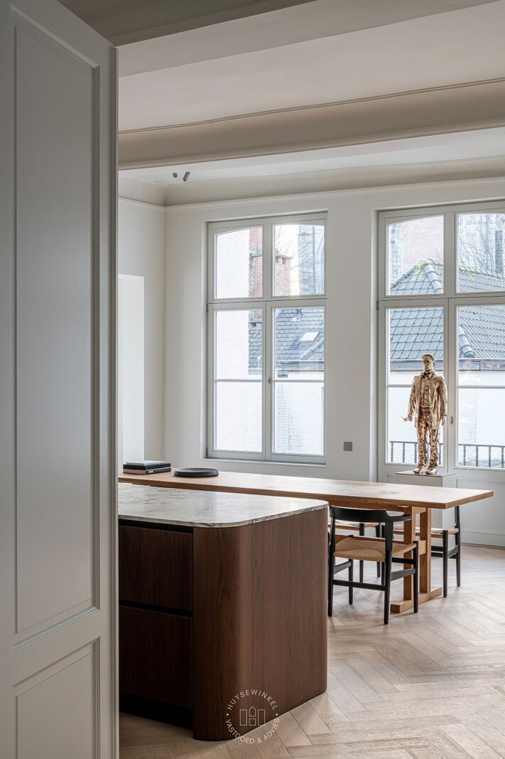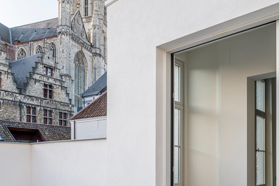De leefruimte vormt het absolute hart van het appartement en imponeert door haar royale volumes, overvloedige lichtinval en prachtige zichtlijnen. Vanuit deze ruimte geniet u van een uniek panorama op de Sint-Baafskathedraal — een zeldzaam en begeerd uitzicht dat elke dag opnieuw inspireert.