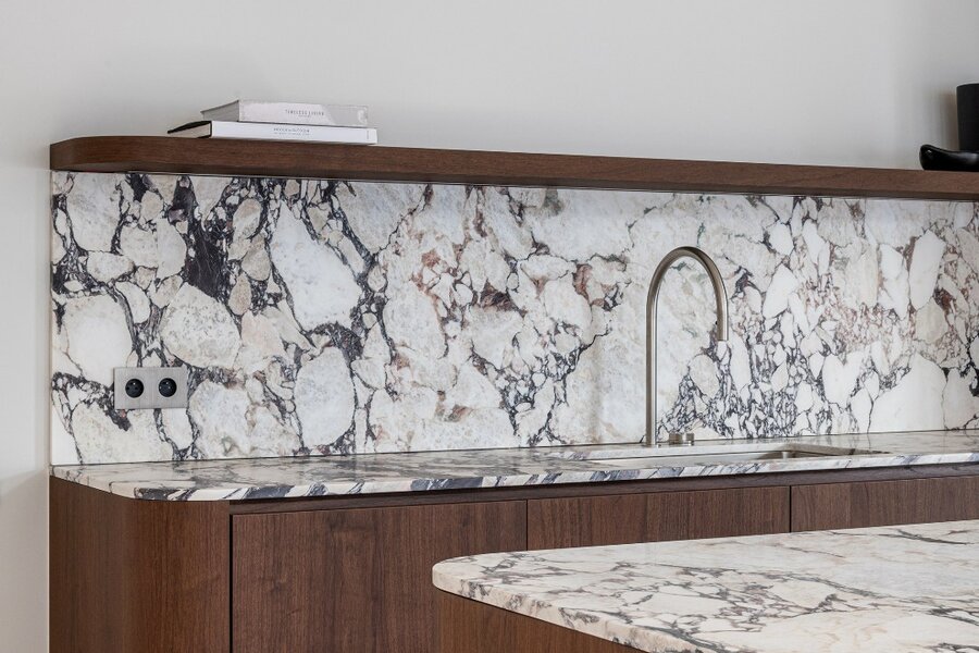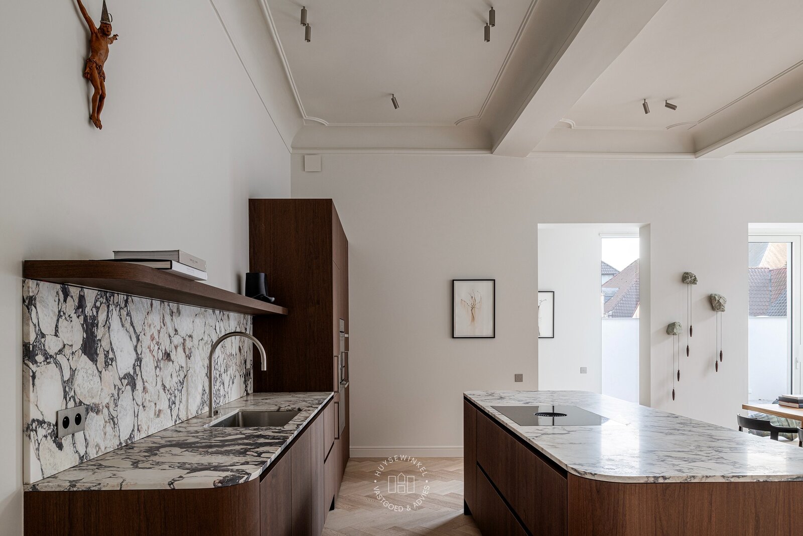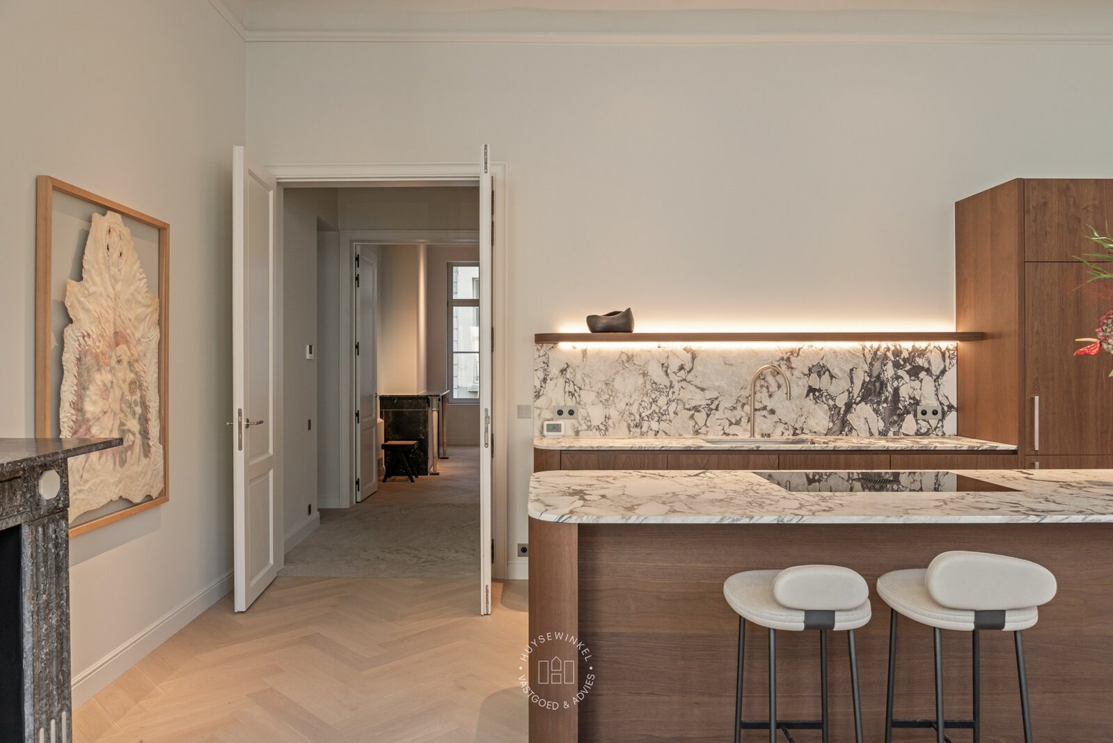 De keuken is naadloos geïntegreerd in de leefruimte en werd opgevat als een verfijnd architecturaal geheel. Strak maatwerk, hoogwaardige materialen en een doordachte indeling maken van deze keuken niet alleen een esthetisch statement, maar ook een uiterst functionele leefkeuken die perfect aansluit bij het high-end karakter van het appartement.