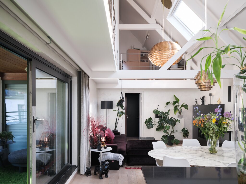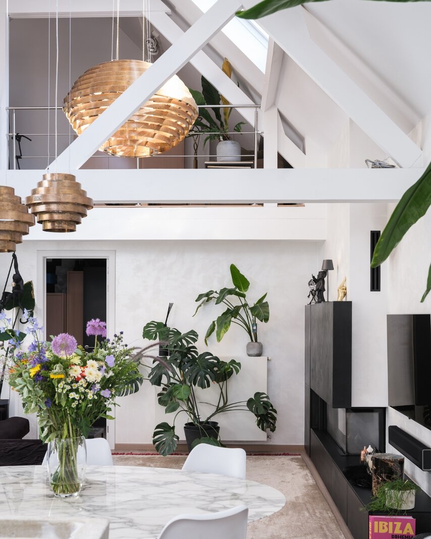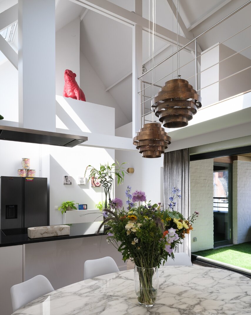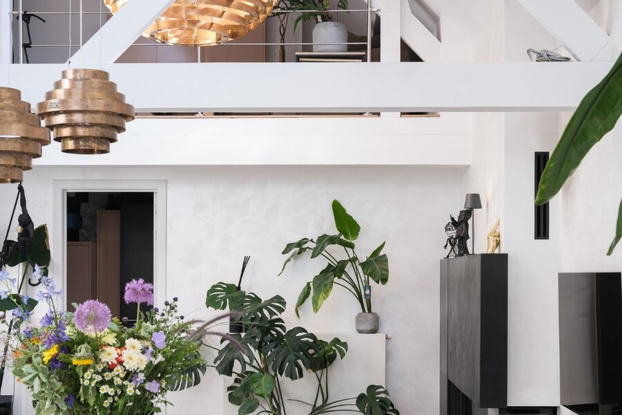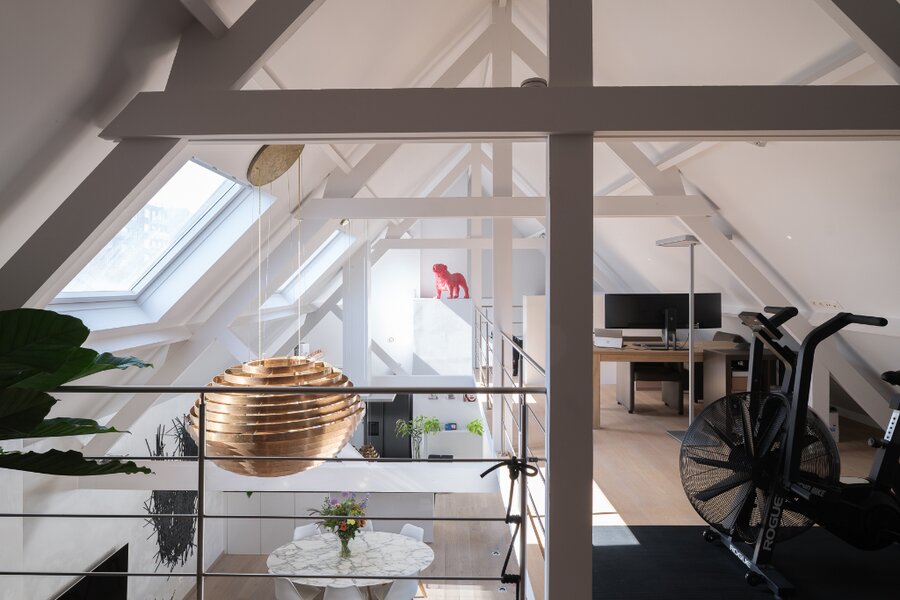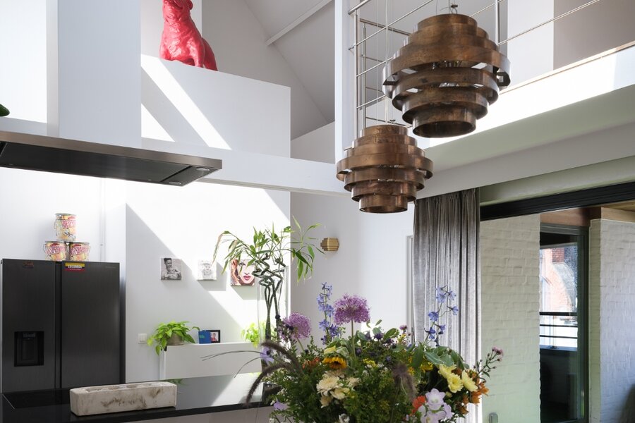 De hoge plafonds, het indrukwekkende dakgebinte en de vele raampartijen zorgen voor een bijzondere woonbeleving en overvloedige lichtinval.