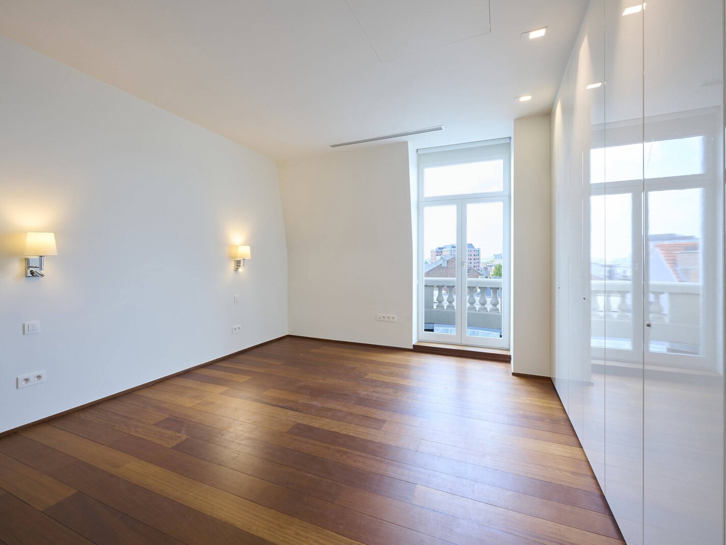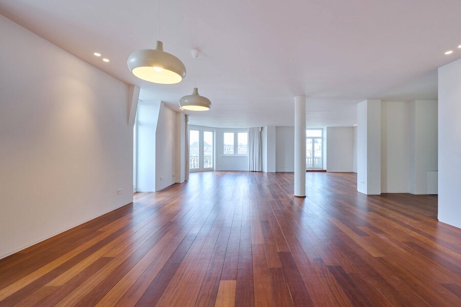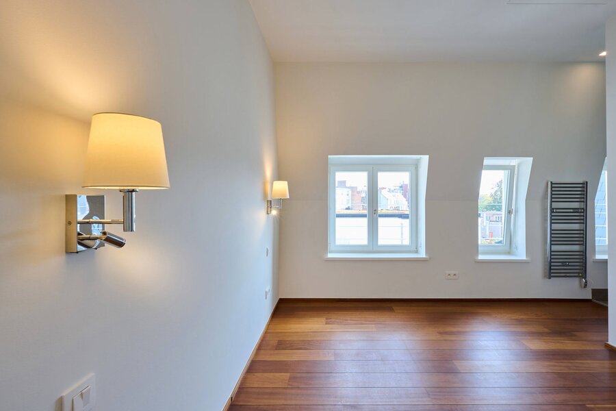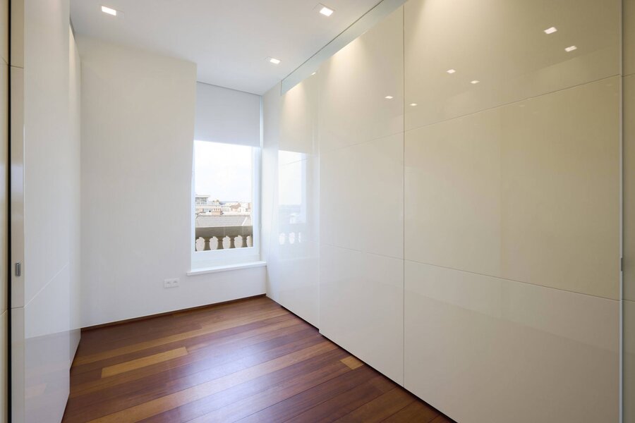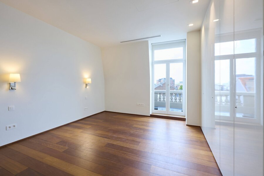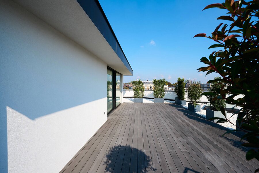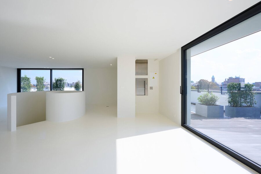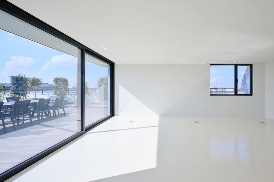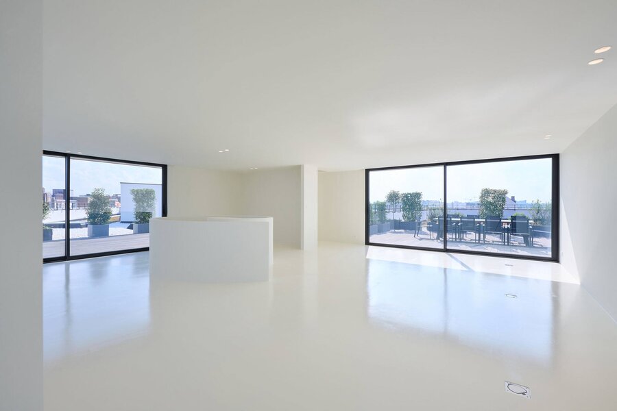 The apartment comprises a hall with a cloakroom, a large open-plan living/dining room with a balcony, and a separate semi-professional kitchen with a breakfast nook and a small terrace. The master bedroom offers a separate dressing room and a full bathroom (whirlpool bath, aromatherapy shower). The three other suites each have their own dressing room and private bathroom/shower. Upstairs, a space that can be used as a second reception room opens directly onto the perfectly oriented terraces and enjoys spectacular views of Brussels. A cinema room completes this floor.