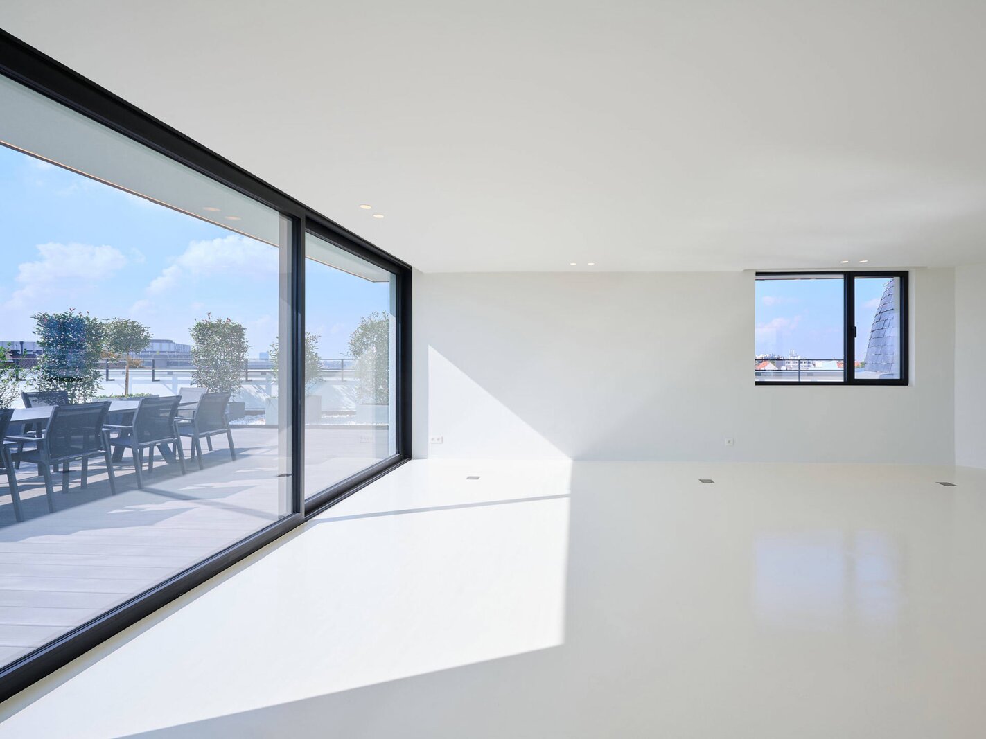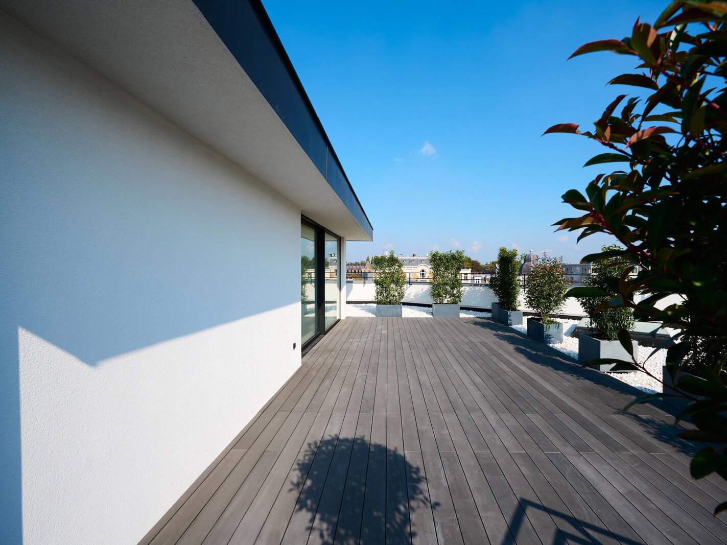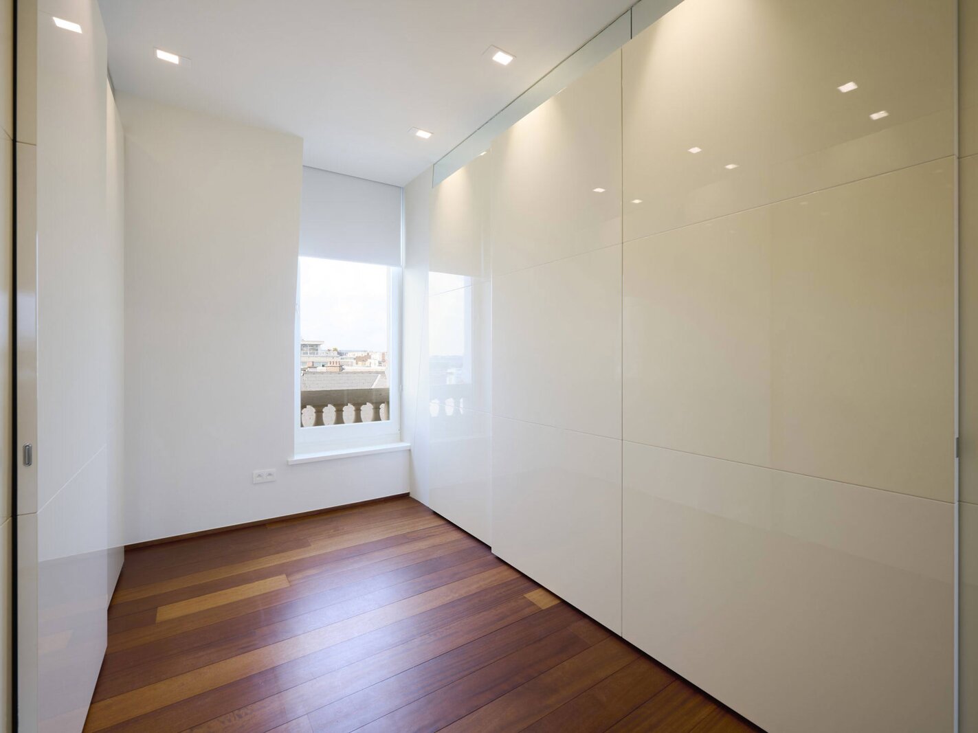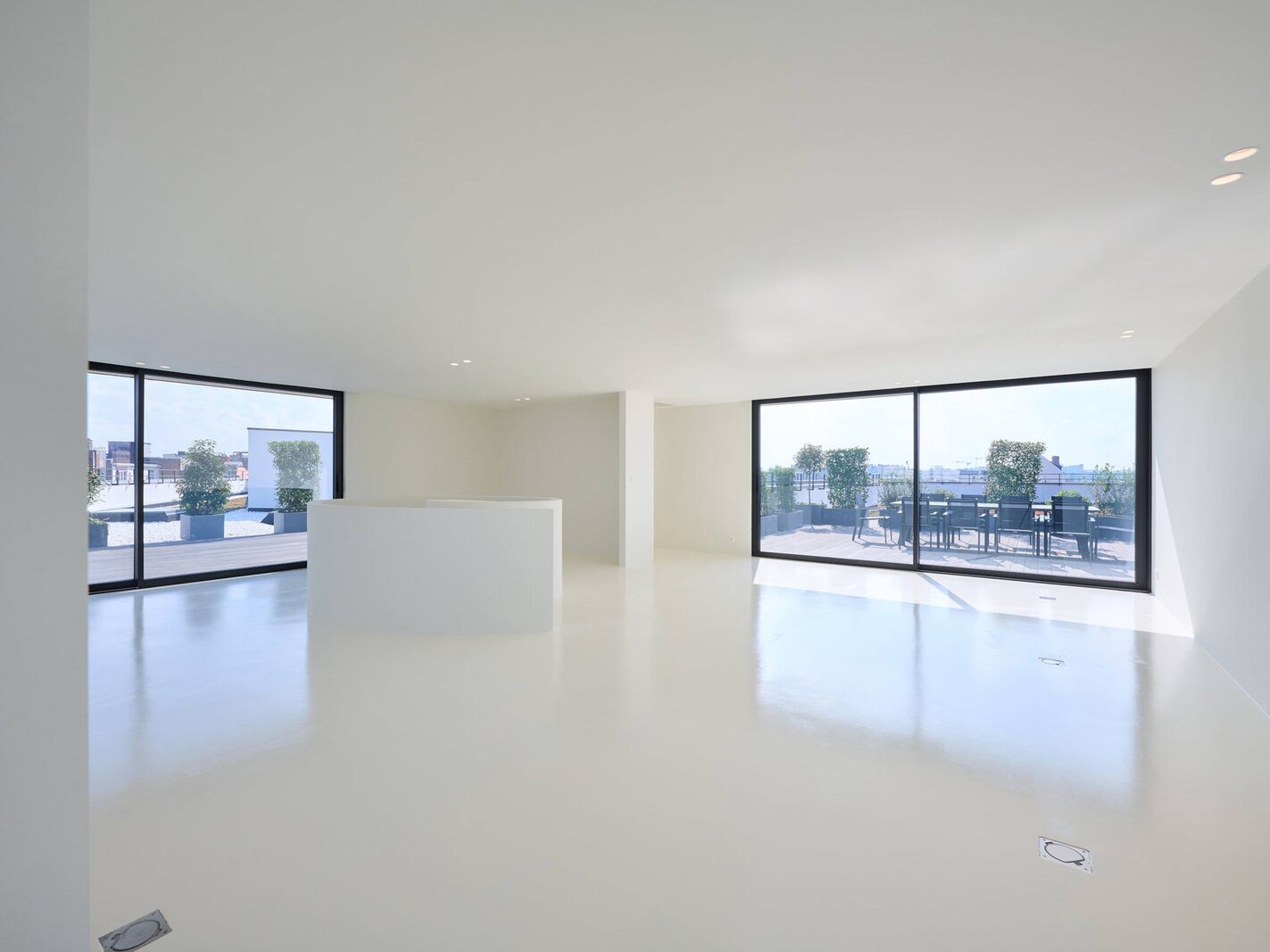 The apartment comprises a hall with a cloakroom, a large open-plan living/dining room with a balcony, and a separate semi-professional kitchen with a breakfast nook and a small terrace. The master bedroom offers a separate dressing room and a full bathroom (whirlpool bath, aromatherapy shower). The three other suites each have their own dressing room and private bathroom/shower. Upstairs, a space that can be used as a second reception room opens directly onto the perfectly oriented terraces and enjoys spectacular views of Brussels. A cinema room completes this floor.