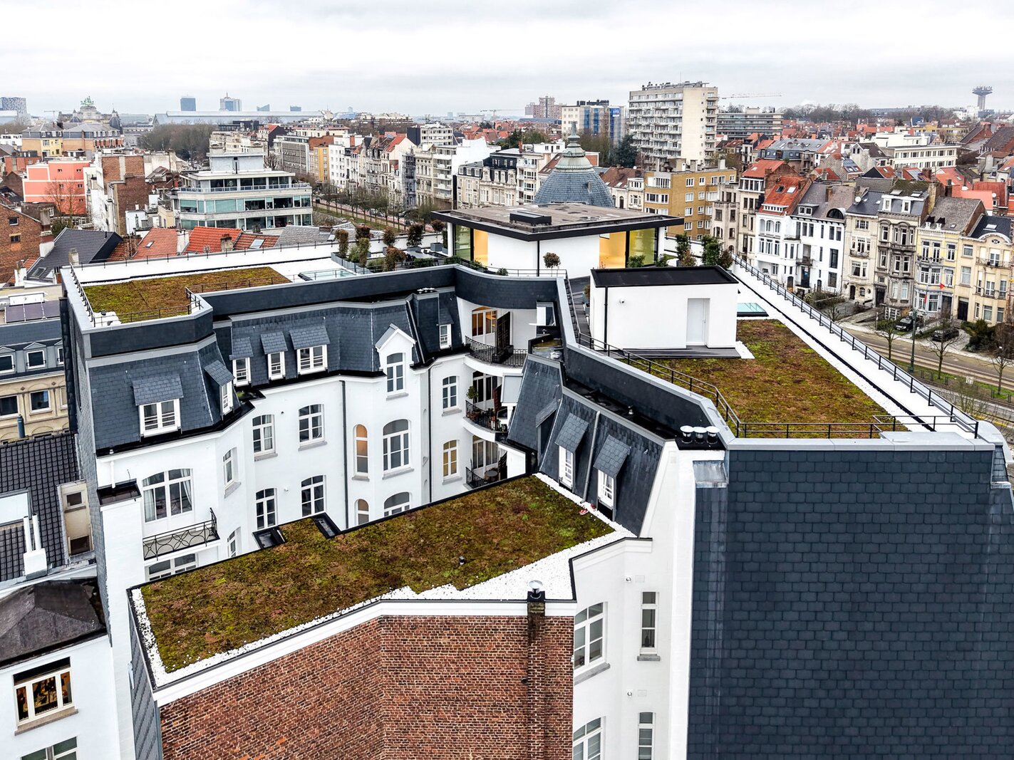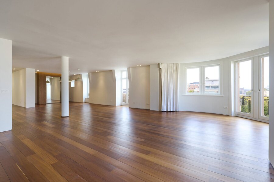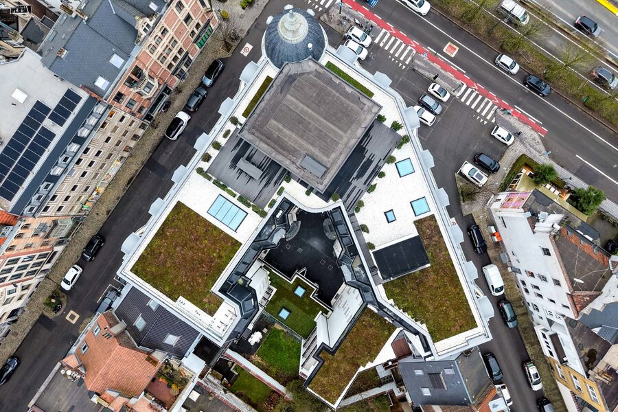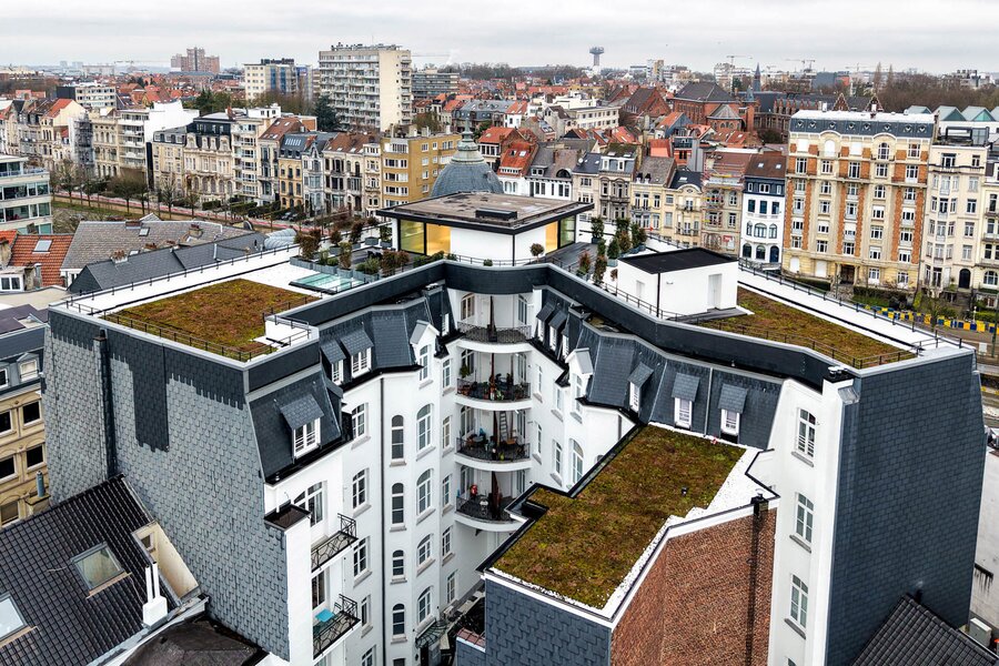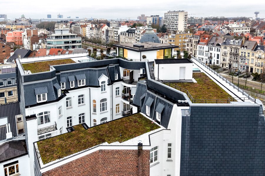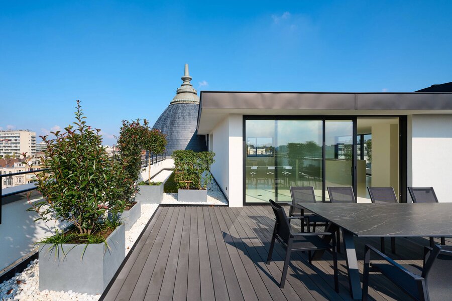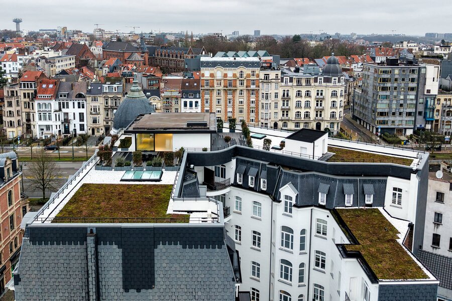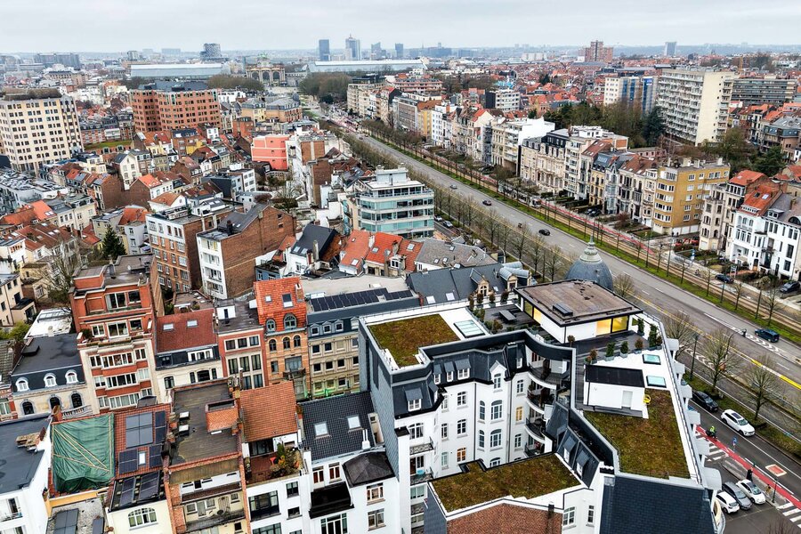Ideally located between the Cinquantenaire and Montgomery, in a Beaux-Arts-style building dating from 1910, this contemporary penthouse offers a gross floor area of 500 m² (EPC) with suspended terraces and 360° views of the capital. The building was completely renovated in 2013, combining modernity and period features.
