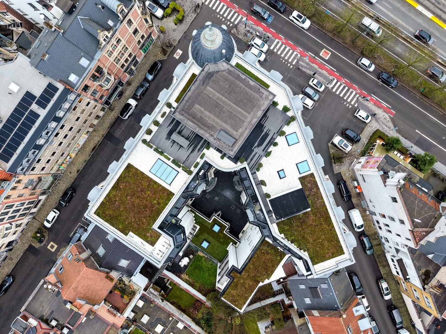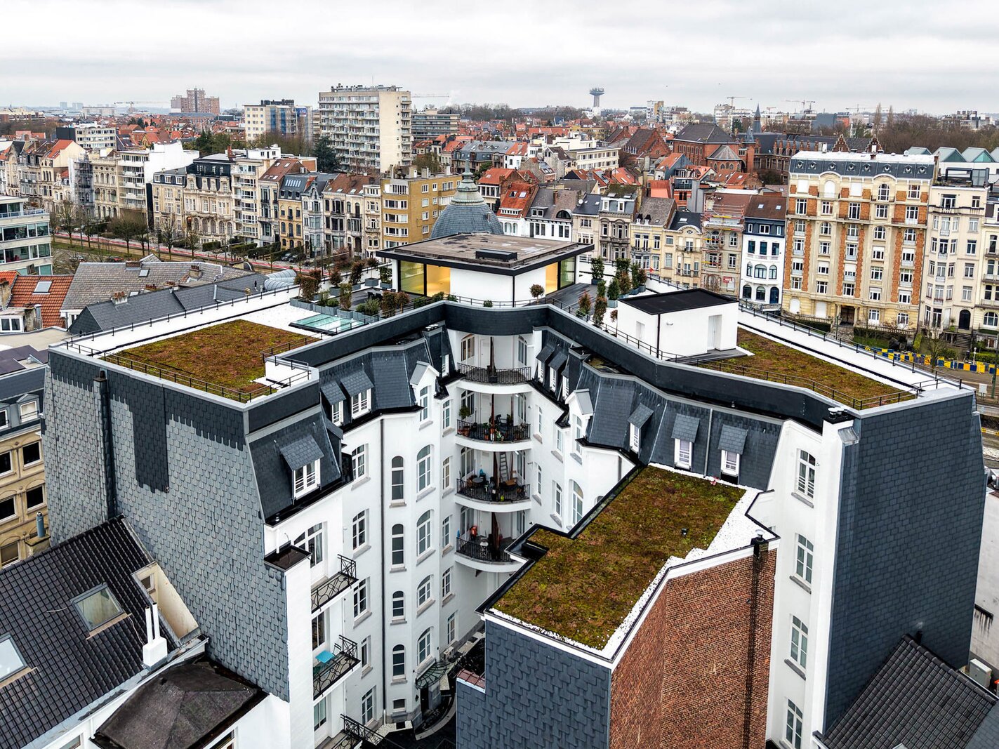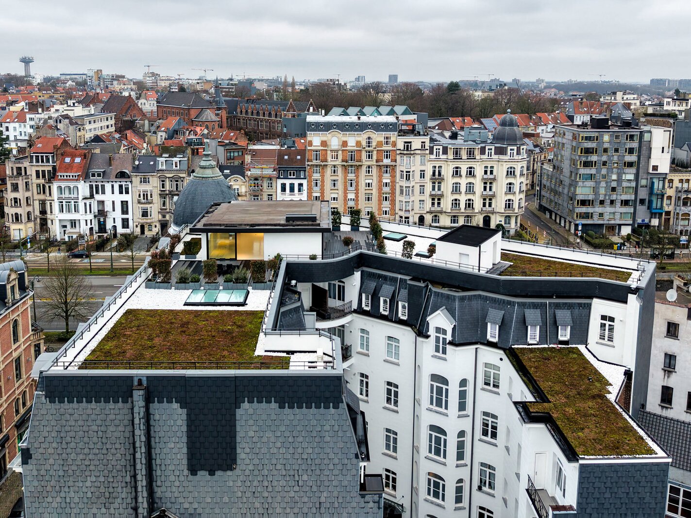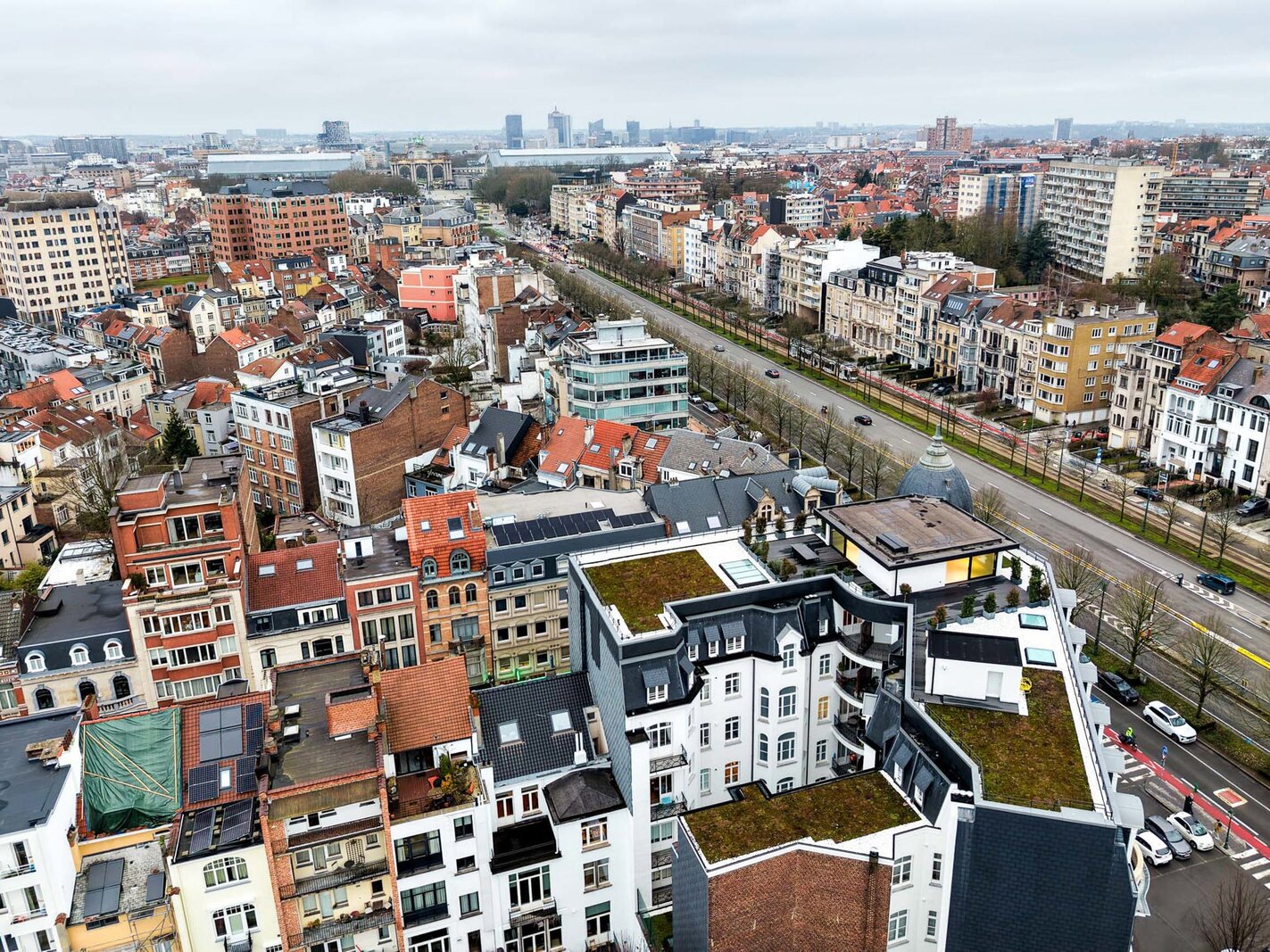 Ideally located between the Cinquantenaire and Montgomery, in a Beaux-Arts-style building dating from 1910, this contemporary penthouse offers a gross floor area of 500 m² (EPC) with suspended terraces and 360° views of the capital. The building was completely renovated in 2013, combining modernity and period features.