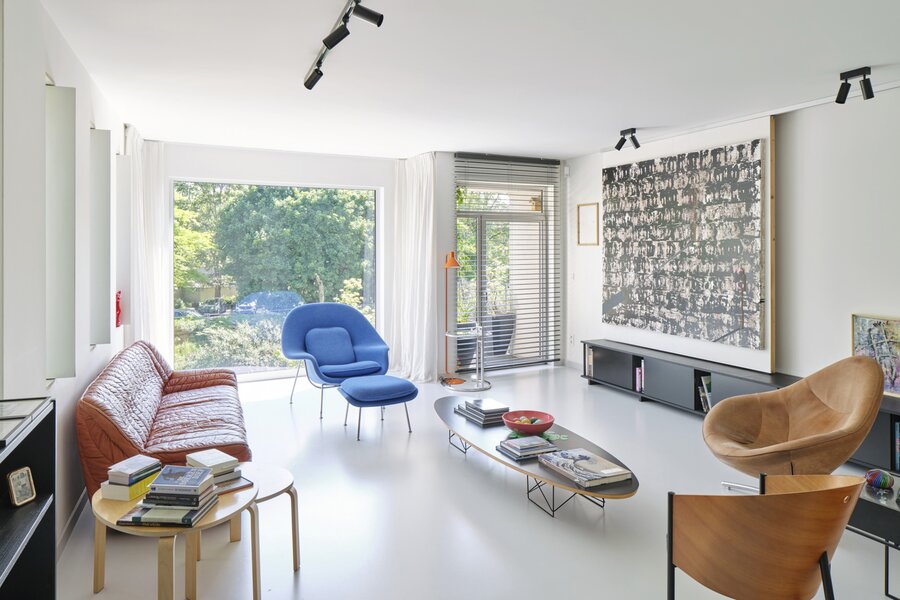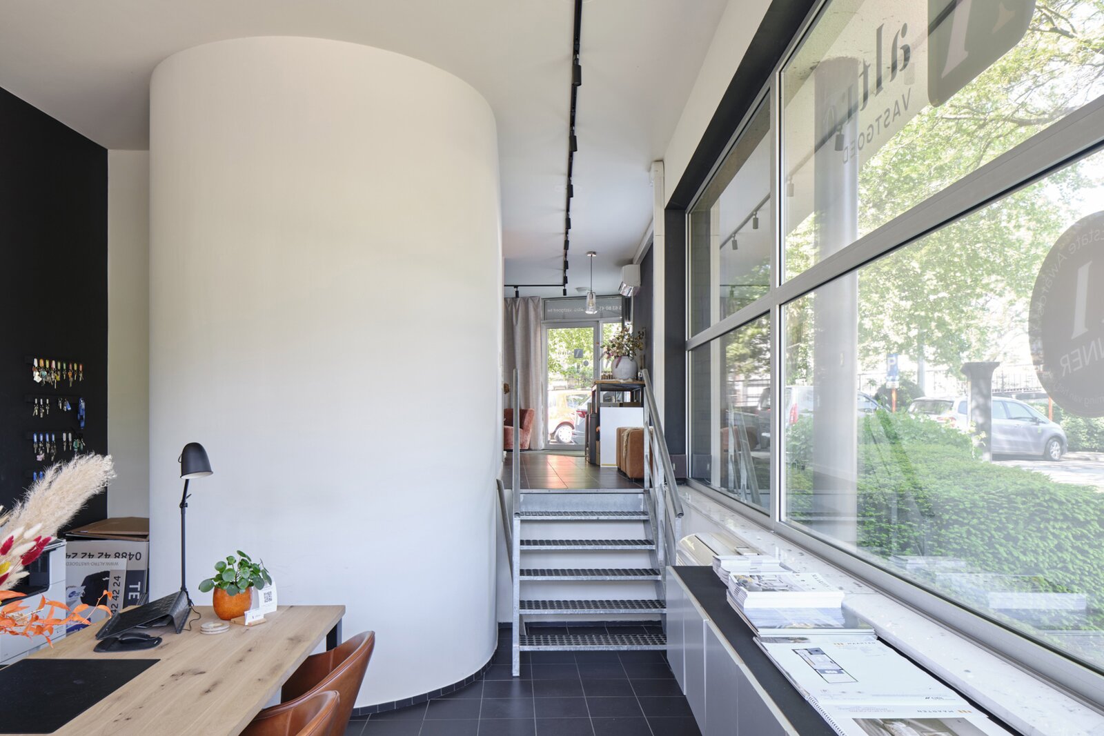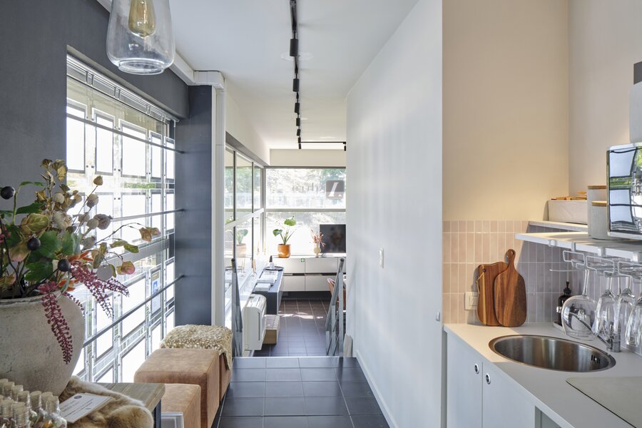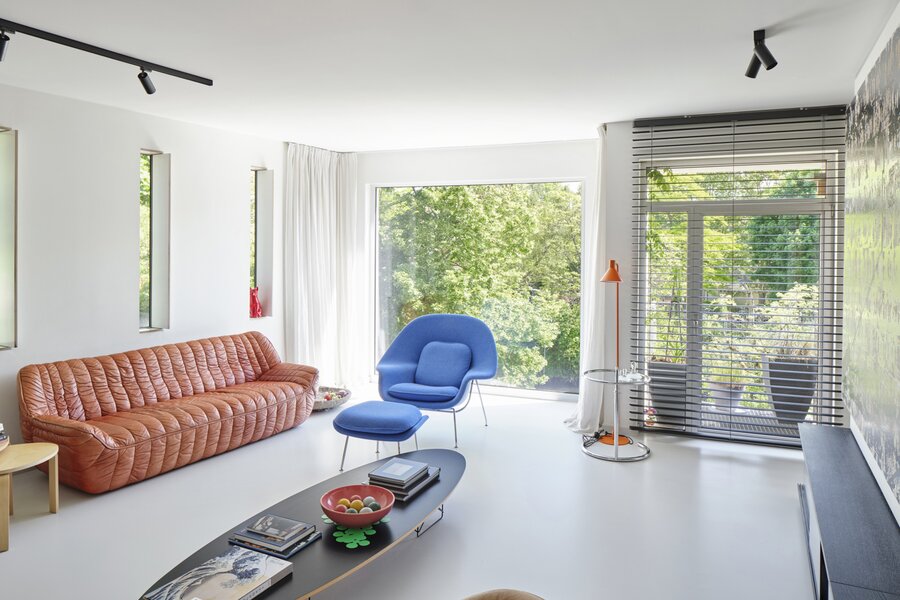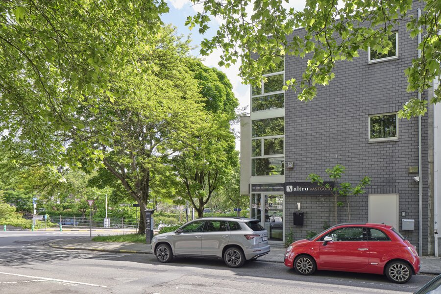 This architectural building underwent a complete renovation in 2016–17 by Atelier Dialect. During this transformation, the house—originally a single-family home—was divided into two separate units. One is an office space with its own entrance, office, reception area with stunning views over the Dijle, kitchenette and sanitary facilities, currently rented out for €1,100 per month. The second unit is a beautifully finished design apartment spread over the two upper floors. This space can be adapted to your needs: reconvert it into a single-family home, start your own practice below your residence, or continue renting out the office—many possibilities are available.