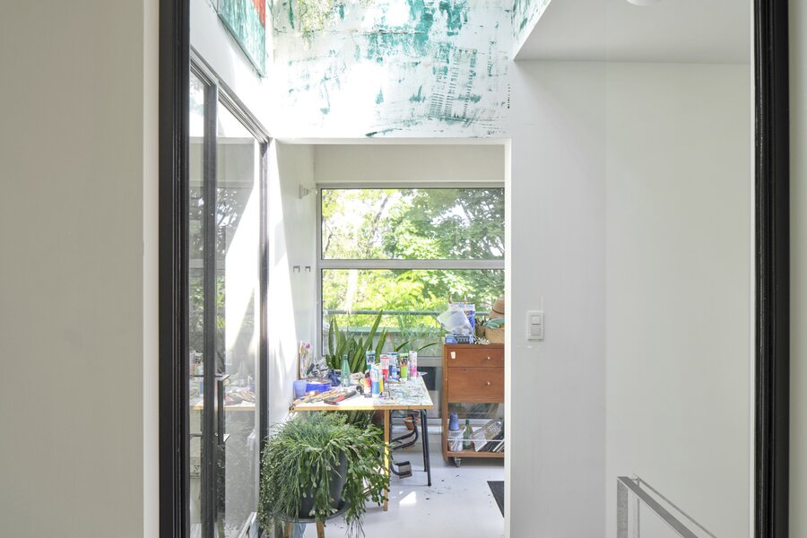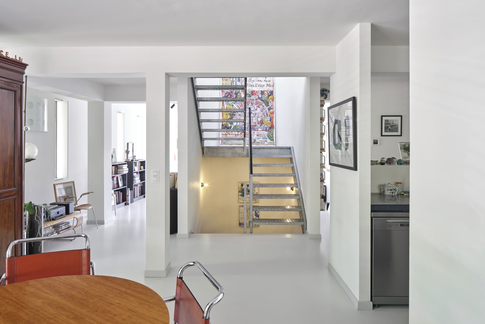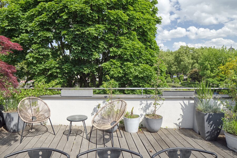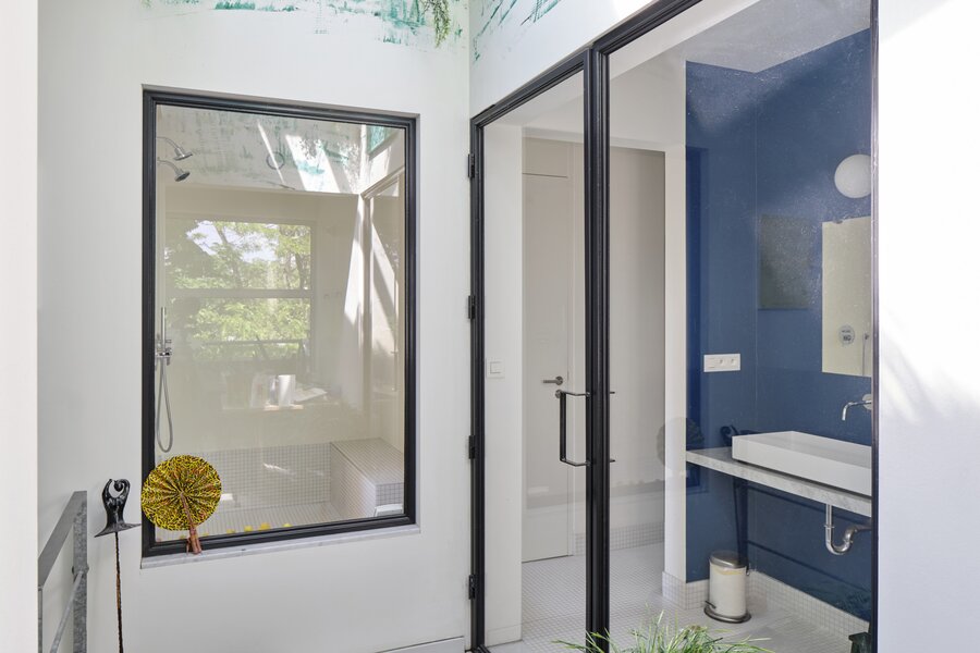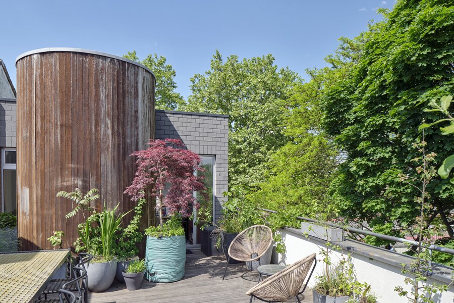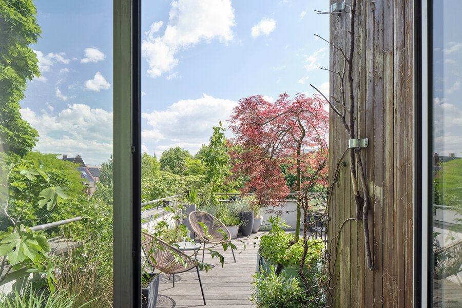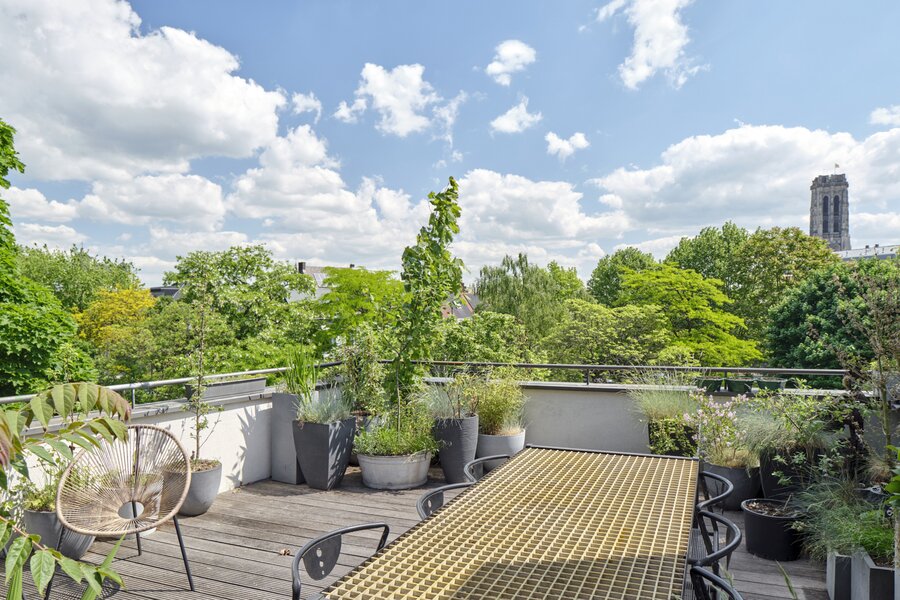 The apartment also has a private entrance. From the hallway, an industrial-style staircase leads to the first floor, where you find the living and sitting area with open kitchen. Large panoramic windows and a terrace offer beautiful river views, while the continuous polished floor and underfloor heating create a loft-like yet warm atmosphere. On the second floor are two bedrooms, a modern bathroom and a cosy office space, currently used as a painter’s studio. The magnificent hardwood roof terrace is a true urban hideaway, offering a spectacular 180° view over the Dijle.