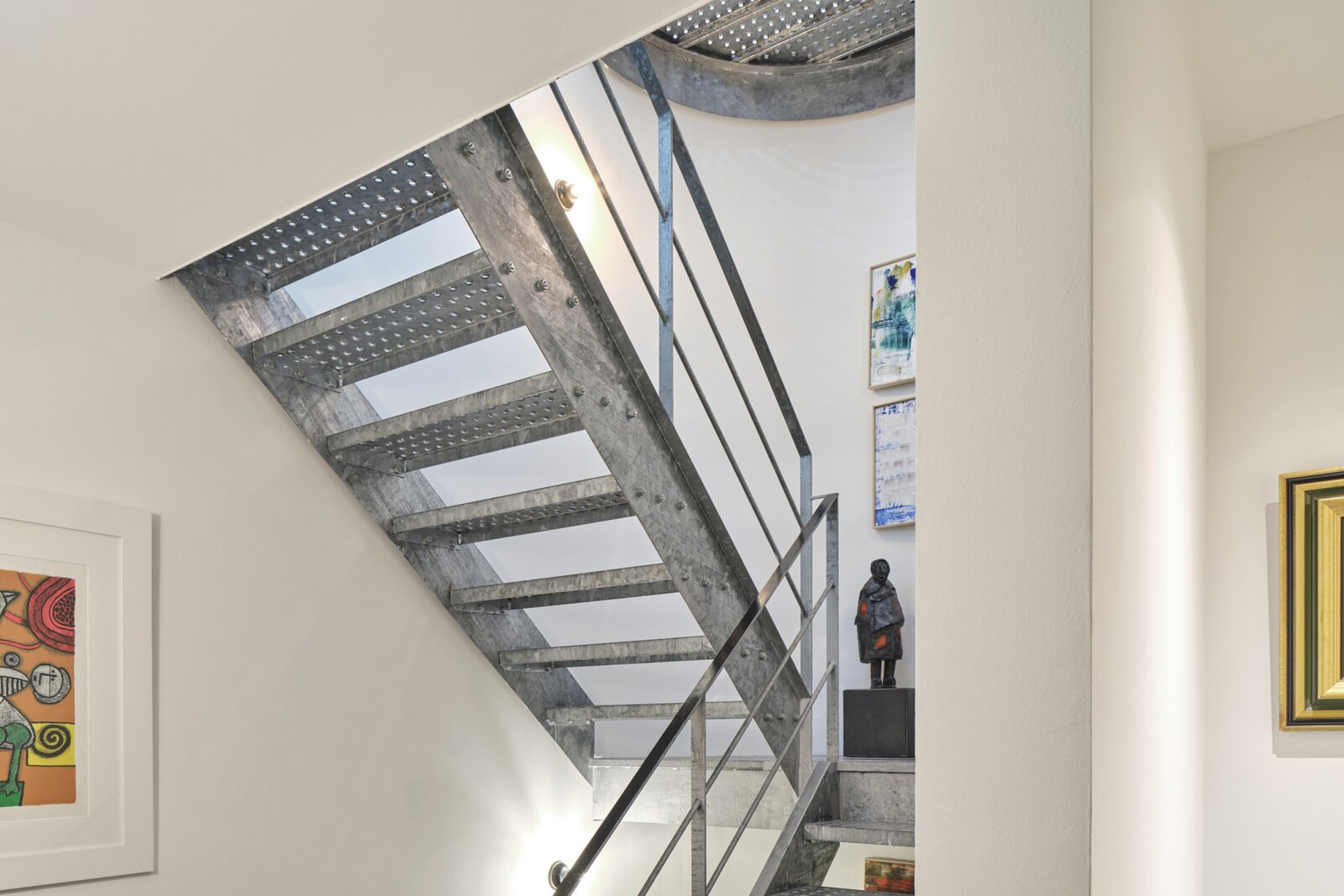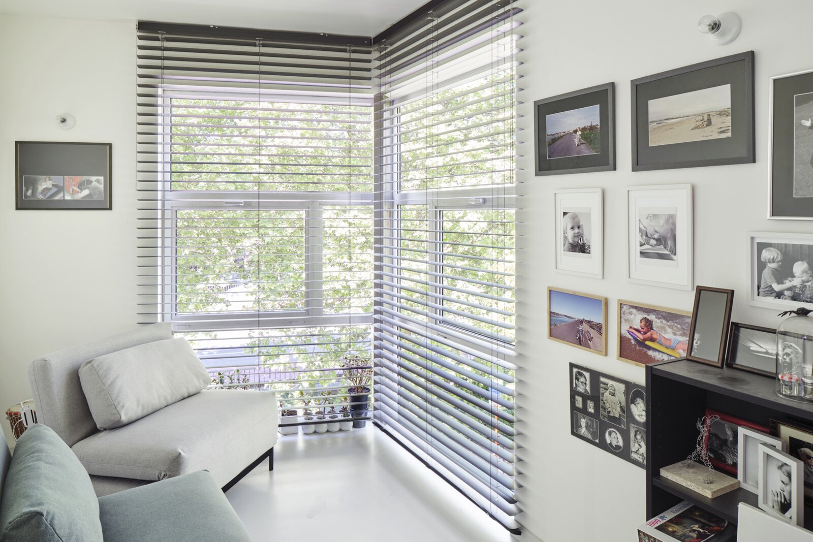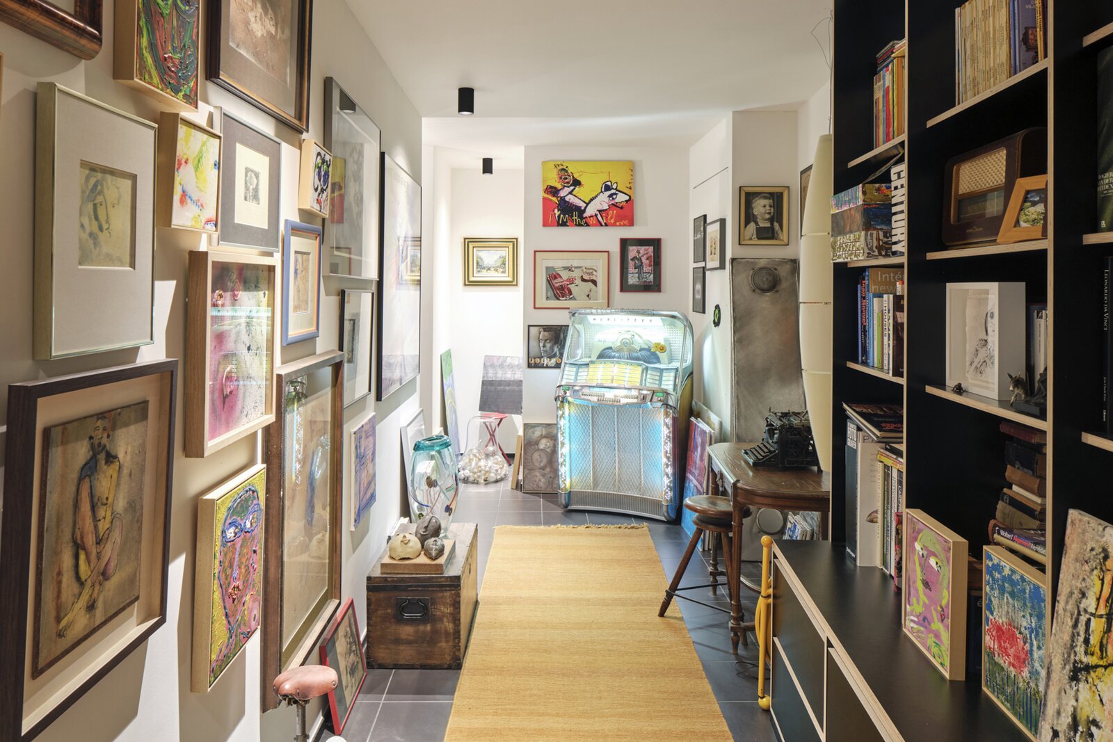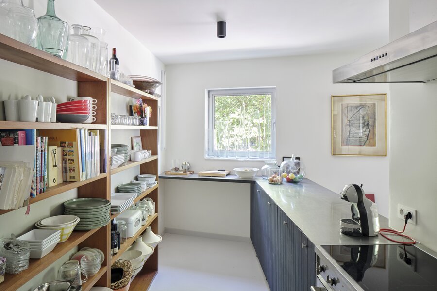 The apartment also has a private entrance. From the hallway, an industrial-style staircase leads to the first floor, where you find the living and sitting area with open kitchen. Large panoramic windows and a terrace offer beautiful river views, while the continuous polished floor and underfloor heating create a loft-like yet warm atmosphere. On the second floor are two bedrooms, a modern bathroom and a cosy office space, currently used as a painter’s studio. The magnificent hardwood roof terrace is a true urban hideaway, offering a spectacular 180° view over the Dijle.