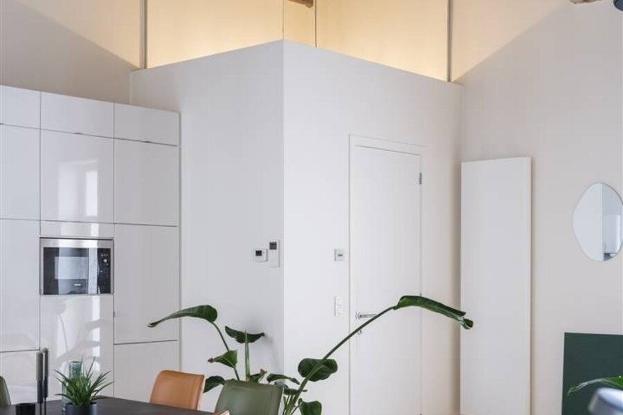 De open leefruimte baadt in het licht en sluit naadloos aan op de stijlvolle keuken – ideaal om te ontspannen of gasten te ontvangen.