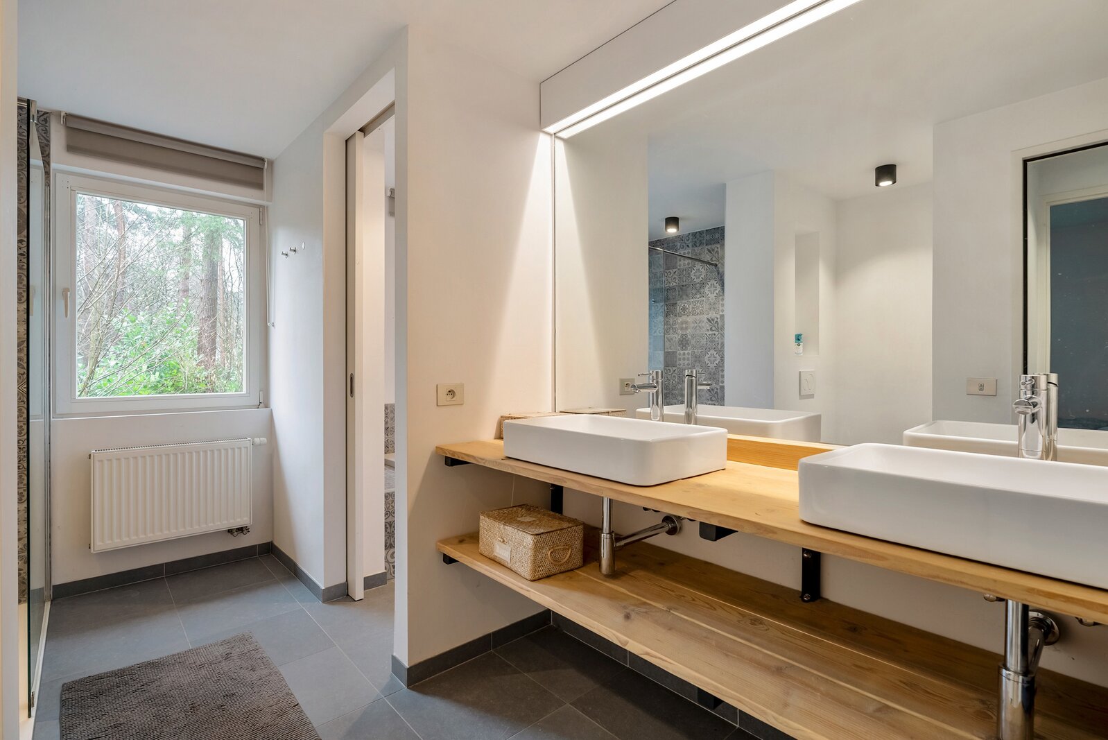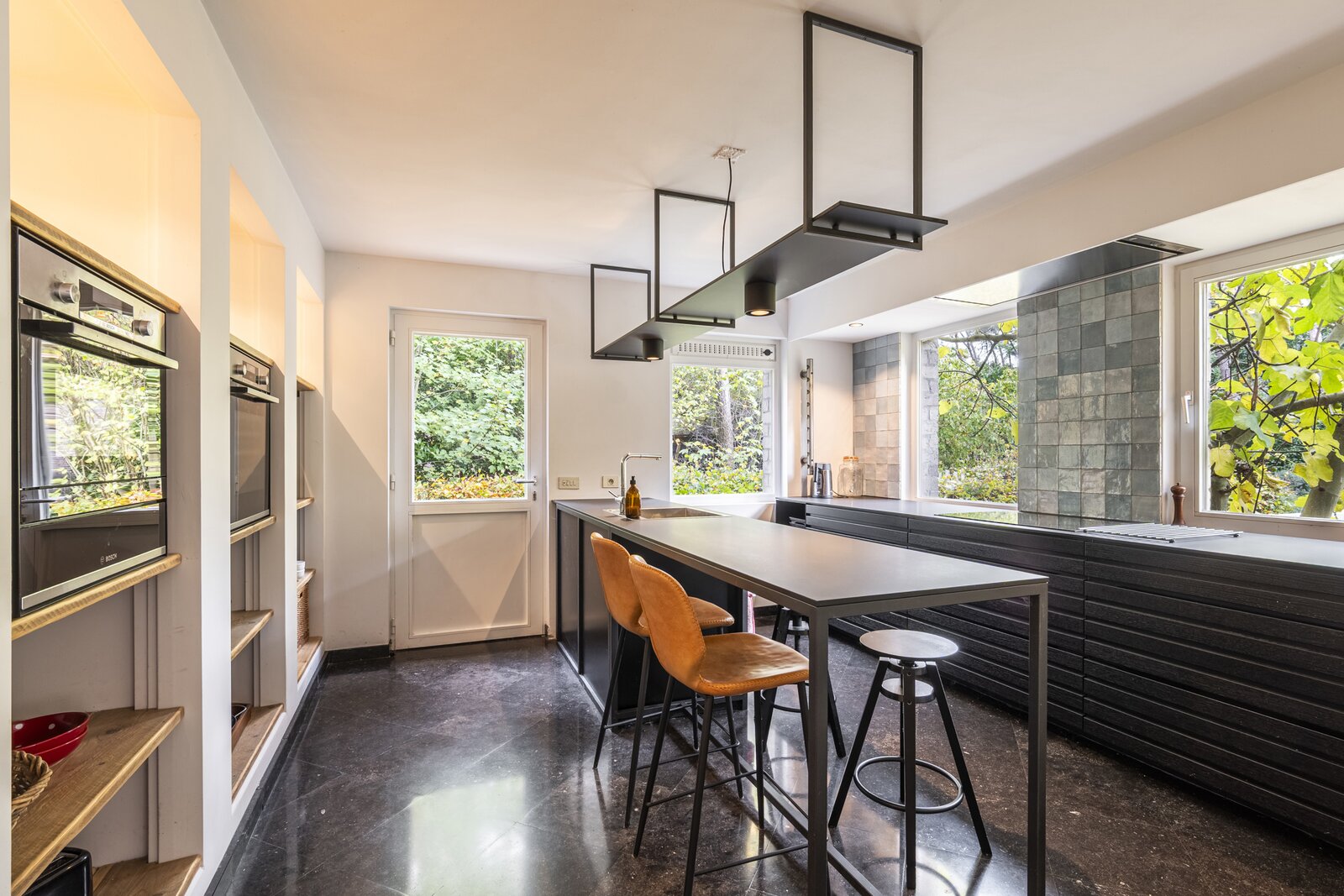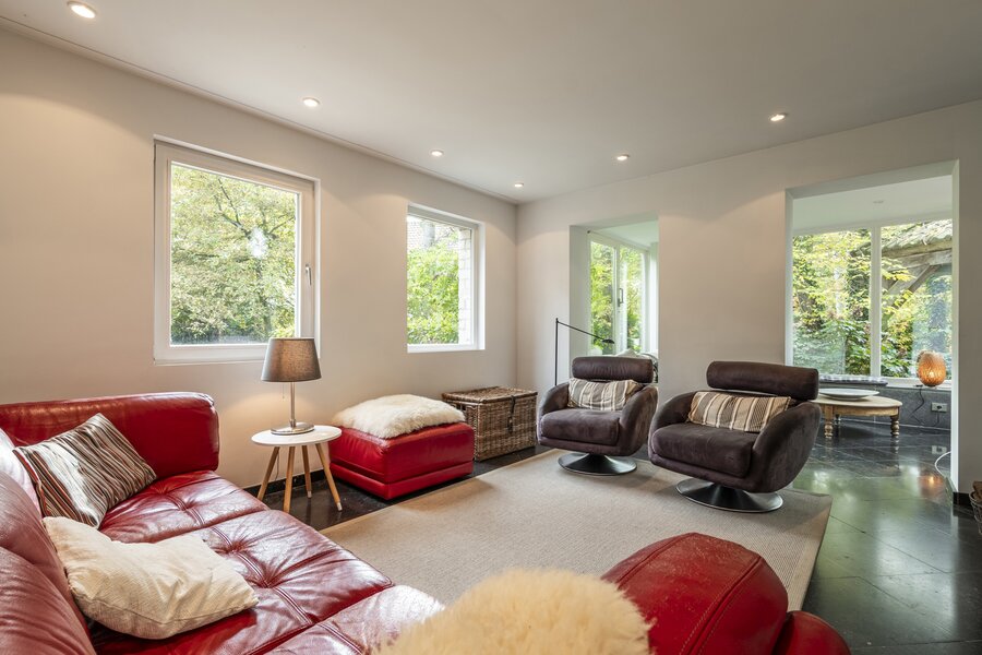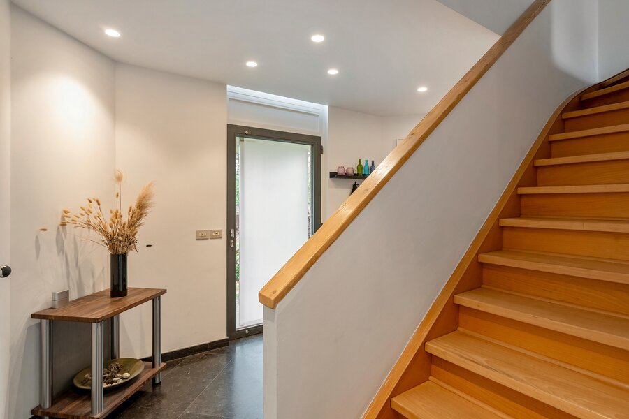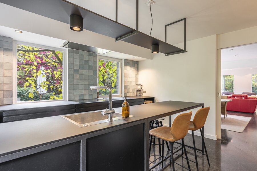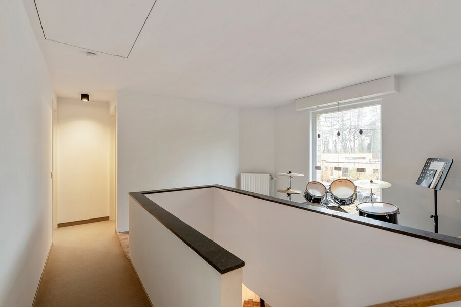 Gelijkvloerse verdieping: De ruime inkomhal biedt plaats voor een vestiaire en een apart gastentoilet met handenwasser. De lichte woonkamer heeft een gezellige erker als extra zitplaats en een open haard op hout. Aansluitend is er een aparte bureauruimte met ingemaakte kasten. De keuken is uitgerust met kwaliteitstoestellen: vaatwasser (Bosch), oven met warmtelade (Bosch), microgolf (Bosch), inductiekookplaat met dampkap (Novy). Naast de keuken bevindt zich een bijkeuken met een Amerikaans koelkast, die toegang biedt tot de wasplaats en de kelder.