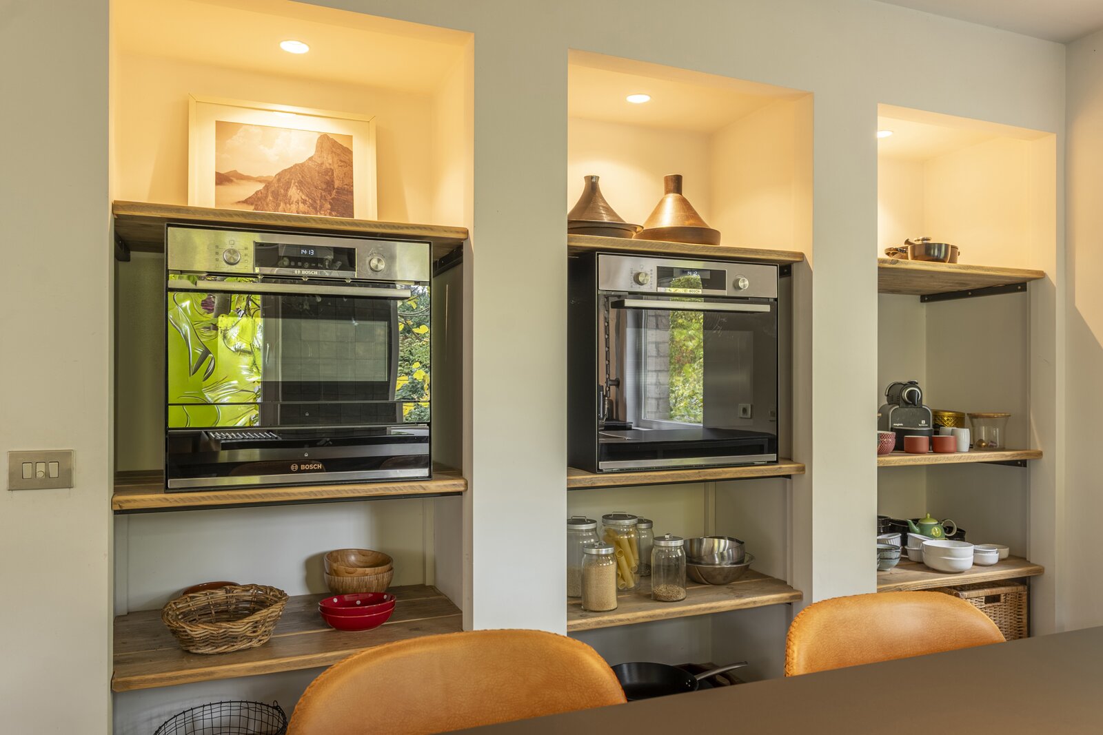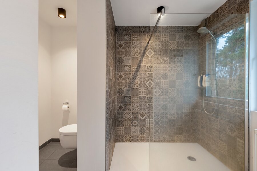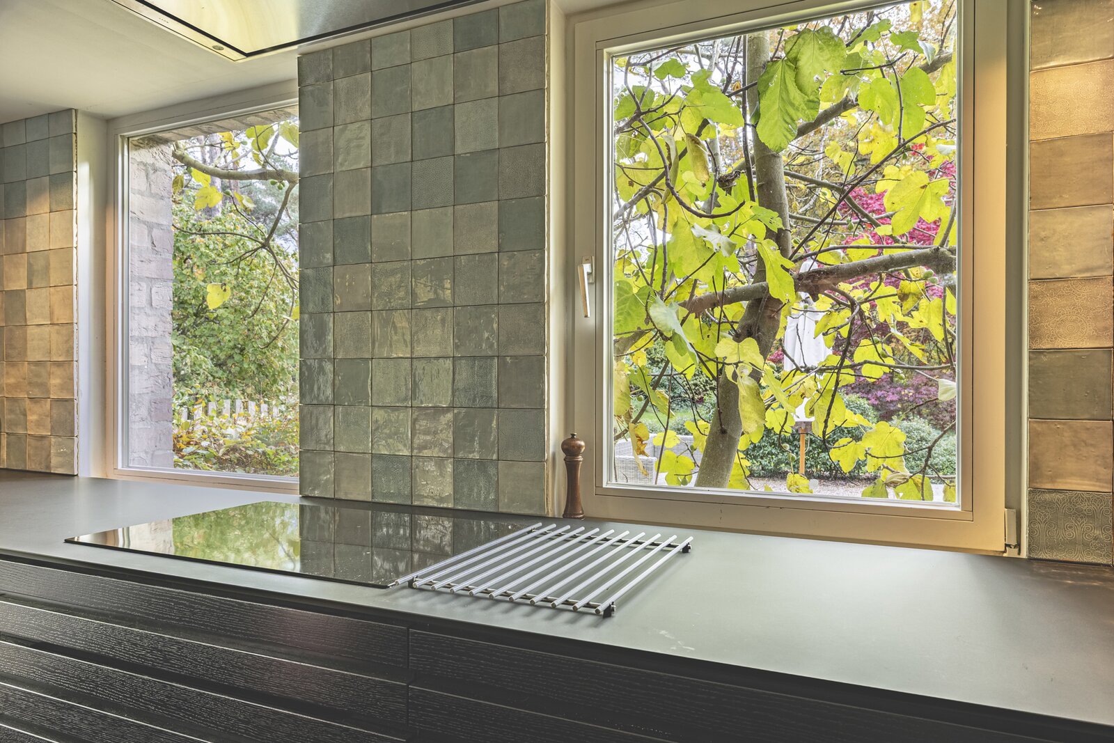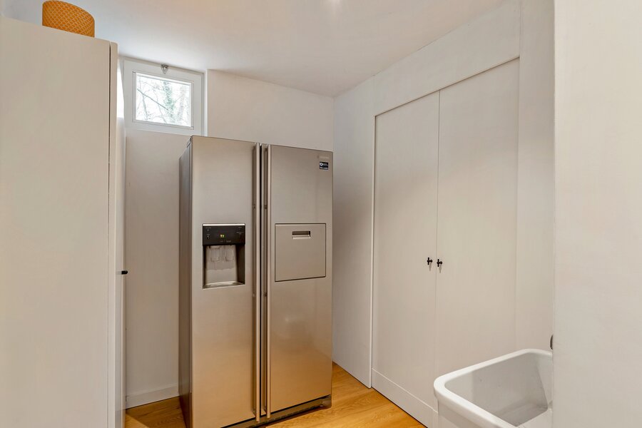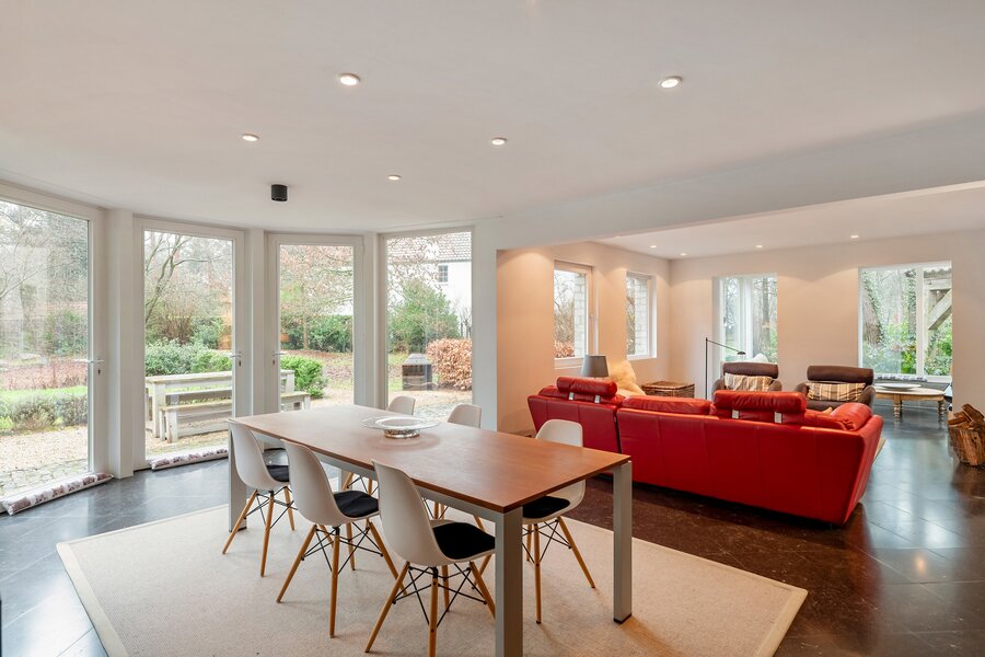 Gelijkvloerse verdieping: De ruime inkomhal biedt plaats voor een vestiaire en een apart gastentoilet met handenwasser. De lichte woonkamer heeft een gezellige erker als extra zitplaats en een open haard op hout. Aansluitend is er een aparte bureauruimte met ingemaakte kasten. De keuken is uitgerust met kwaliteitstoestellen: vaatwasser (Bosch), oven met warmtelade (Bosch), microgolf (Bosch), inductiekookplaat met dampkap (Novy). Naast de keuken bevindt zich een bijkeuken met een Amerikaans koelkast, die toegang biedt tot de wasplaats en de kelder.