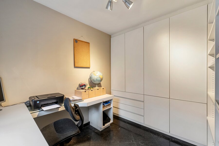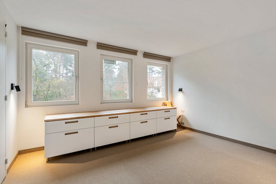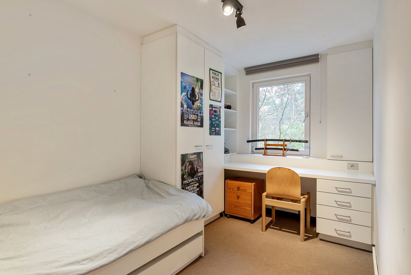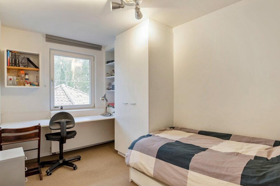 Eerste verdieping: De woning beschikt over 4 slaapkamers, waarvan twee met ingemaakte kasten, bed en bureau. De tweede slaapkamer heeft een ensuite badkamer met bad, enkele wastafel en ingemaakte kasten. De eerste badkamer (verbonden met de tweede, maar met aparte toegang) beschikt over een douche, toilet en dubbele wastafel.