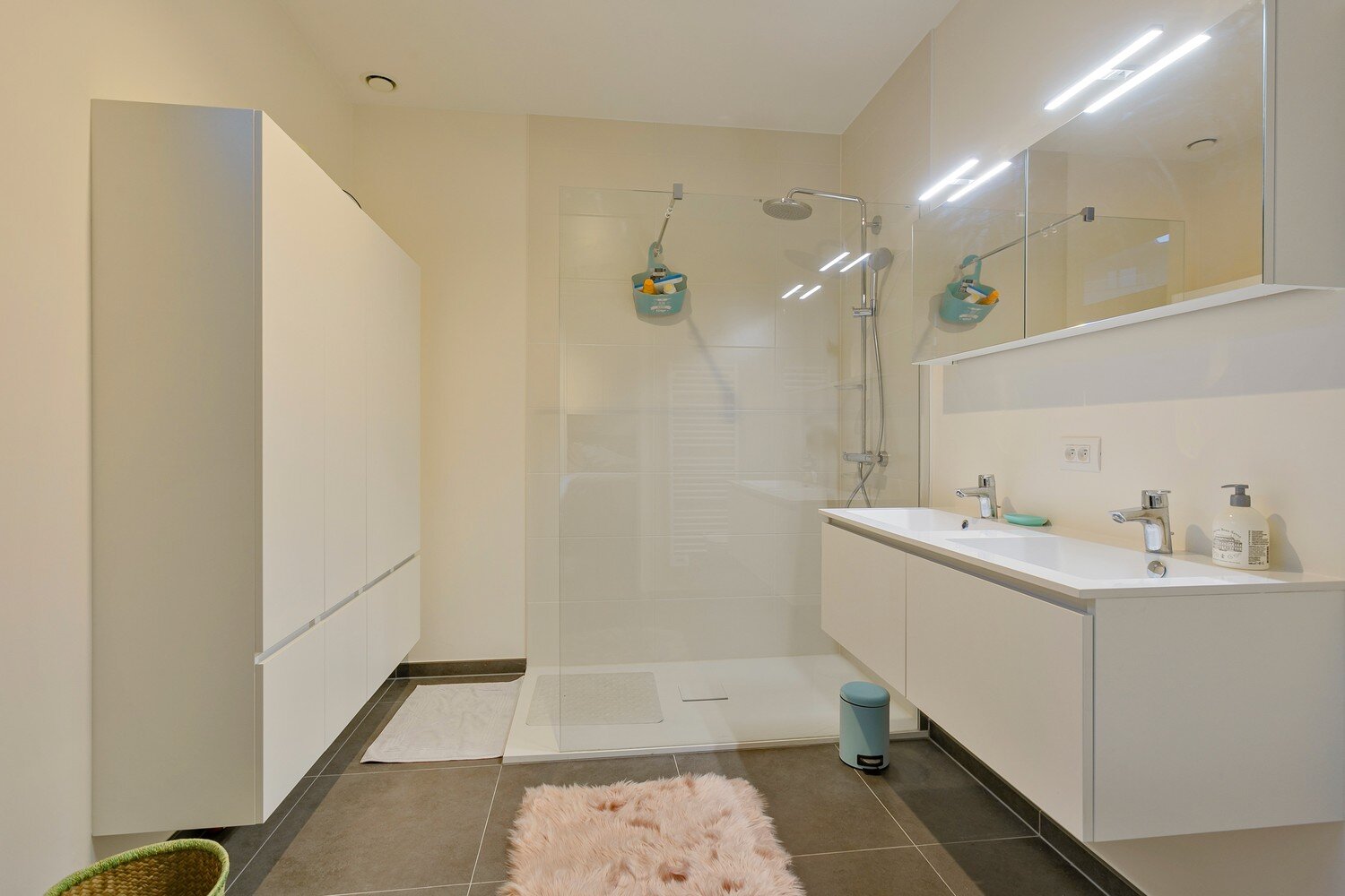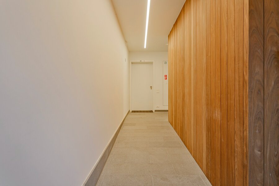 U komt binnen in de inkomhal. Deze is voorzien van een ruime vestiairekast en een gastentoilet. De eerste kamer, de master bedroom heeft zicht op de gemeenschappelijke tuin. Deze kamer is voorzien van een aparte dressing, ingemaakte kasten en een eigen, ensuite badkamer met grote inloopdouche. Zowel badkamer als slaapkamer hebben toegang tot het terras. De tweede kamer kan dienen als slaapkamer, hobbyruimte of bureau. Ook deze kamer heeft een eigen terras. De derde slaapkamer is eveneens voorzien van ingemaakte kasten. Aan de rechterzijde van de hal bevinden zich een douchekamer en een berging.
