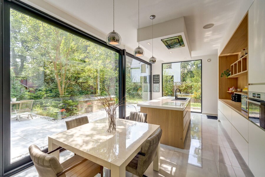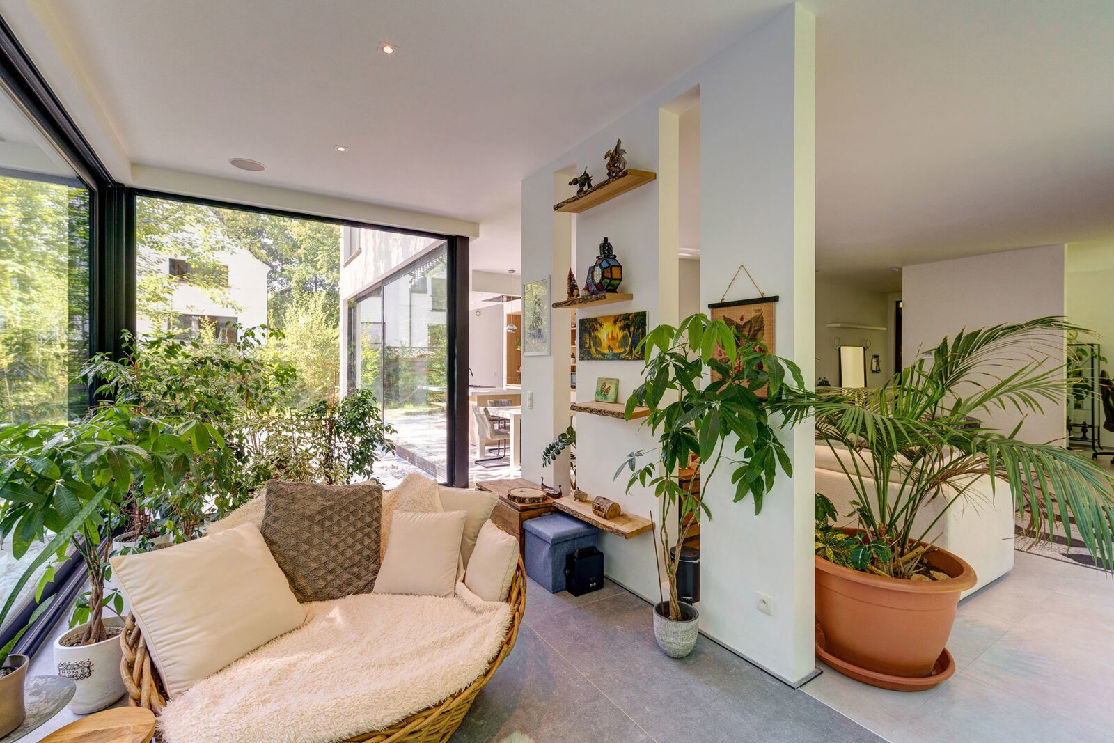 De leefruimte vormt het hart van de woning en loopt vloeiend over in de stijlvolle, maatwerkkeuken en de gezellige veranda met uitzicht op de tuin.
