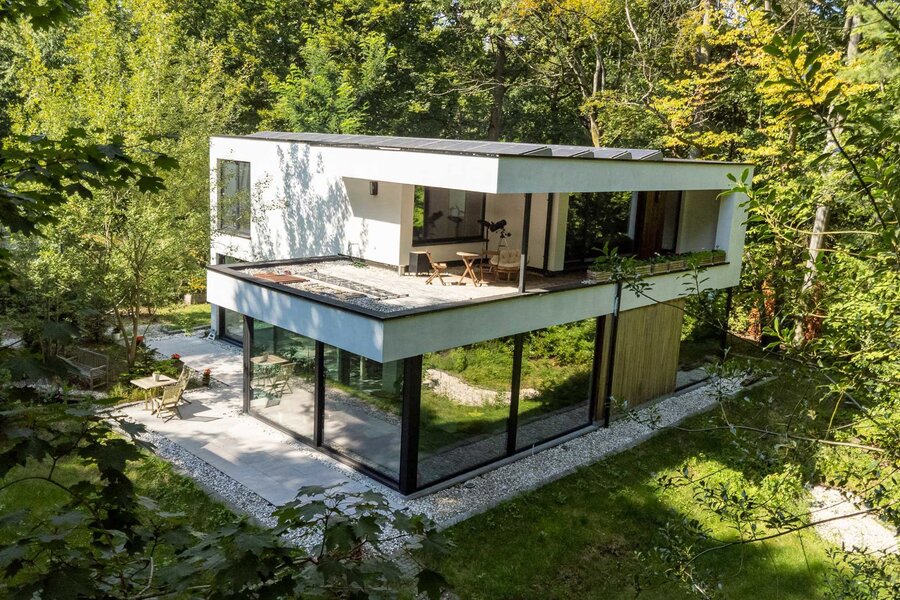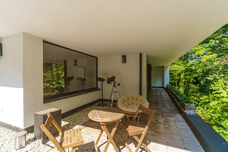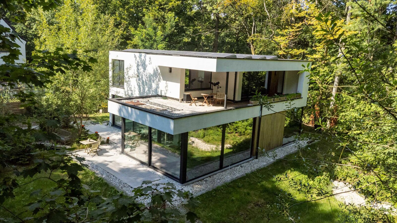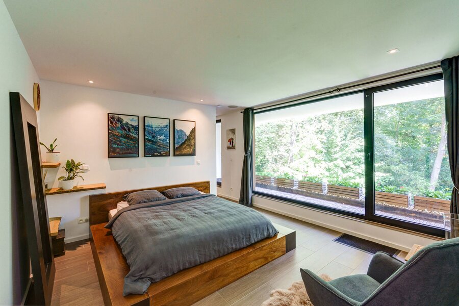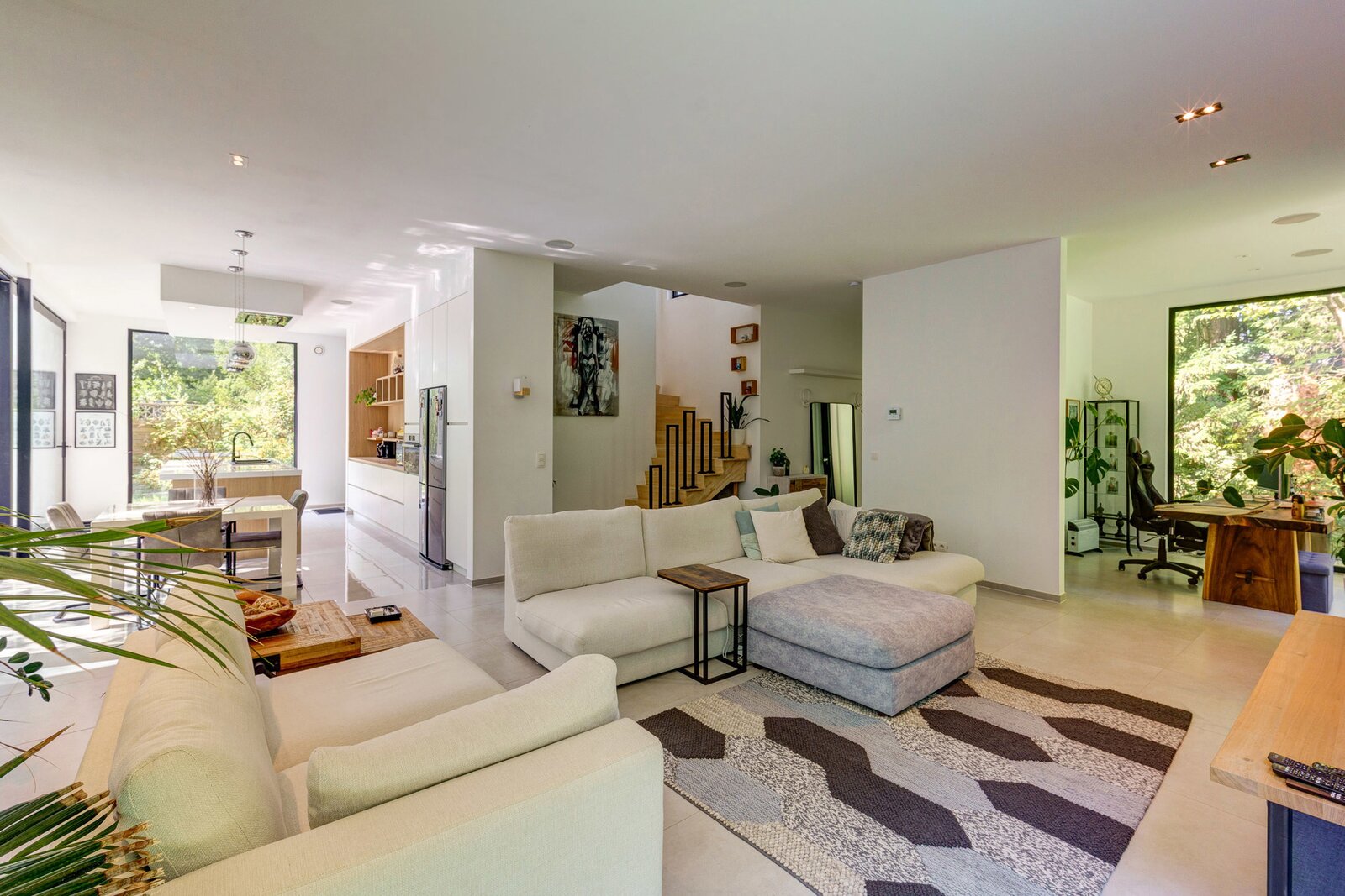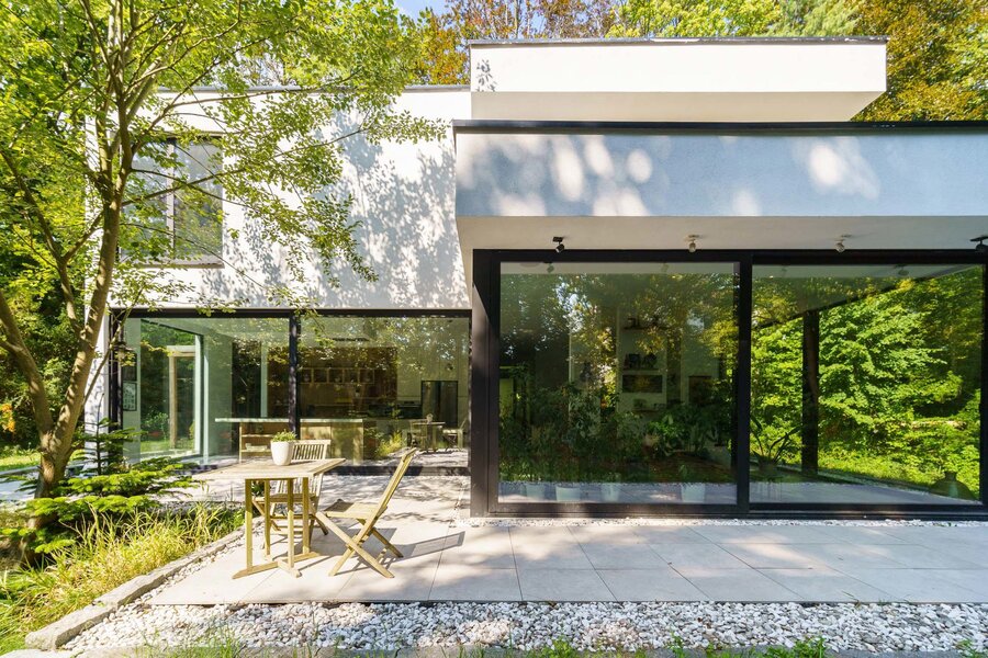 Het strakke lijnenspel, de hoge plafonds en de enorme raampartijen tot op de vloer zorgen voor een spectaculaire woonbeleving. Overal in huis geniet je van licht en ruimte, terwijl de natuur letterlijk binnenstroomt.