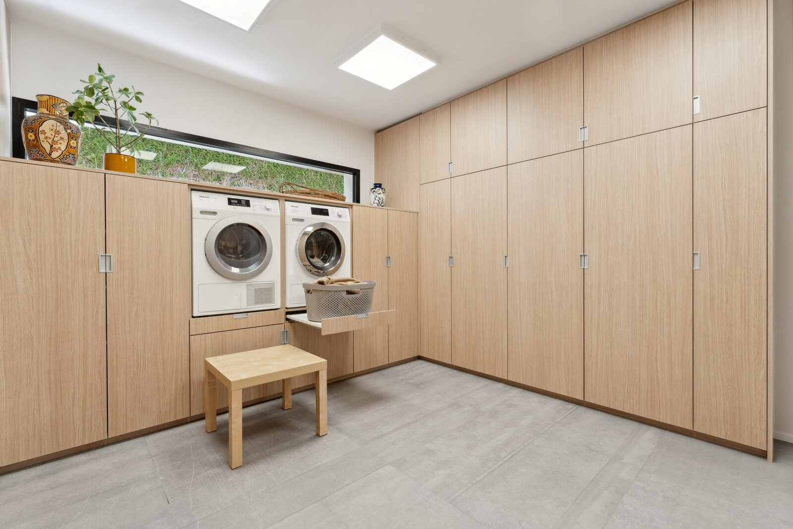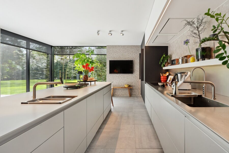 De keuken is voorzien van hoogwaardige apparatuur en doordachte extra’s, waaronder een groot inductievuur, twee vaatwassers, twee spoelbakken met vergruizers, wijnkoeler, warmtelade, V-ZUG oven en V-ZUG combi-oven/microgolf, Aqualex kraan, ingebouwde snijmachine en een aangename ontbijt- en koffiehoek. Aansluitend bevindt zich een ruime berging met extra koelruimte en een directe buitentoegang.