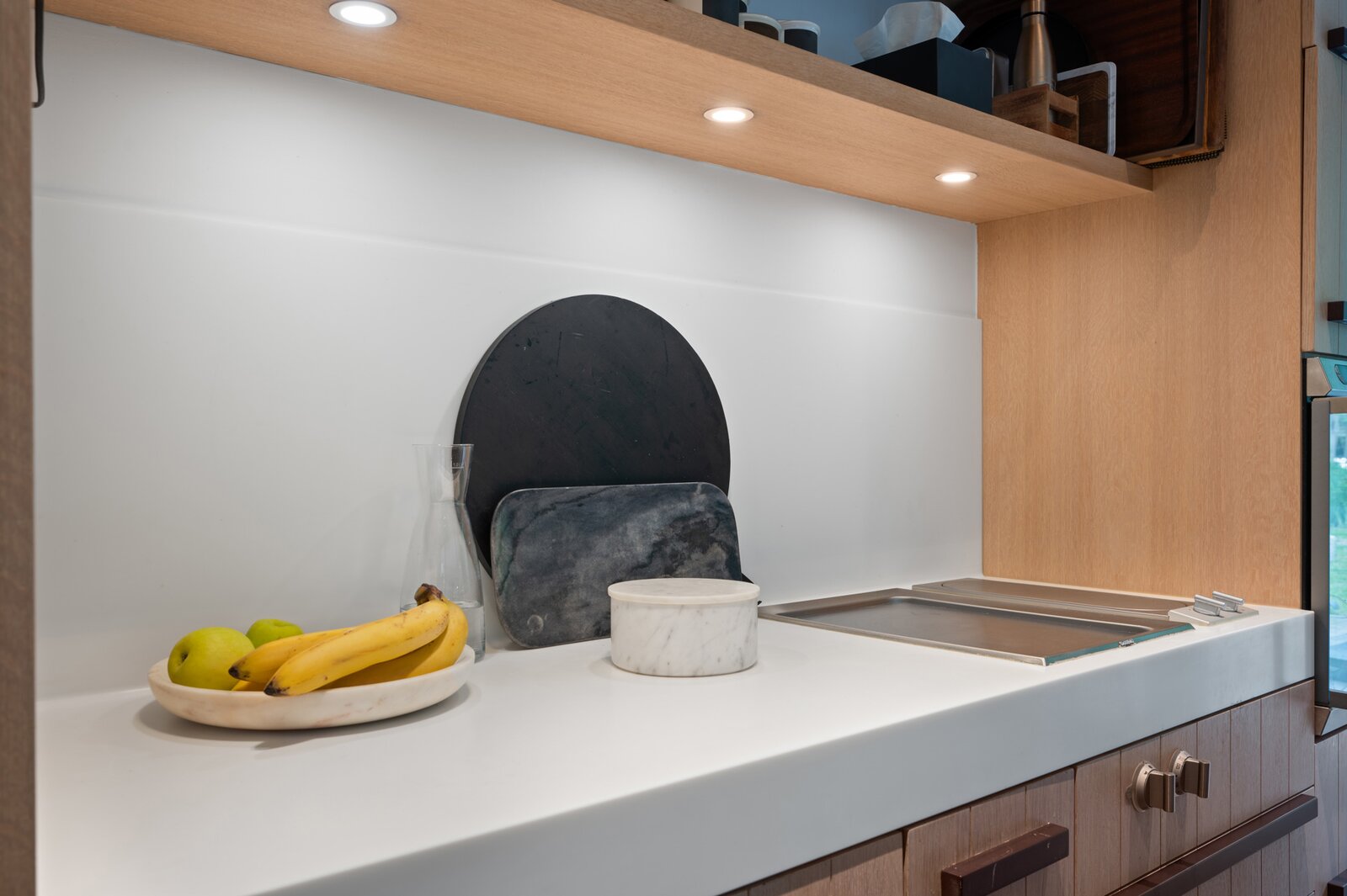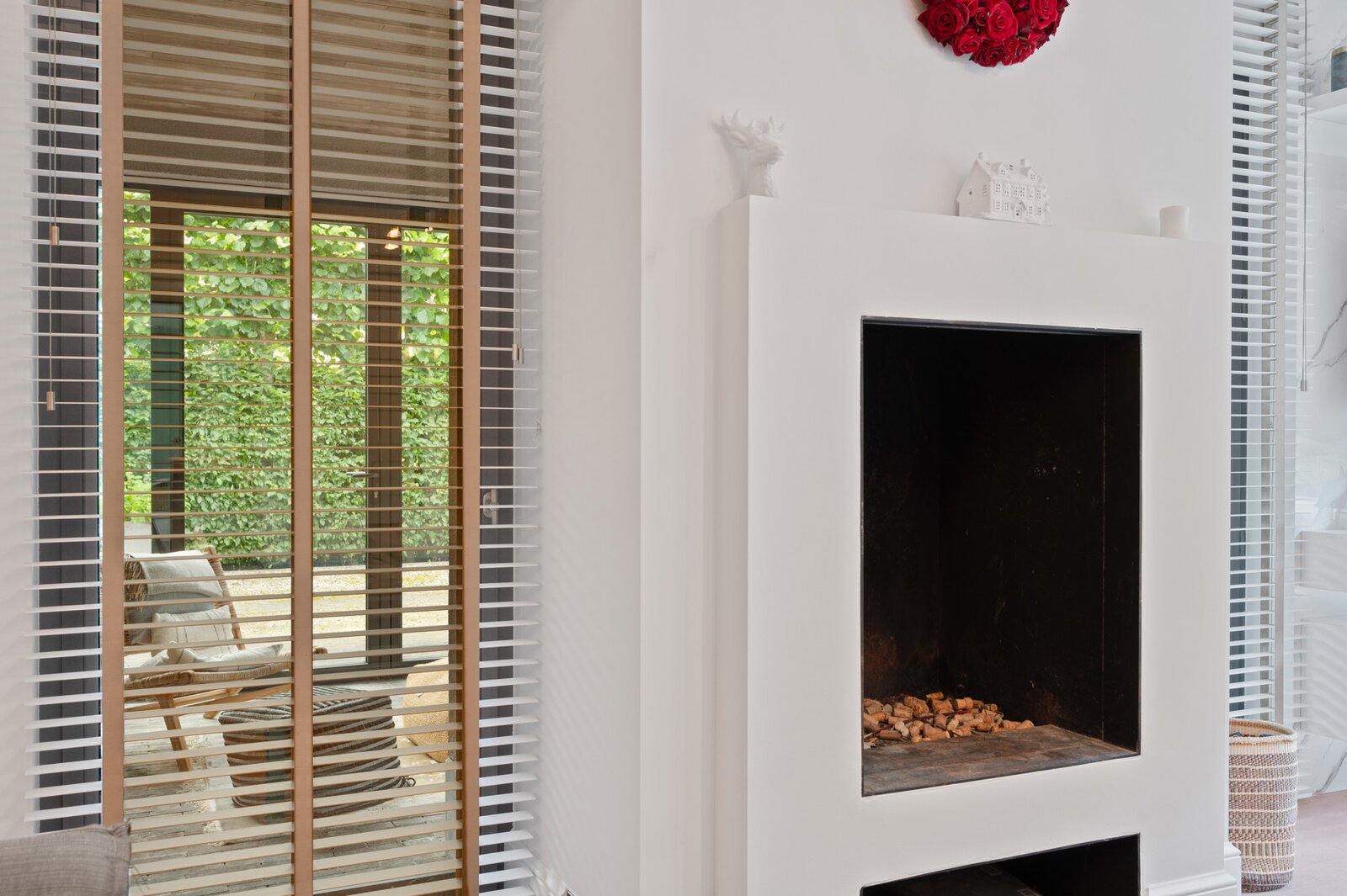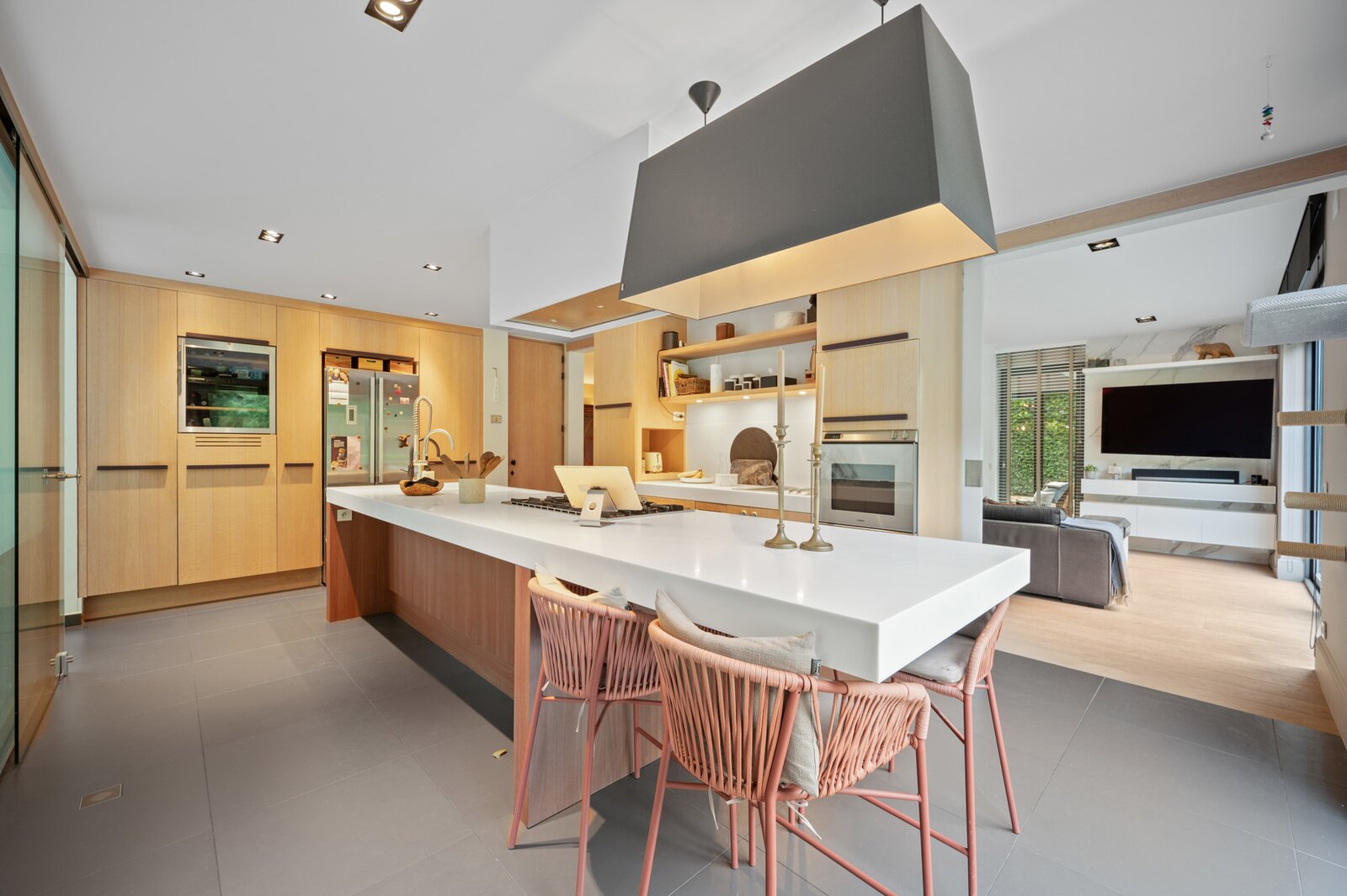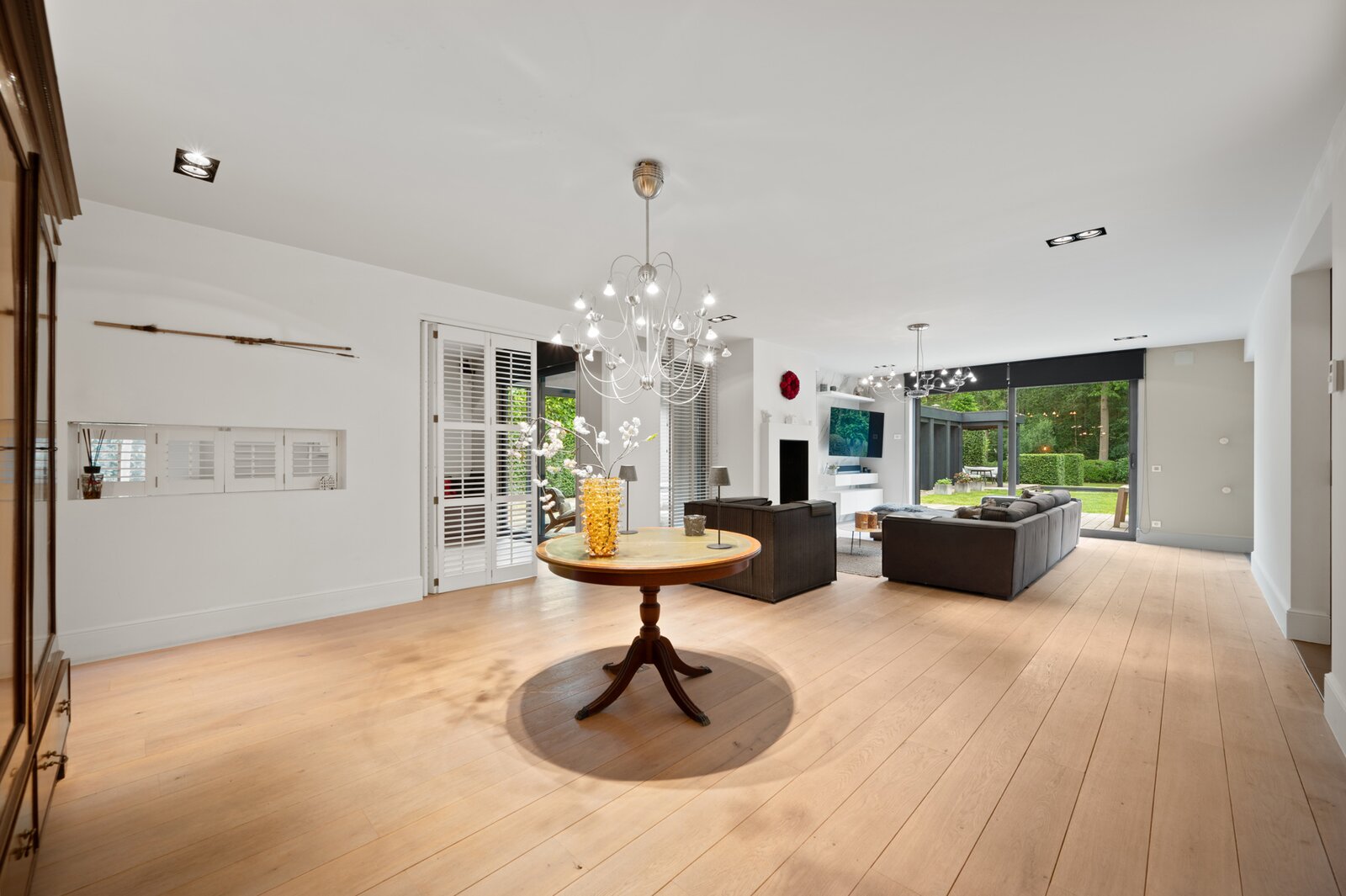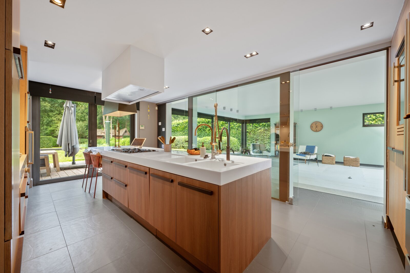 Bij het betreden van de woning komt u in de inkomhal, voorzien van een gastentoilet en vestiaire(kamer). Vanuit de hal bereikt u de ruime en lichtrijke leefruimte met open haard en toegang tot een apart, overdekt terras dat afsluitbaar is en eveneens beschikt over een sfeervolle open haard. Aansluitend bevindt zich een bureauruimte, terwijl de leefruimte naadloos overgaat in de hyper-geïnstalleerde keuken, uitgerust met onder andere een gasfornuis, teppanyaki-plaat en wijnkoelkast.