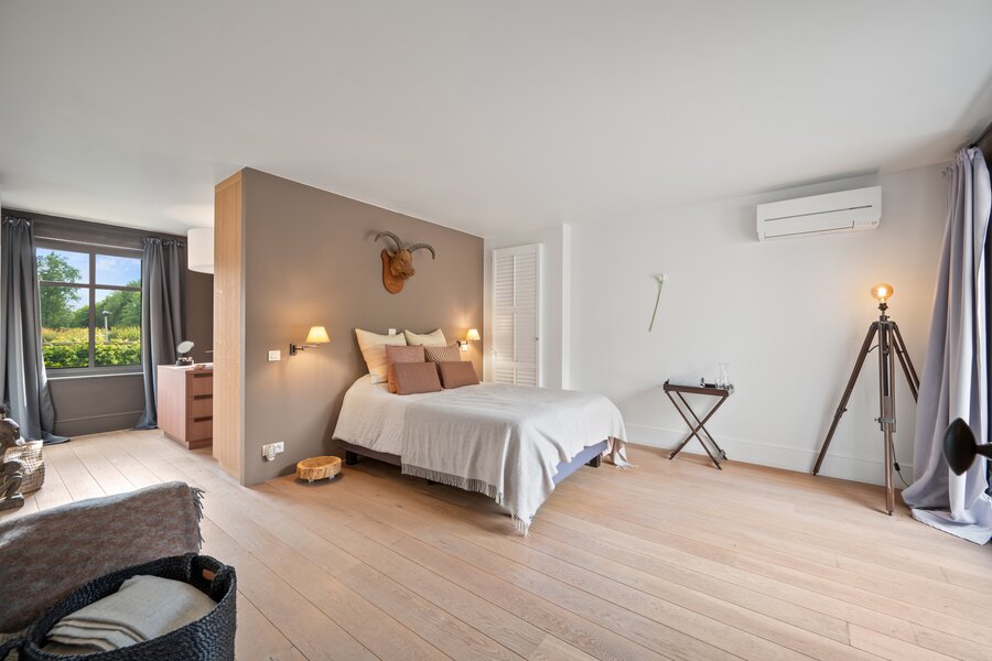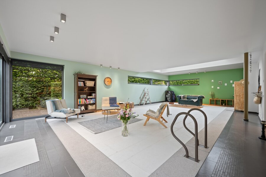 Verderop bevindt zich een polyvalente ruimte van maar liefst 72 m². Deze ruimte is een groot binnenzwembad dat opnieuw geactiveerd kan worden en vandaag ingericht is als een lounge ruimte en bureau. Daarnaast vindt u op het gelijkvloers ook een aparte badkamer met ligbad, dubbele lavabo en toilet.