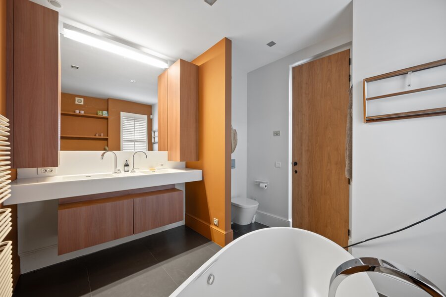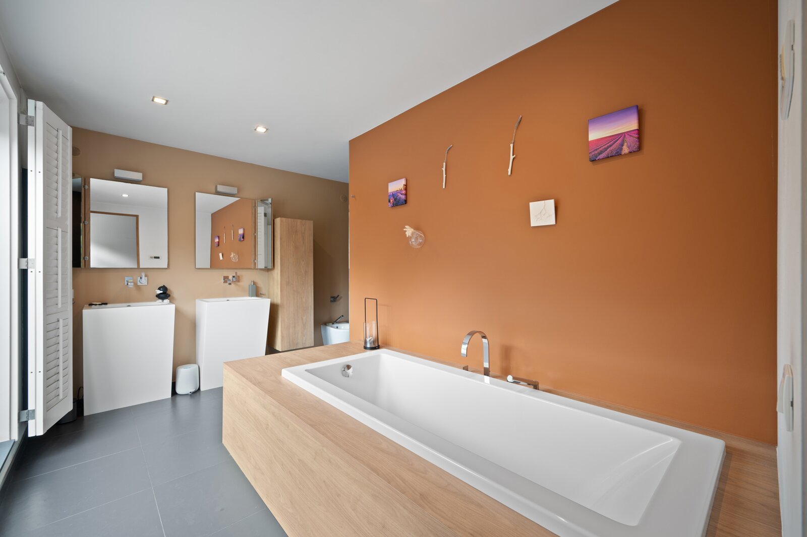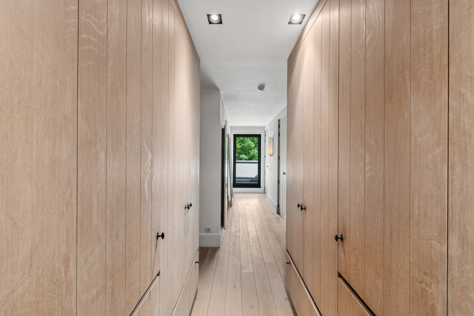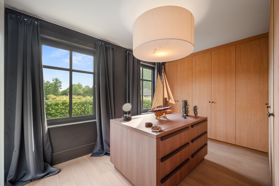 Op de eerste verdieping komt u via de ruime nachthal met ingemaakte kasten bij drie volwaardige slaapkamers, een master bedroom met eigen dressing en privéterras, en een badkamer met ligbad, inloopdouche, dubbele lavabo en toilet. Tevens is hier een aparte wasruimte voorzien.
