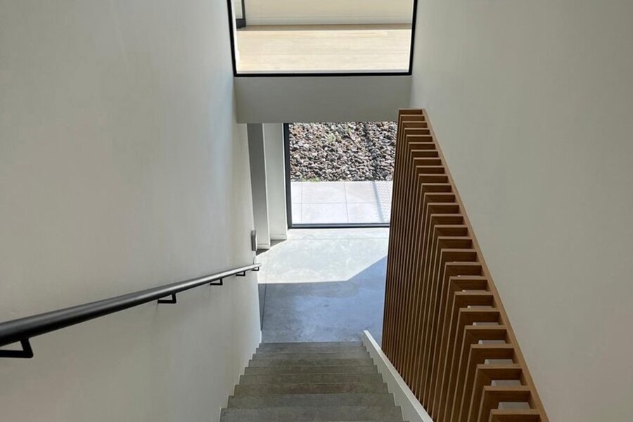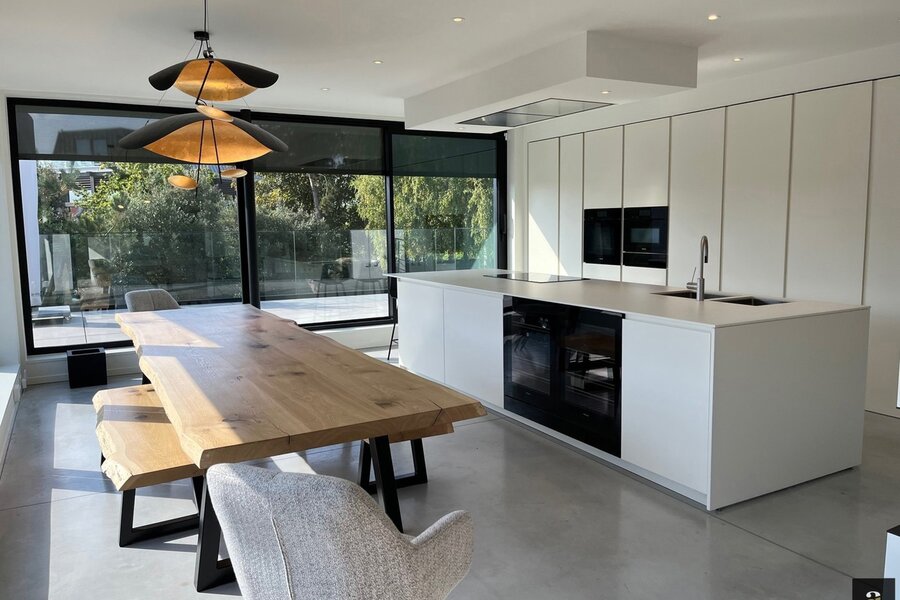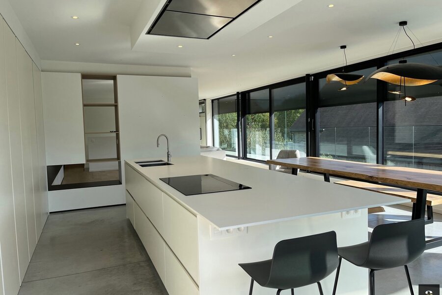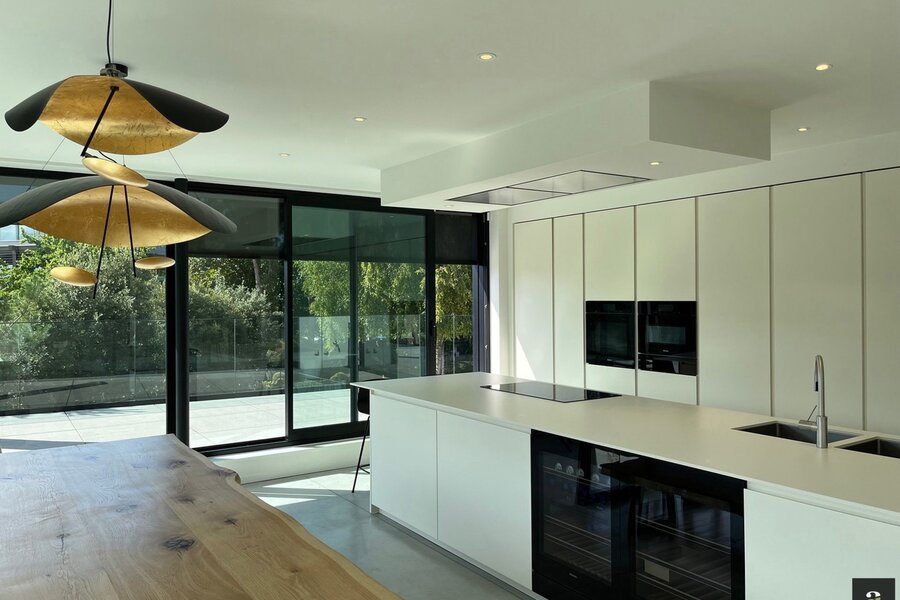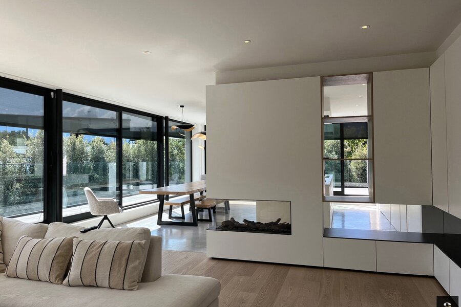 First floor: bright living and dining area with gas fireplace. Modern open-plan kitchen fully equipped with Miele appliances. Both living spaces provide access to the sunny terraces. Separate office. Toilet. Parking spaces in front of the house.