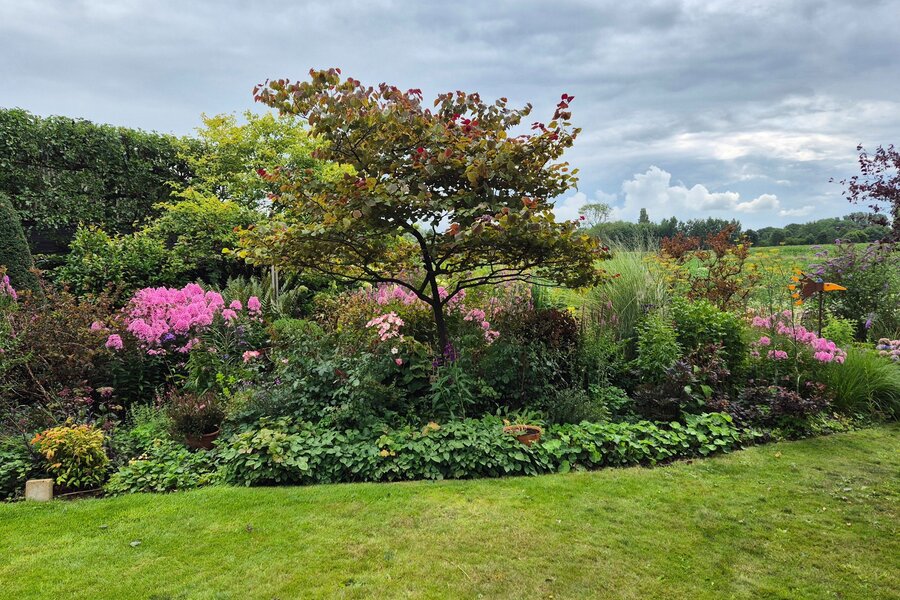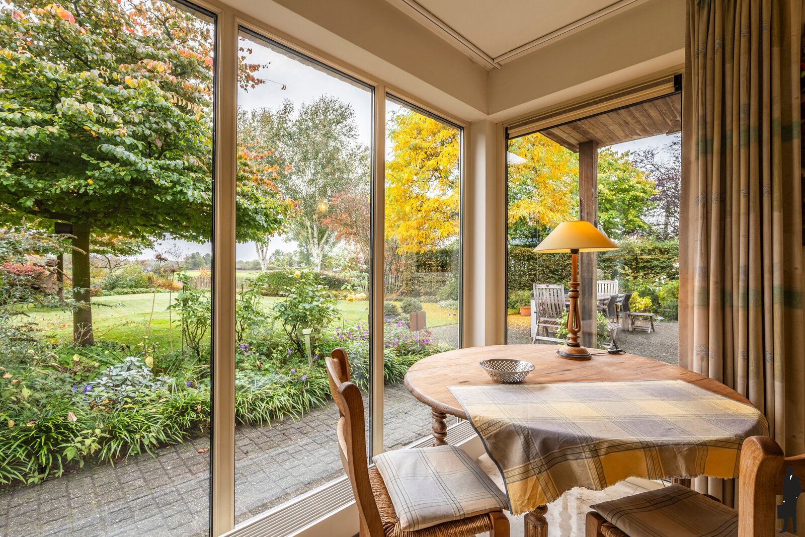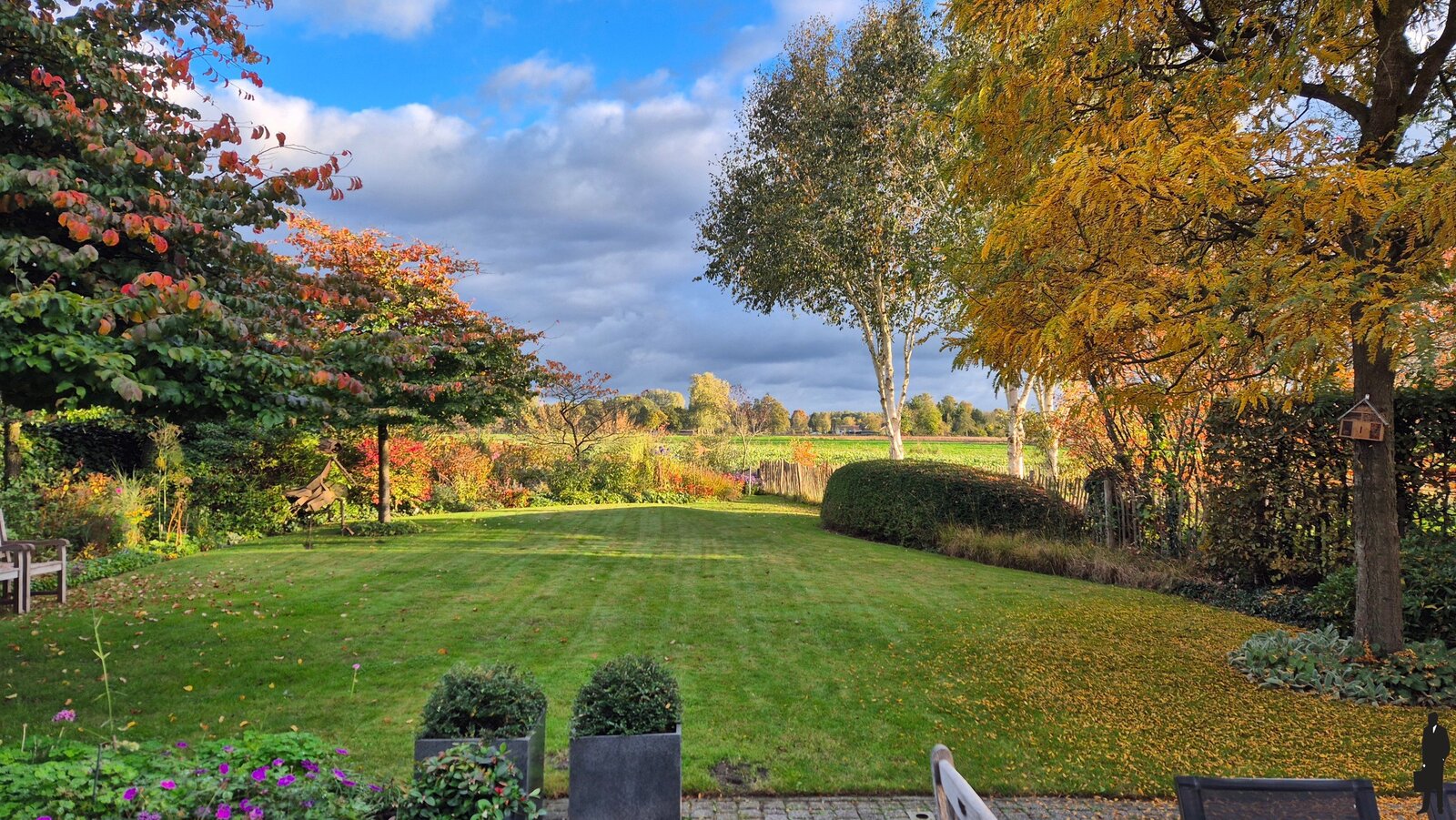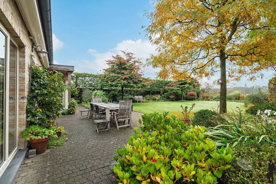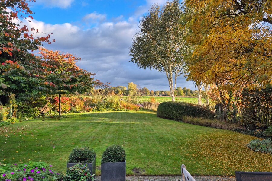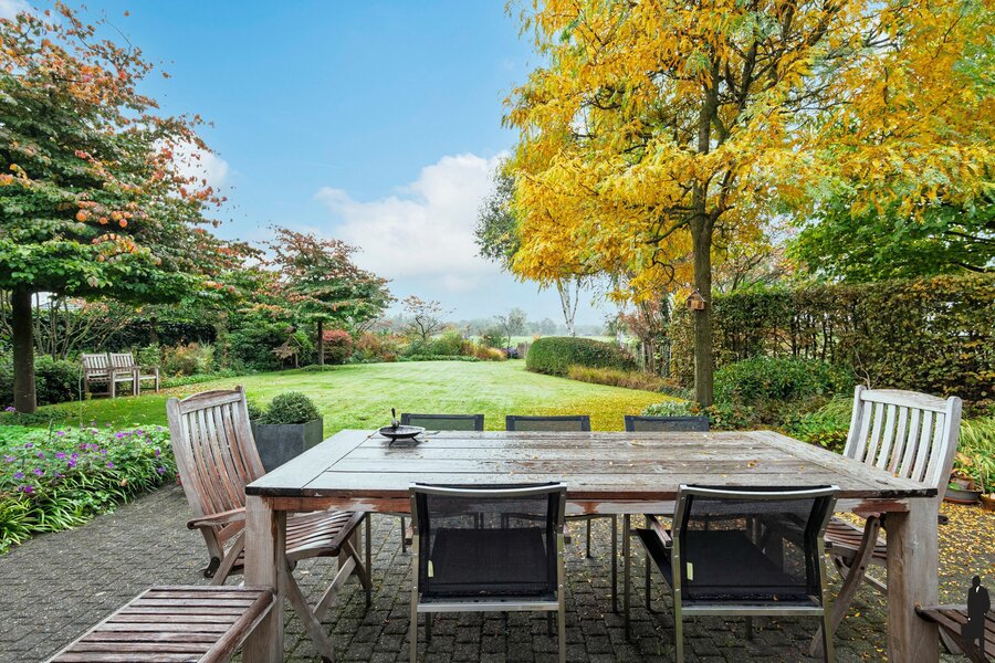 De aangename fraai aangelegde achtertuin heeft een fijn terras en grenst aan weilanden dus geniet u van vrij uitzicht en geen achterburen.