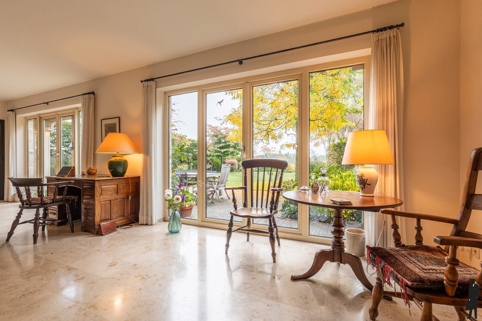 Vanuit de hal komt u in de ruime woonkamer met zicht op de tuin en voorzien van een natuurstenen vloer en een gezellige houtkachel met ventilatie. Aan de tuinzijde zijn er 2 dubbele openslaande tuindeuren waardoor er veel lichtinval is.