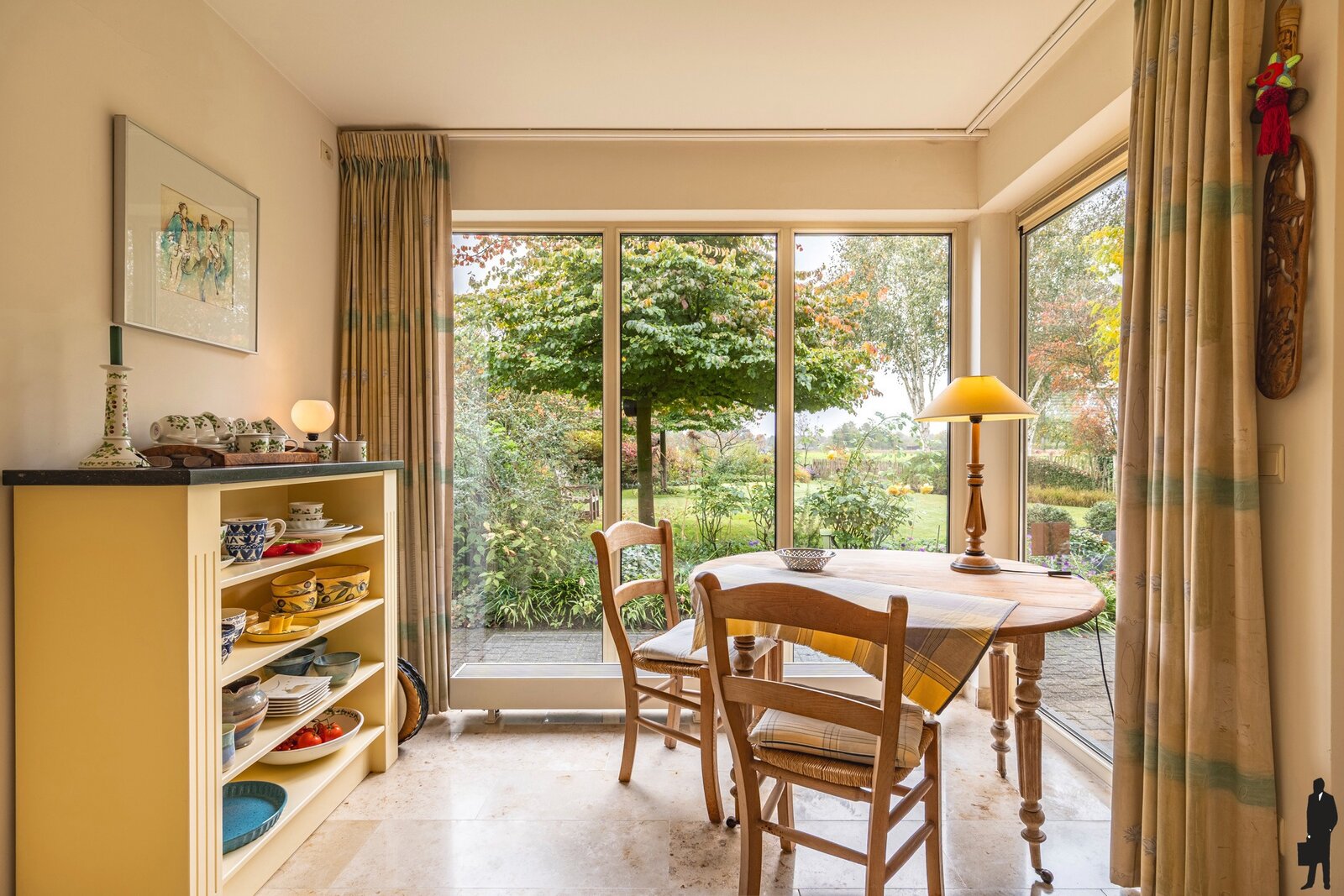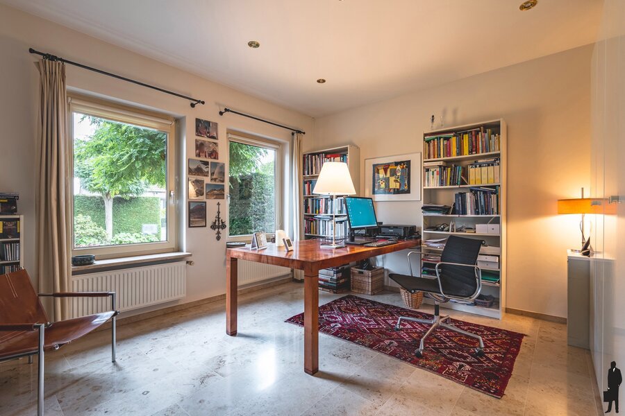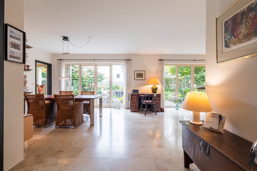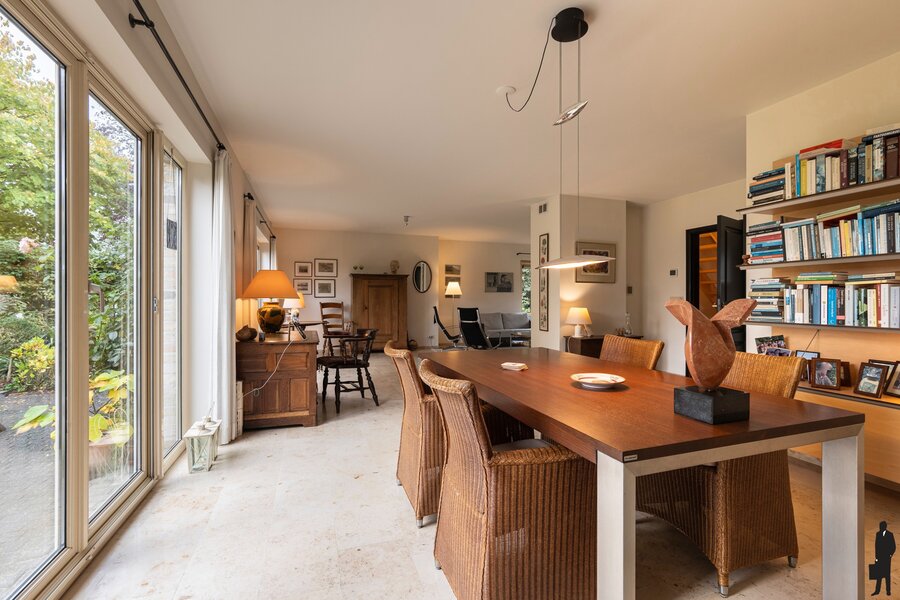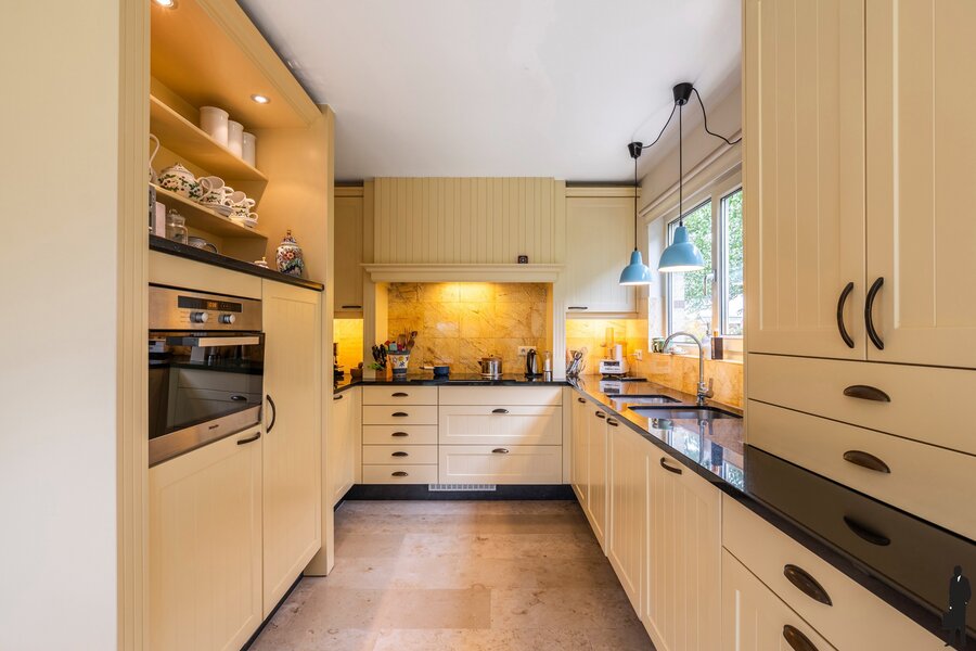 De aangrenzende keuken is voorzien van luxe keukeninrichting met de nodige kwaliteitsapparatuur en er is een praktische berging/bijkeuken.