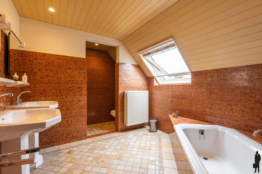 De badkamer is ruim en is voorzien van een ligbad, douche, dubbele wastafel en toilet. In de badkamer is vloerverwarming aanwezig.