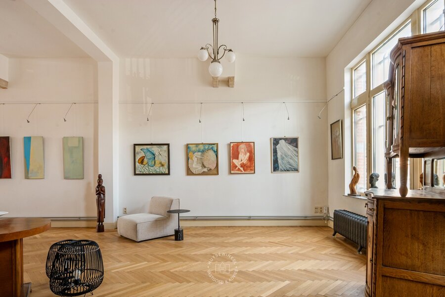De eerste verdieping herbergt het ruimste appartement met een oppervlakte van 141 m². Ook hier komen de authentieke elementen volledig tot hun recht, zoals de hoge plafonds, parketvloeren en dubbele deuren met melkglas. De leefruimtes genieten van veel natuurlijk licht en bieden een mooi zicht op de Onze-Lieve-Vrouwekerk. Via een tussenverdieping bereikt u de nachthal, die toegang geeft tot twee ruime slaapkamers en de badkamer.