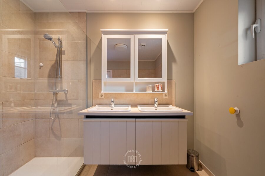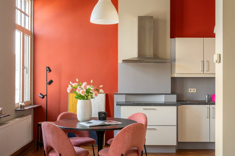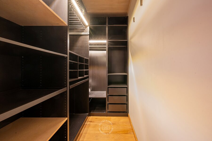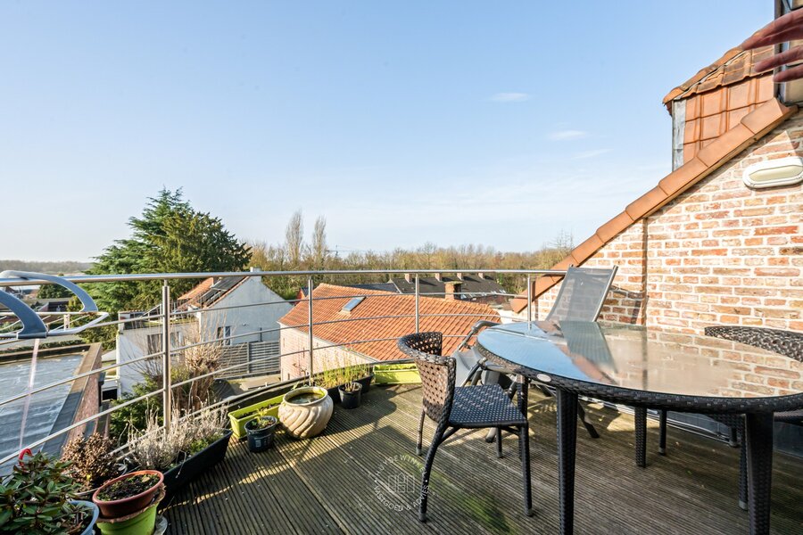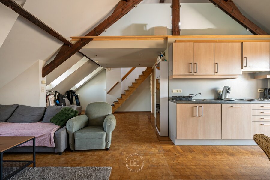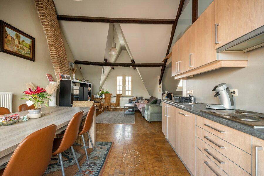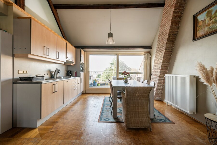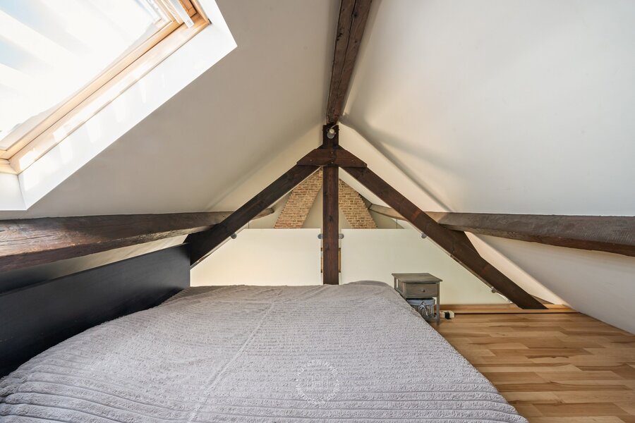 Op de tweede verdieping bevindt zich nog een derde appartement (65 m²) met één slaapkamer. Ook hier vinden we prachtige parketvloeren en een open plafond tot in de nok van het dak. Vanop het terras van dit appartement geniet u bovendien van een mooi zicht op de Schelde.