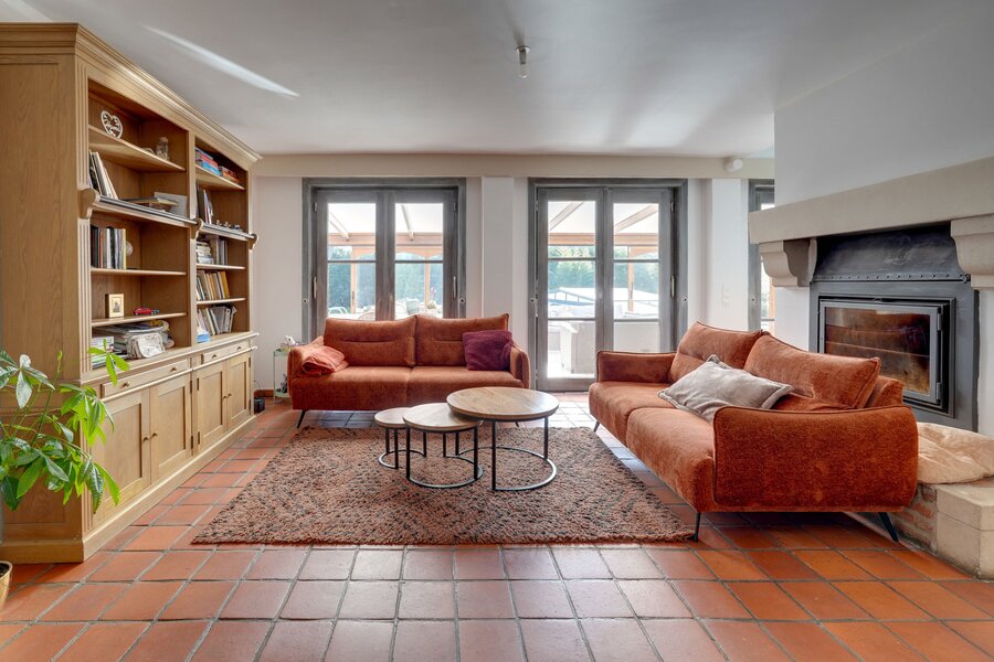 On the ground floor: You will discover a spacious entrance hall with WC and washbasin, providing access to a double garage of approximately 38 m² equipped with two motorized doors. A wine cellar with a capacity of up to 4,000 bottles will delight enthusiasts. The spacious 65 m² living room, enhanced by beautiful exposed beams and a double-sided wood-burning insert, offers a warm living space including a lounge and dining room. The large adjoining kitchen, fully equipped and approximately 28 m², completes this space. A bathroom with whirlpool bath, hydromassage shower, double natural stone sink and separate WC. A laundry room with washing area as well as a remarkable 70 m² veranda, filled with natural light and offering an open view of the garden, complete this level.