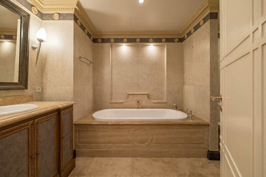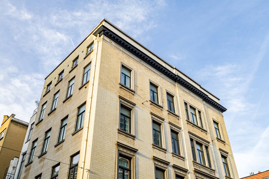 Close to Place du Châtelain and Avenue Louise, spectacular ground floor duplex with a surface area of ± 185 m², featuring an English courtyard located in a beautiful, impressive neo-classical building dating from 1890, offering a living room with a mezzanine, separate dining room and fully equipped kitchen. On the English courtyard level: multipurpose room for home cinema, master bedroom with dressing room, second bedroom or study, bathroom/shower/WC. Cellar. PEB D