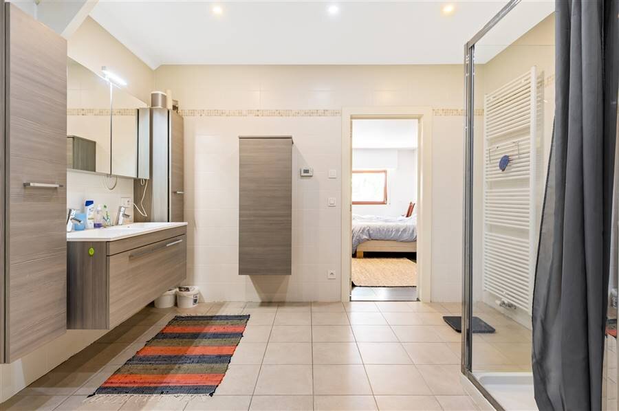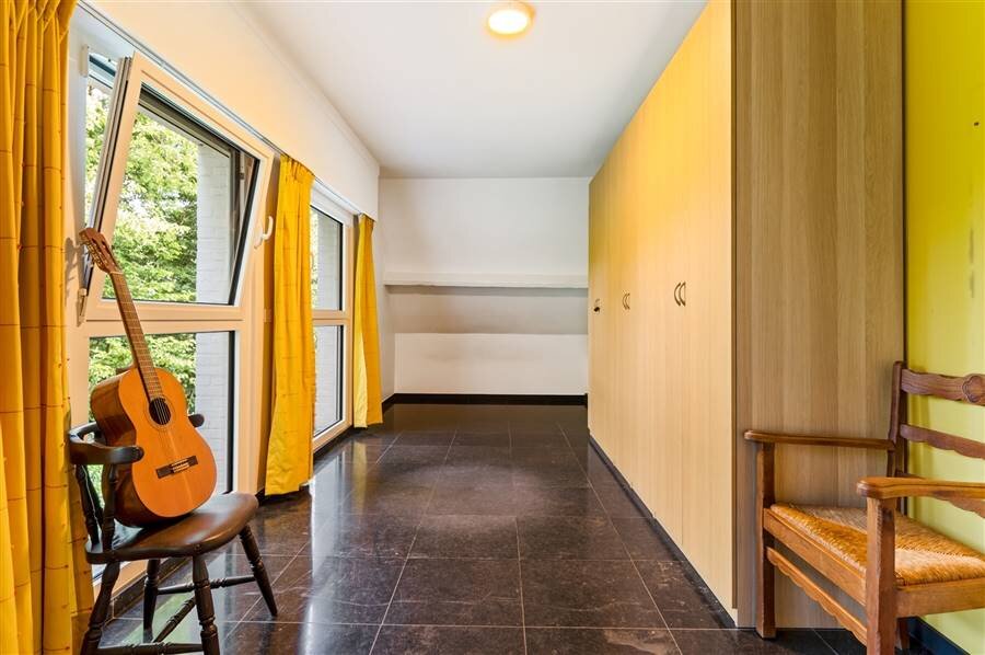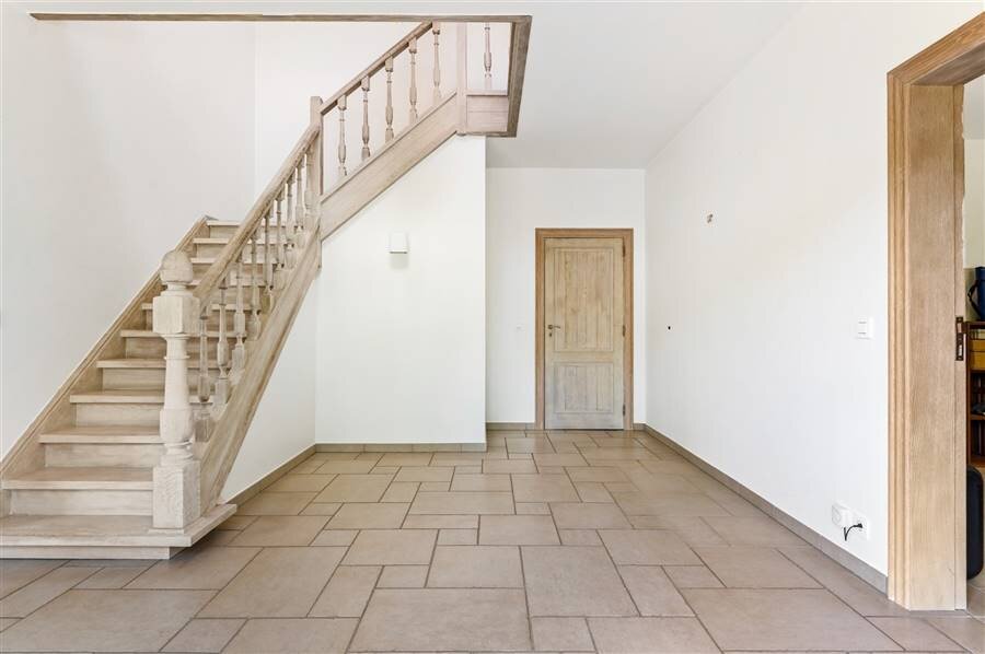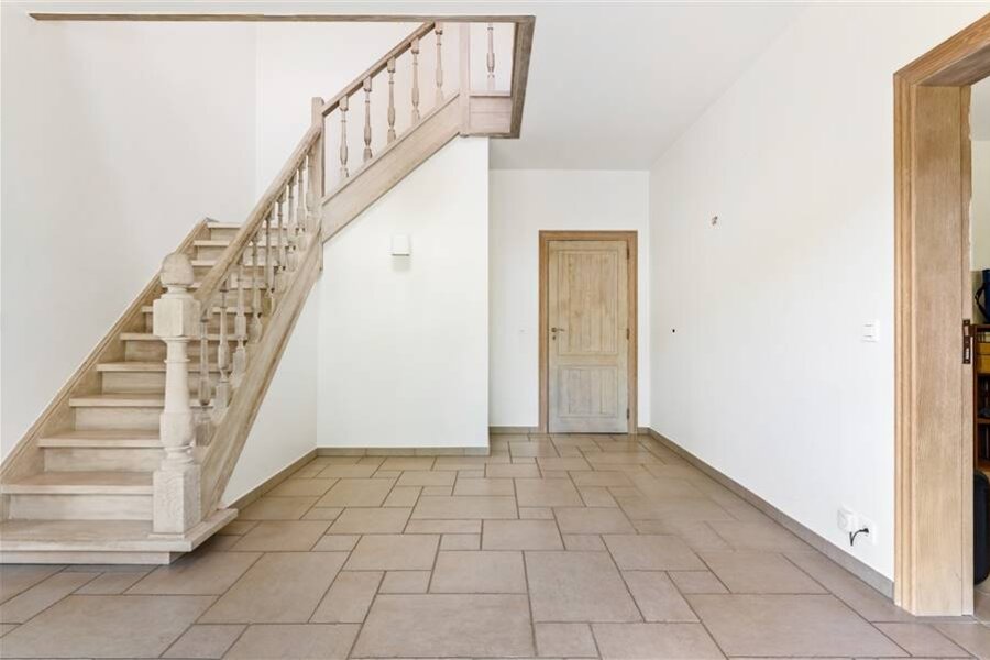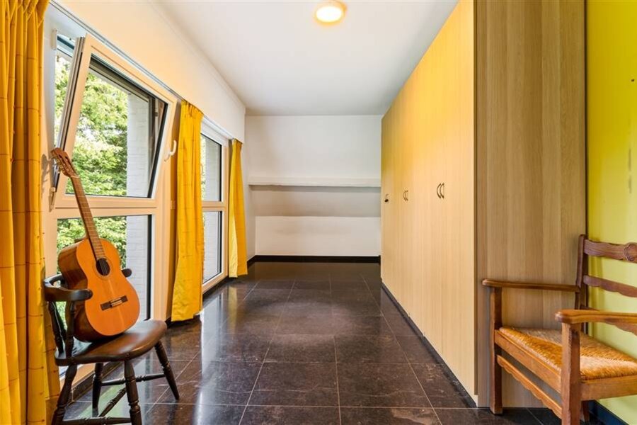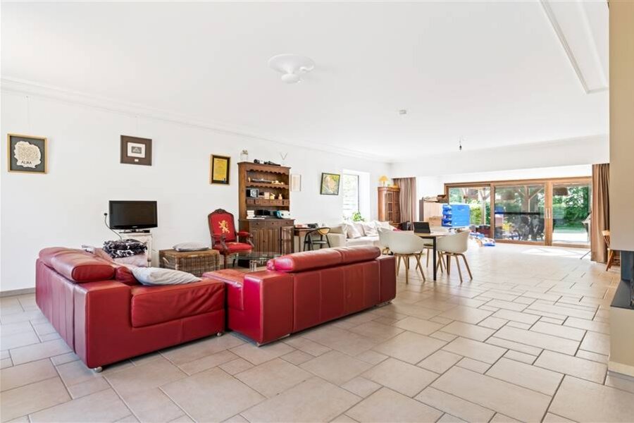De gelijkvloerse verdieping biedt een ruime inkomhal, een sfeervolle woonkamer met gashaard en een lichtrijke eetruimte met schuiframen naar het overdekte terras.