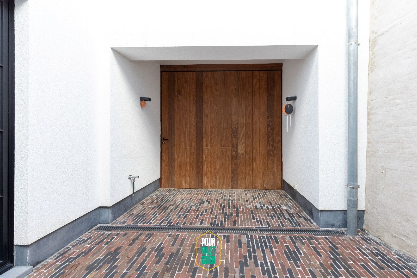Aansluitend aan de keuken kan je naar de garage van bijna 45m². Er kunnen 2 wagens in en daarnaast is er nog plaats voor wasruimte en berging. In de garage is uitgerust met een grote elektrische poort en ook een gevelbrede pivoterende deur naar het terras. Een terras waarop het - mooi ingesloten en zonder inkijk - het hele jaar door gezellig toeven is.