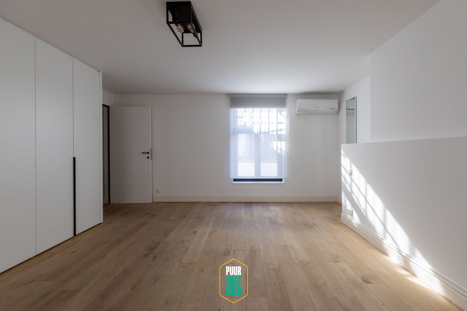 Op de eerste verdieping bevinden zich de riante master bedroom met maatkasten, een even royale badkamer met douche, ligbad, afgescheiden toilet en een dubbele lavabo en tenslotte nog een slaapkamer.