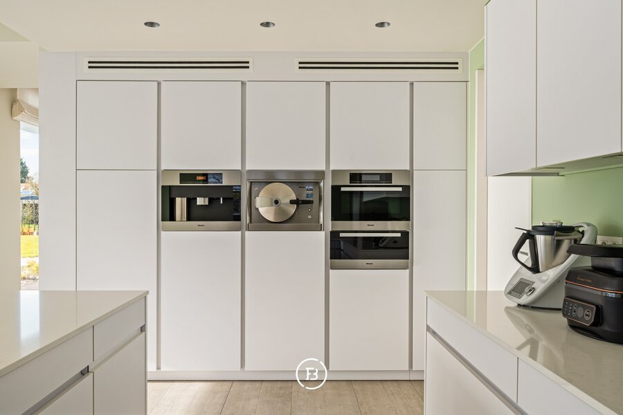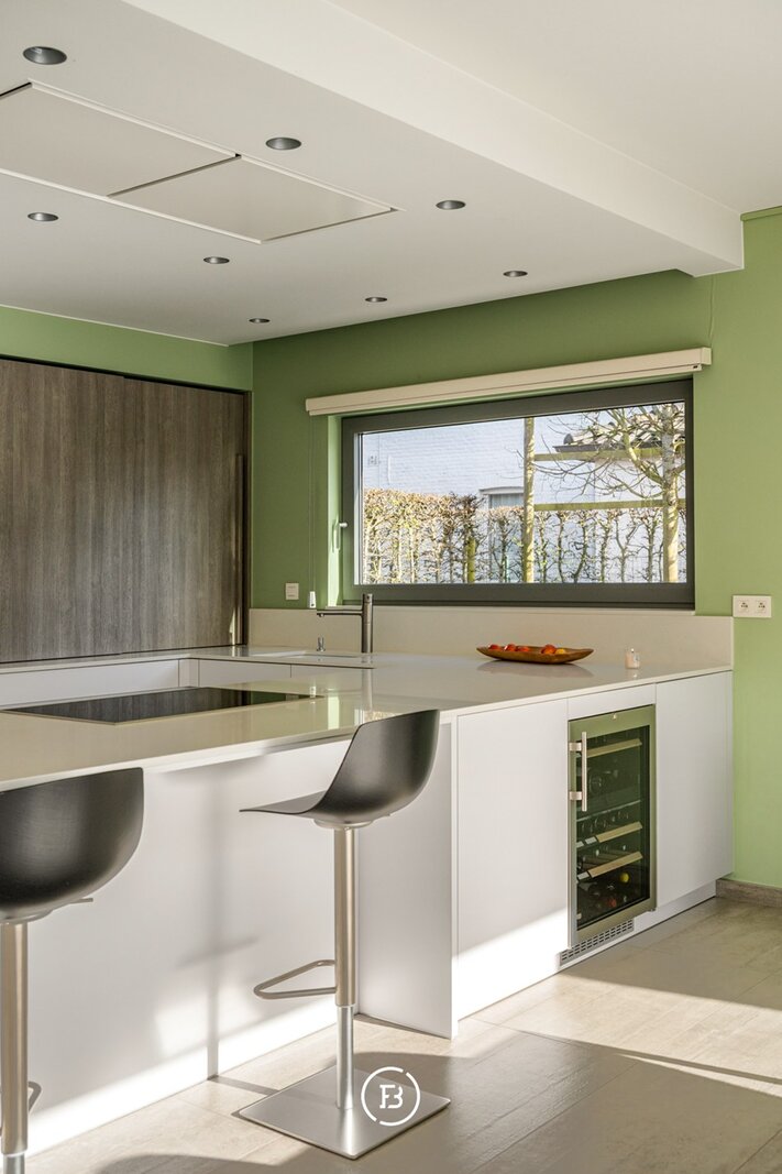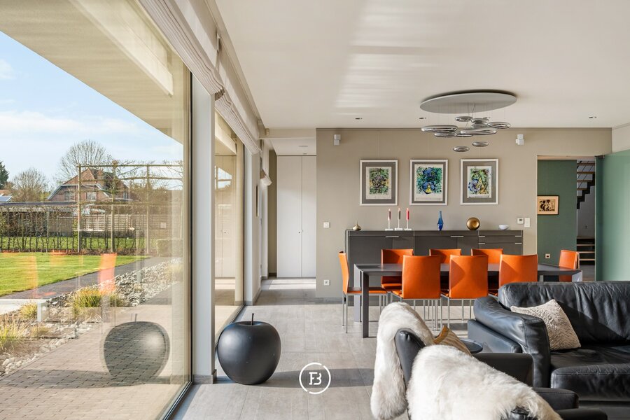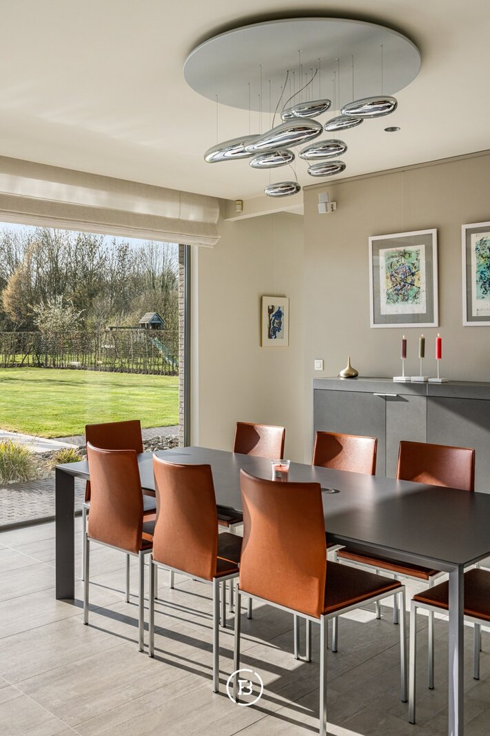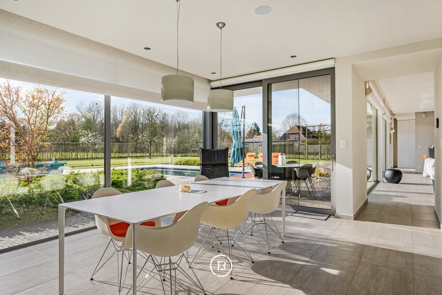 De woning verwelkomt u via een ruime inkomhal met vestiaire en gastentoilet. De leefruimtes zijn bijzonder lichtrijk en worden gekenmerkt door grote raampartijen die zorgen voor een constante connectie met de tuin en het zwembad. De open indeling met zithoek, eetplaats en volledig uitgeruste keuken creëert een aangename en functionele leefomgeving.