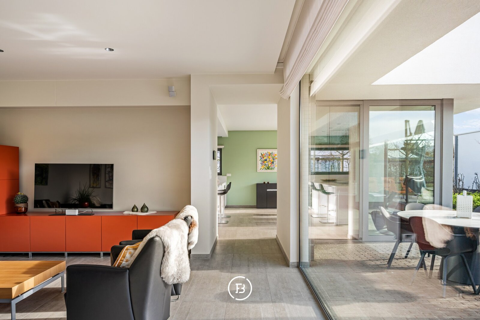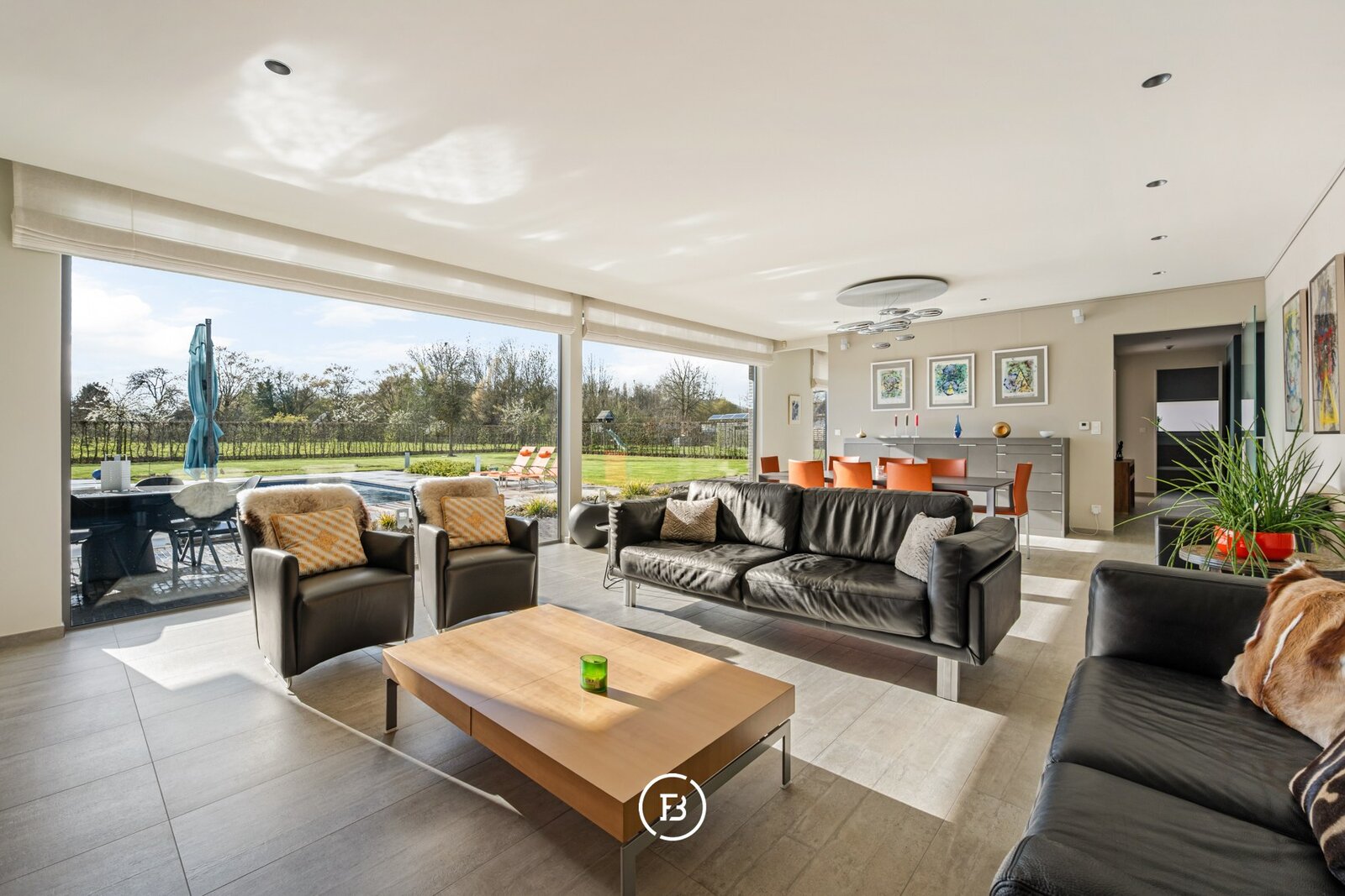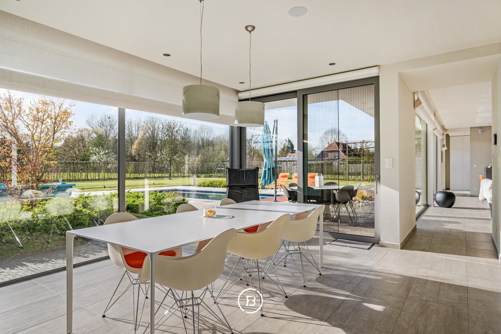 De woning verwelkomt u via een ruime inkomhal met vestiaire en gastentoilet. De leefruimtes zijn bijzonder lichtrijk en worden gekenmerkt door grote raampartijen die zorgen voor een constante connectie met de tuin en het zwembad. De open indeling met zithoek, eetplaats en volledig uitgeruste keuken creëert een aangename en functionele leefomgeving.