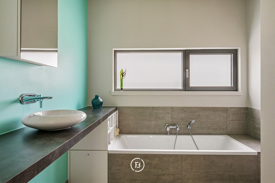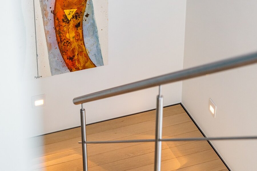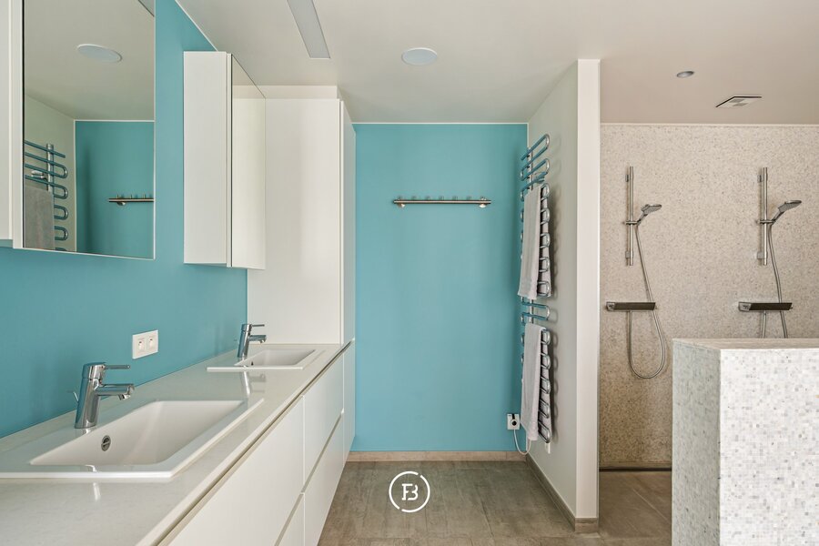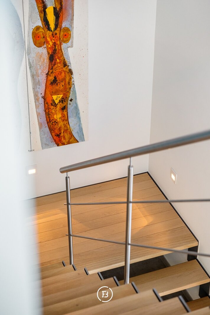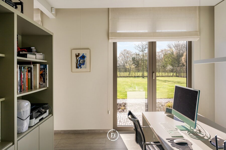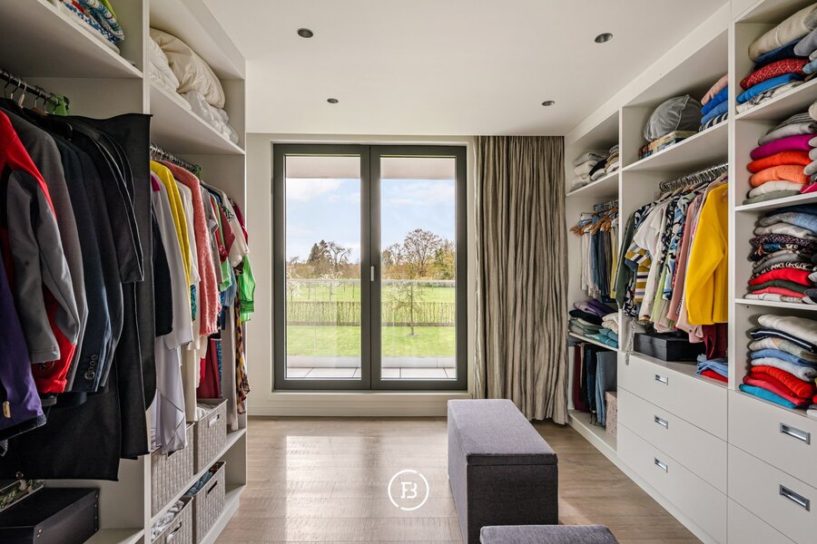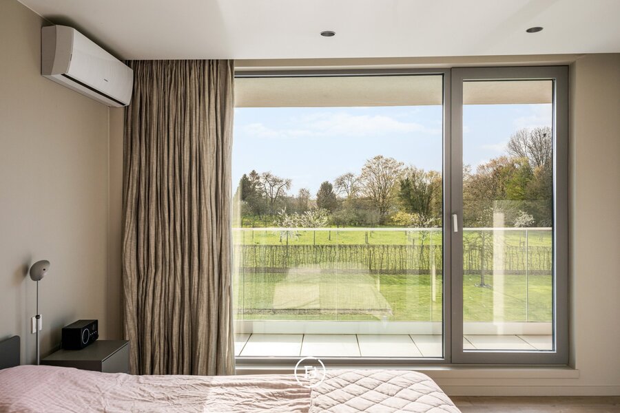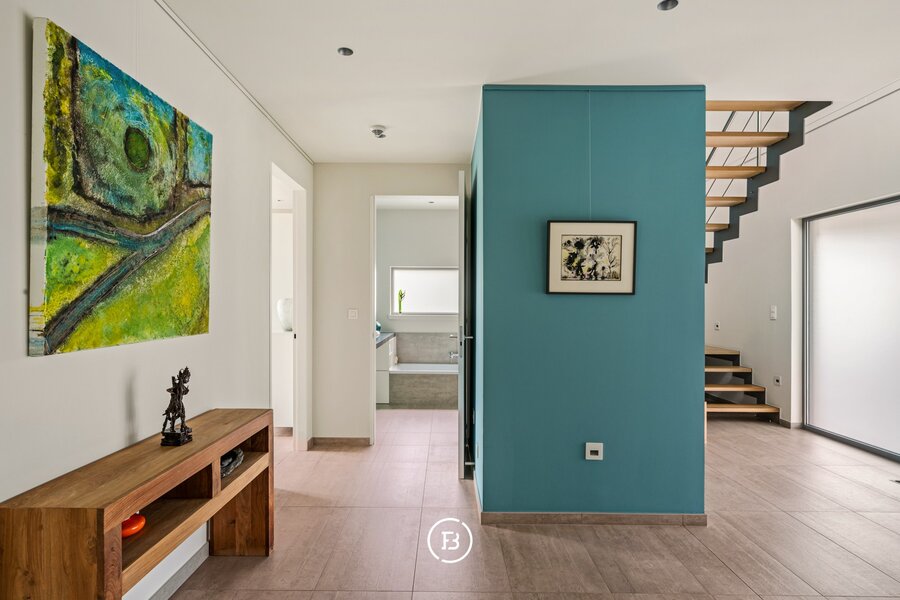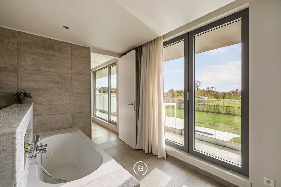 Op het gelijkvloers bevindt zich een slaapkamer met badkamer en directe toegang tot het terras, wat de woning extra flexibel maakt. De verdieping omvat een masterbedroom met dressing en ensuite badkamer met dubbele douche, wastafel en ligbad met verzicht. Aangevuld met een polyvalente ruimte die kan dienen als fitness, bureau of extra slaapkamer.