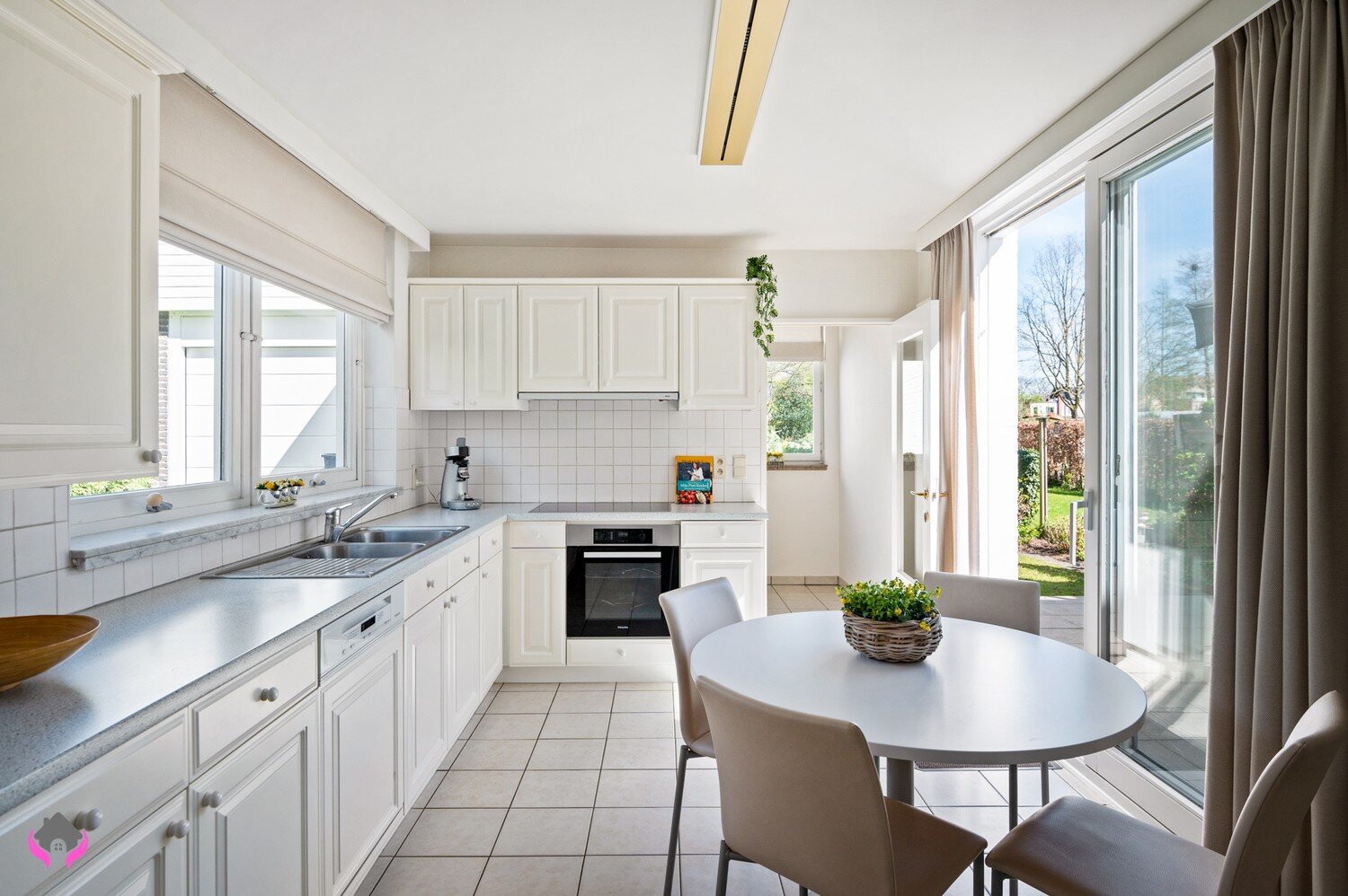 Op het gelijkvloers ervaart u een leuke, natuurlijke doorloop van de leefruimte naar de annexruimte, ideaal als bibliotheek, bureau of speelhoek, en verder naar de keuken. Vanuit zowel de keuken als de leefruimte heeft u toegang tot het windvrije terras,een zalige plek om in alle privacy te ontspannen. Via de zijdeur of de garage met sectionale poort komt u bovendien rechtstreeks aan de keuken uit, bijzonder handig met boodschappen.