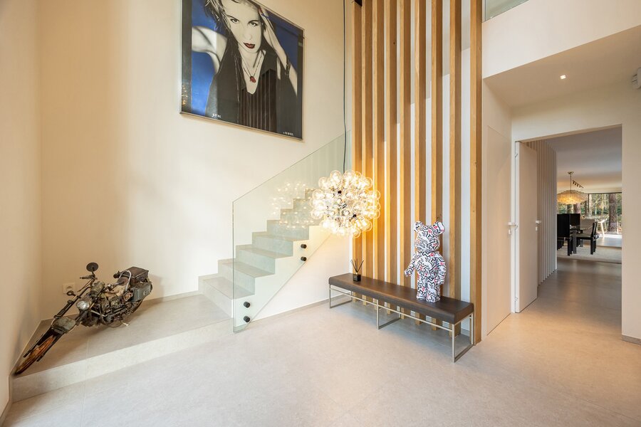 De royale inkomhal van 21 m² met een plafondhoogte van 5,6m, afgewerkt met een stijlvolle tegelvloer beschikt over ingebouwde vestiairekasten en een gastentoilet met handenwasser van het merk “Hotbath”. Een elegante pivoterende deur vormt de perfecte overgang naar de leefruimte en versterkt het architecturale karakter van het geheel.