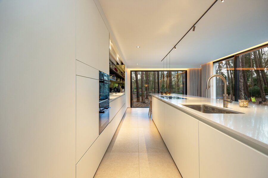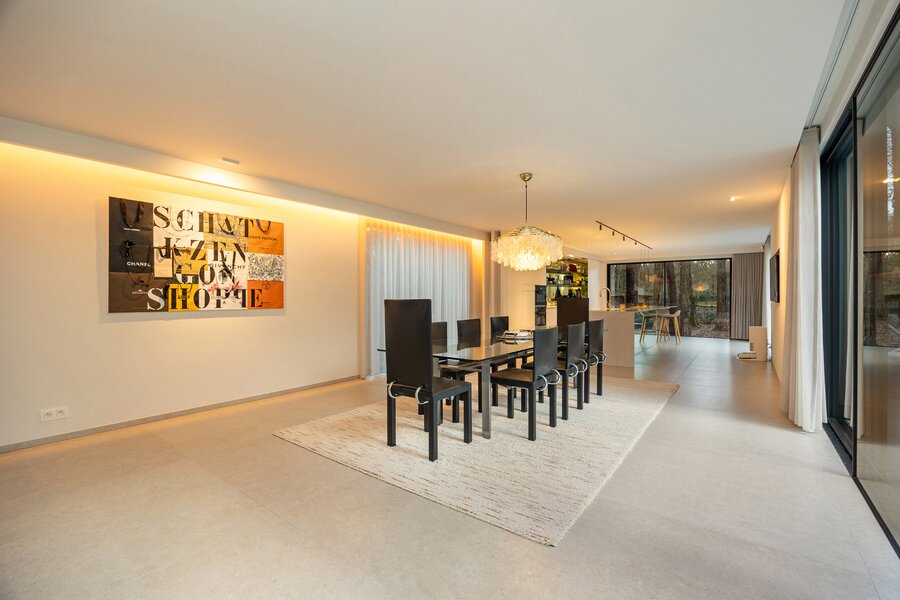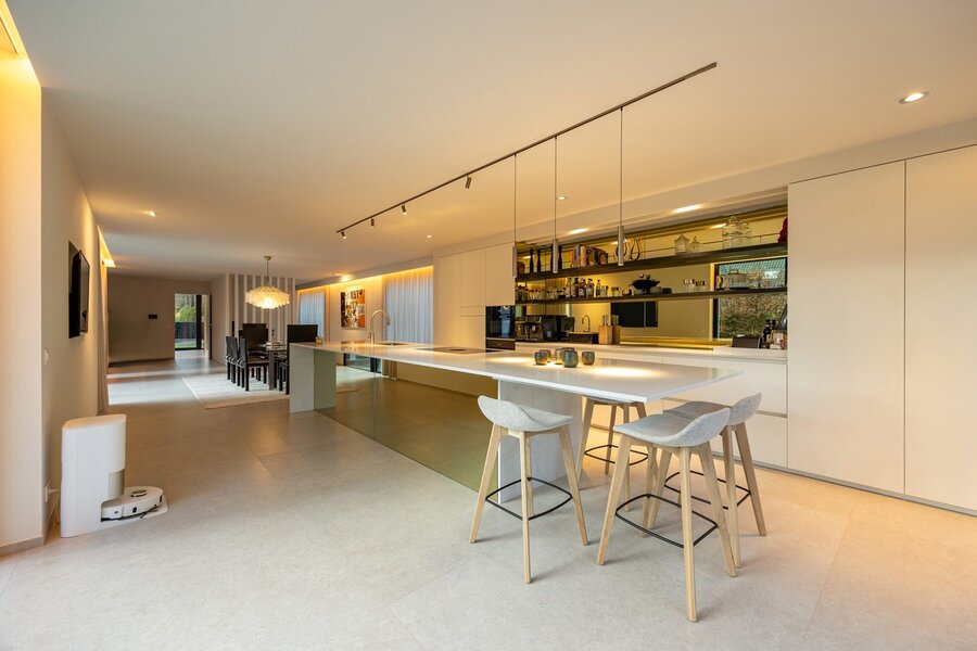 De leef-eetkeuken van maar liefst 82 m² vormt het kloppend hart van de woning. Grote raampartijen zorgen voor een overvloed aan natuurlijk licht en een naadloze connectie met het terras en de tuin. De keuken is een ware blikvanger en werd afgewerkt met een Carrara marmeren werkblad en ingewerkte Champagnekoeler, dat perfect harmonieert met de opstelling van de keuken. Het centrale kookeiland, beschikt over een geïntegreerde Bora inductiekookplaat en dampkap, een vaatwasser op hoogte, een heteluchtoven, microgolfoven, een Quooker-kraan in full option uitvoering en Miele toestellen, waaronder een koelkast en diepvriezer met ice maker. Aansluitend bevindt zich een ruime eetkamer die uitkijkt op de tuin, waardoor koken en tafelen hier een echte beleving wordt.