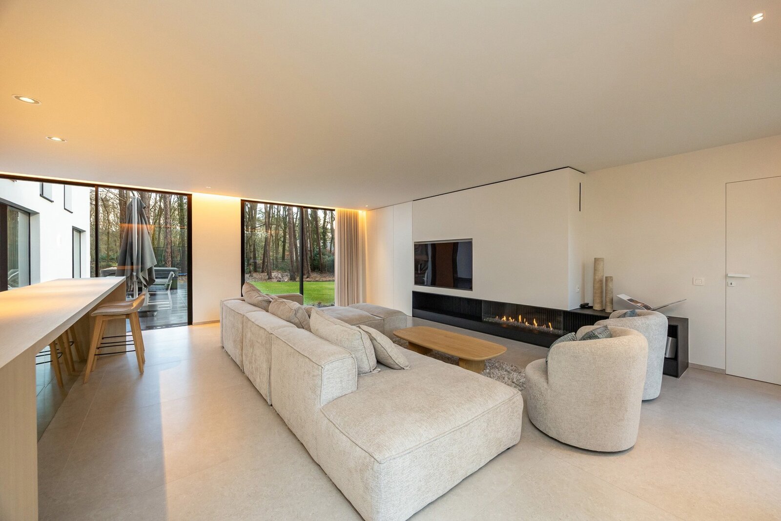 De woonkamer van 57 m², afgewerkt met tegelvloer, creëert een aparte ontspanningsruimte en is voorzien van een stijlvolle gashaard met dubbele warmterecuperatie, moderne bar en maatwerkkasten.