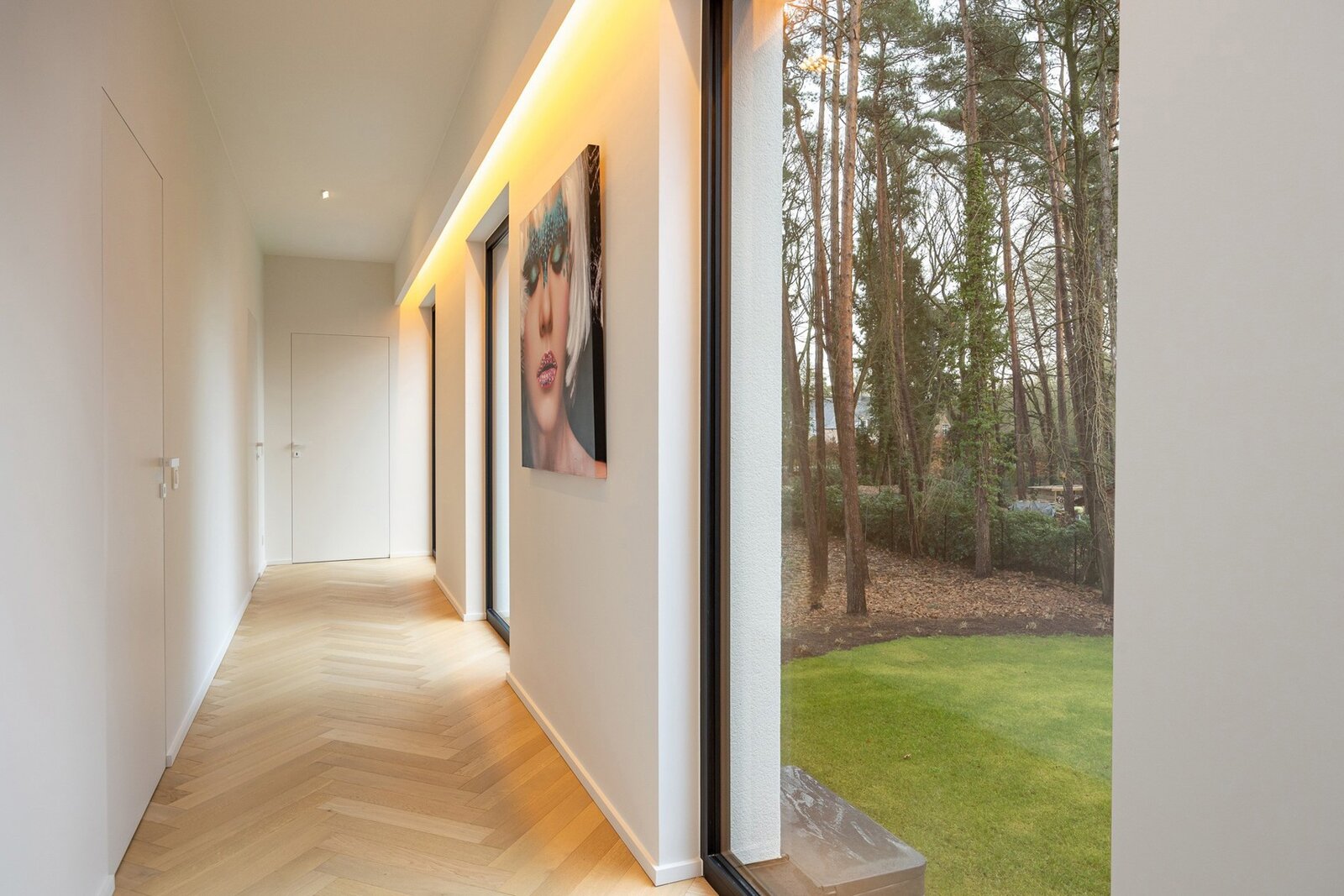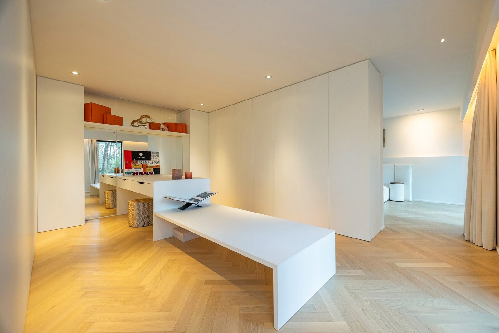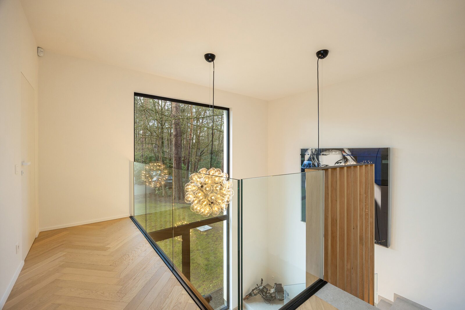 Op de eerste verdieping komt u terecht op een bijzonder ruime overloop van 30 m², afgewerkt met elegant visgraatparket, dat de verdieping een warme en luxueuze uitstraling geeft. De wasplaats van 7 m² is praktisch ingericht met aansluitingen voor wasmachine en droogkast.