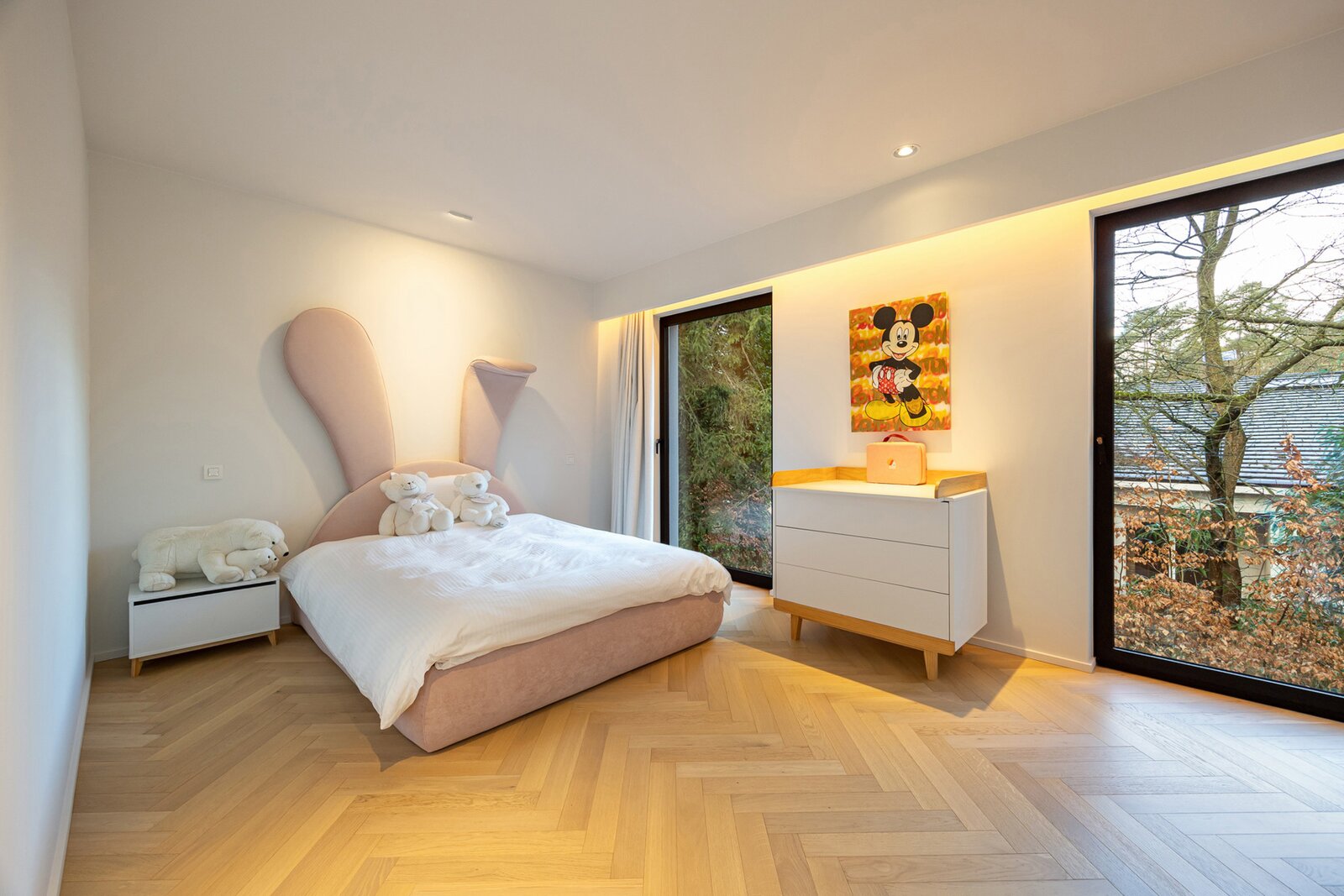 Verder beschikt het gelijkvloers over een home office van 10 m² met ingemaakte kasten, ideaal als thuiswerkplek. Daarnaast is er nog een van speelkamer van 20 m², die eveneens kan dienst doen als bureauruimte.